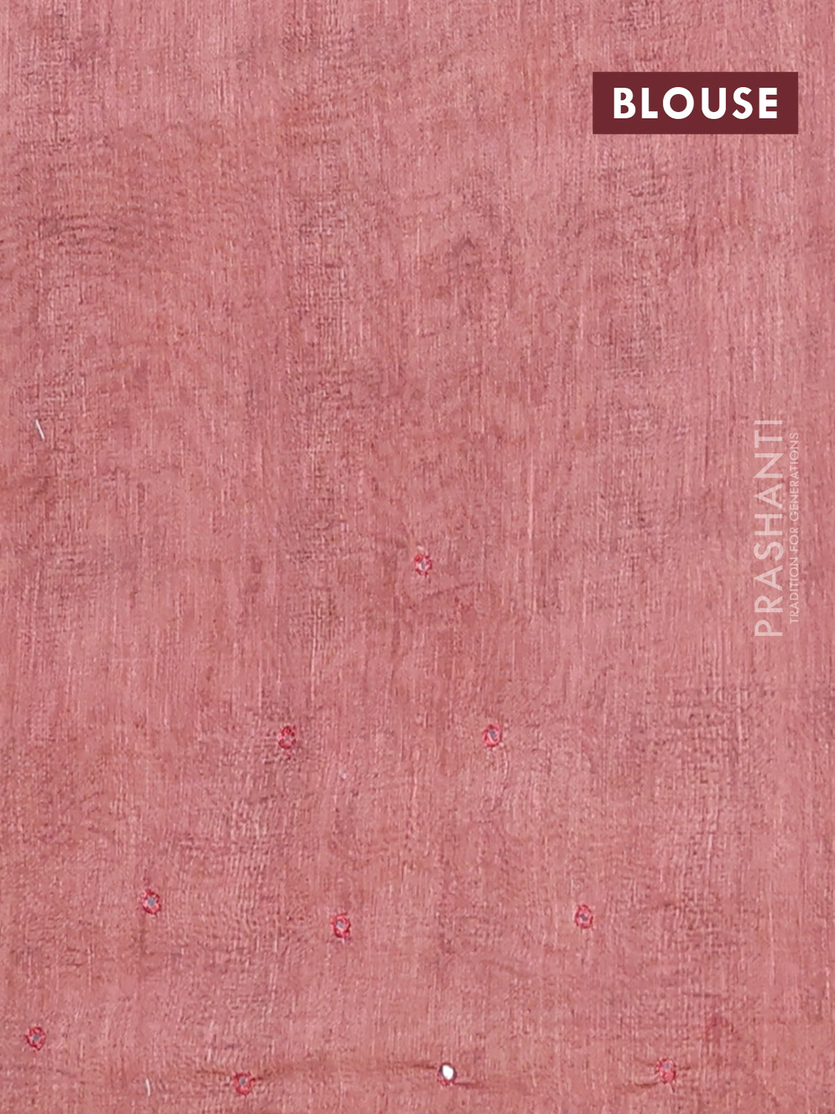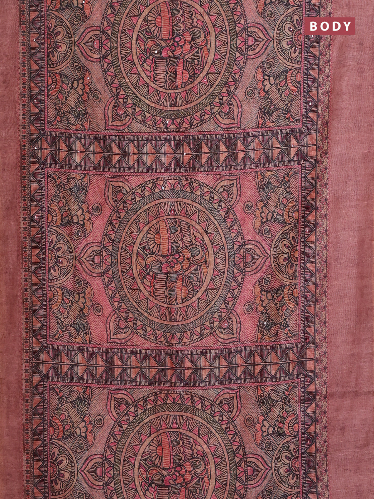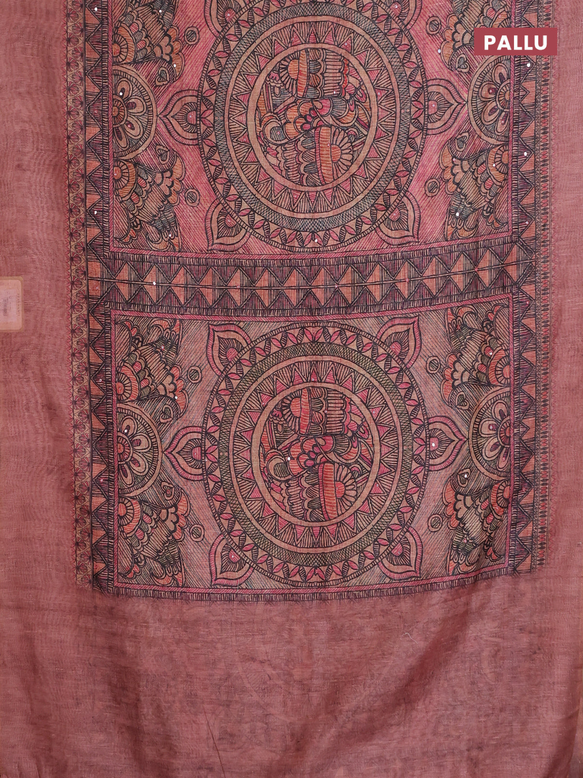 Semi linen saree peach shade with allover madhubani prints & mirror work