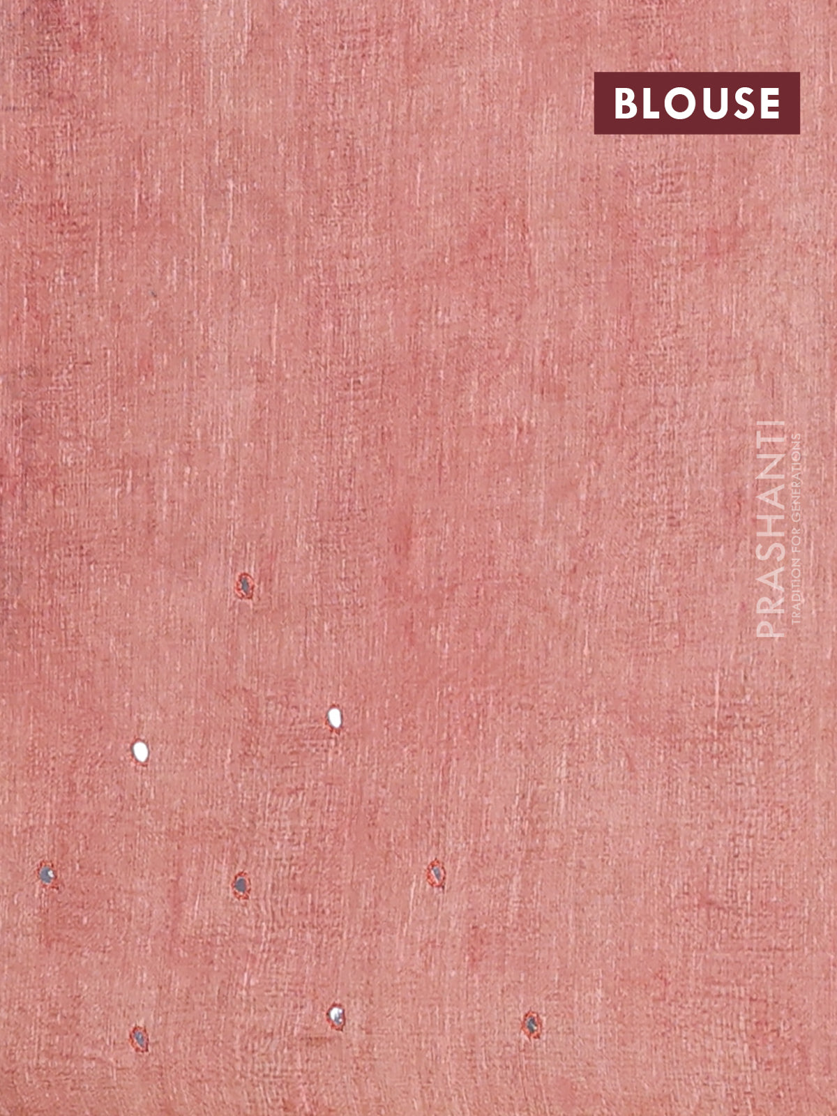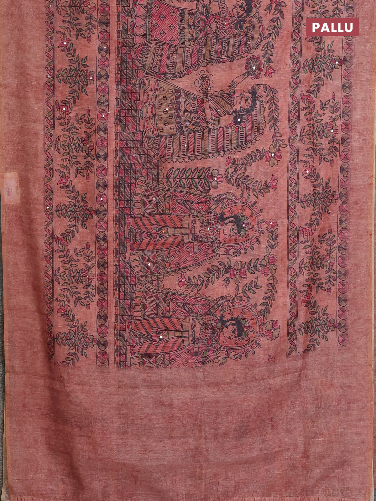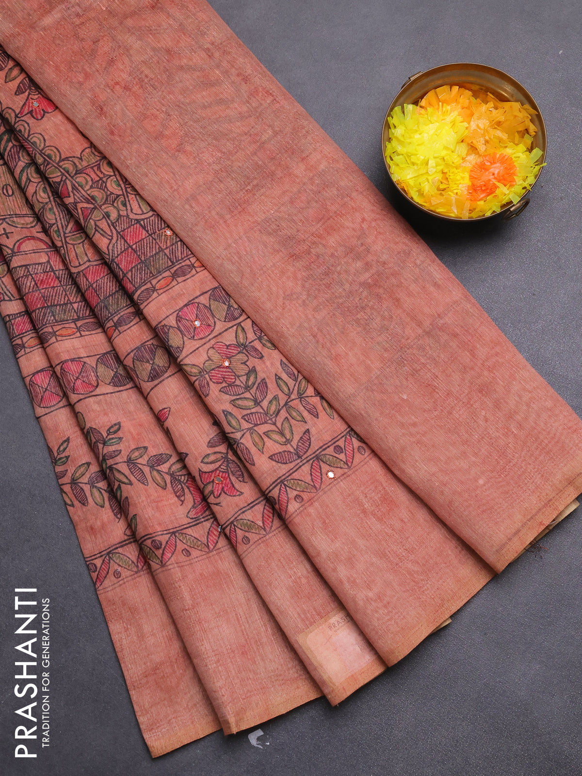 Semi linen saree peach shade with allover madhubani prints & mirror work