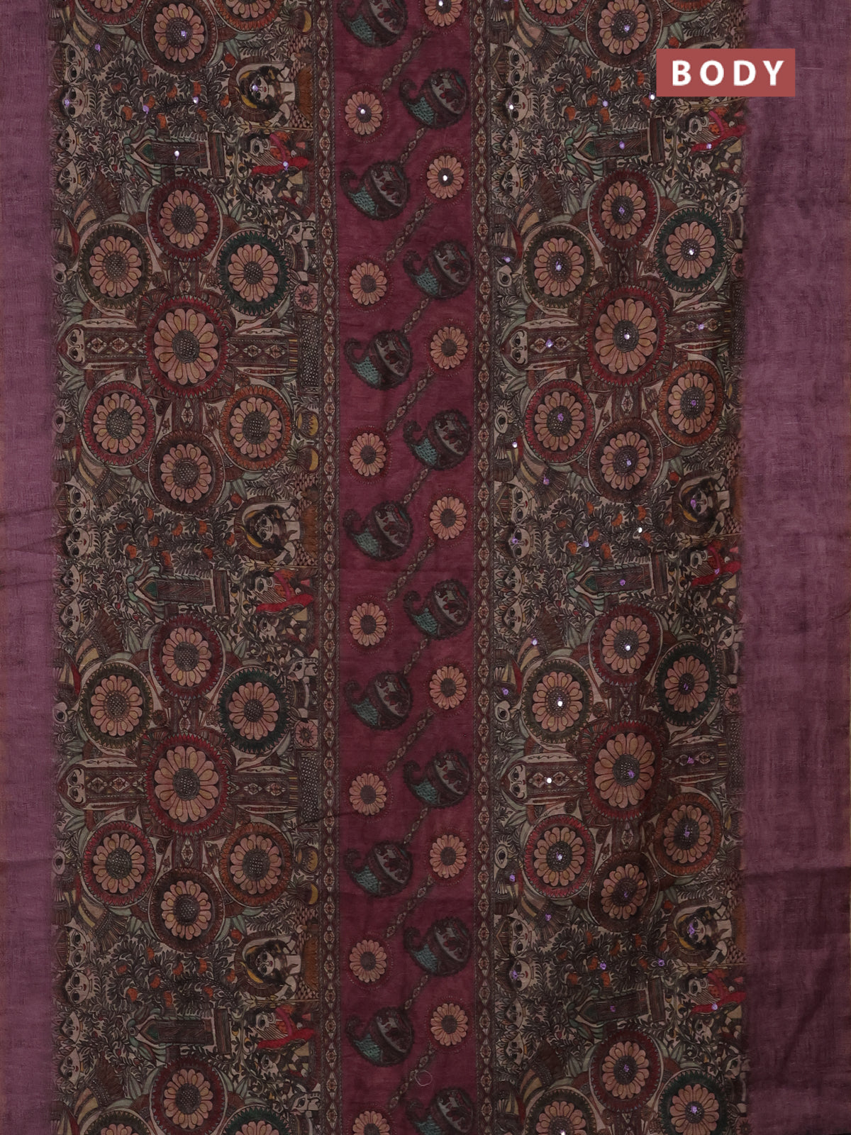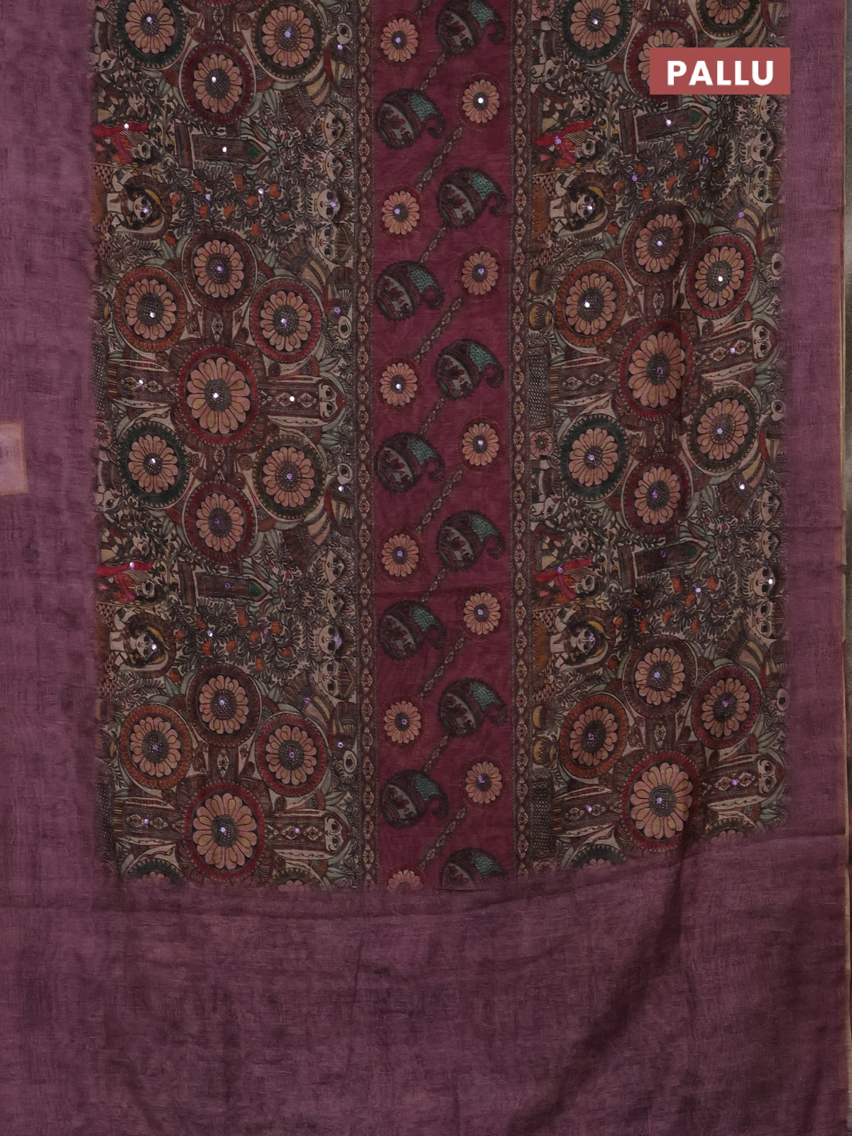 Semi linen saree purple shade with allover madhubani prints & mirror work
