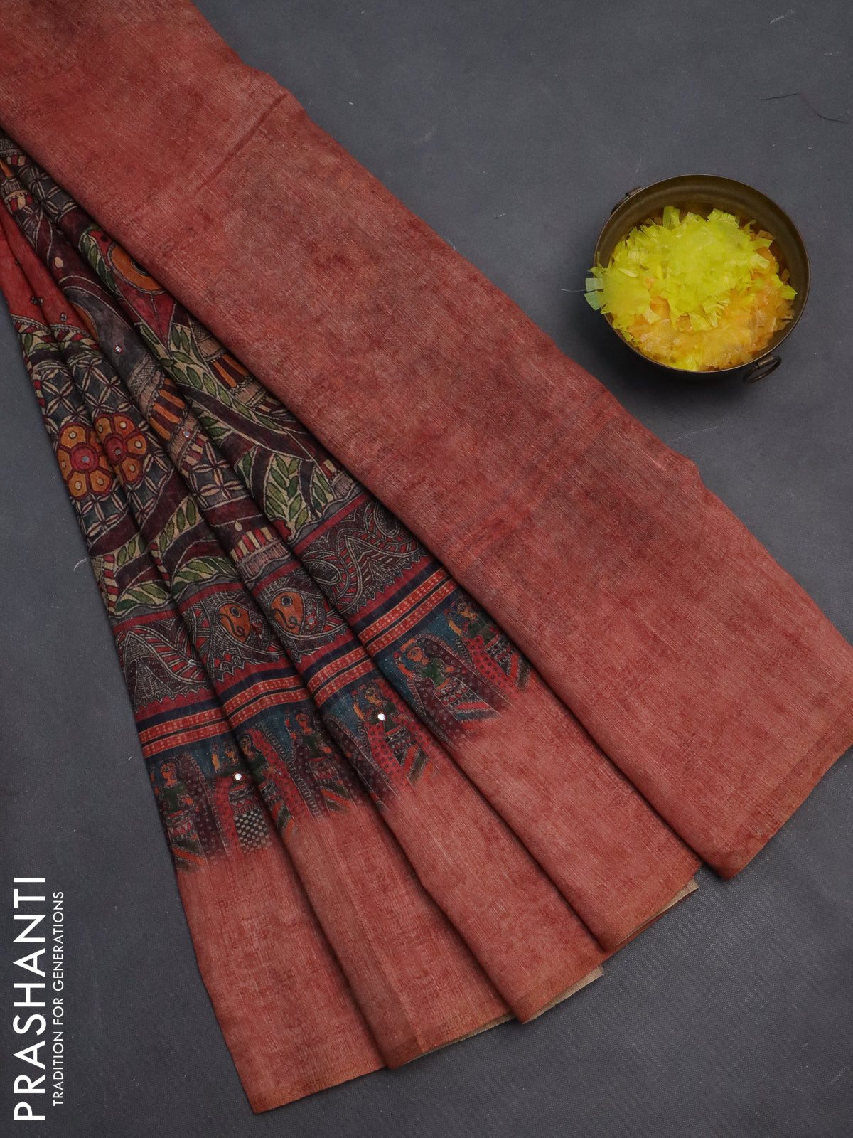 Semi linen saree red shade with allover madhubani prints & mirror work