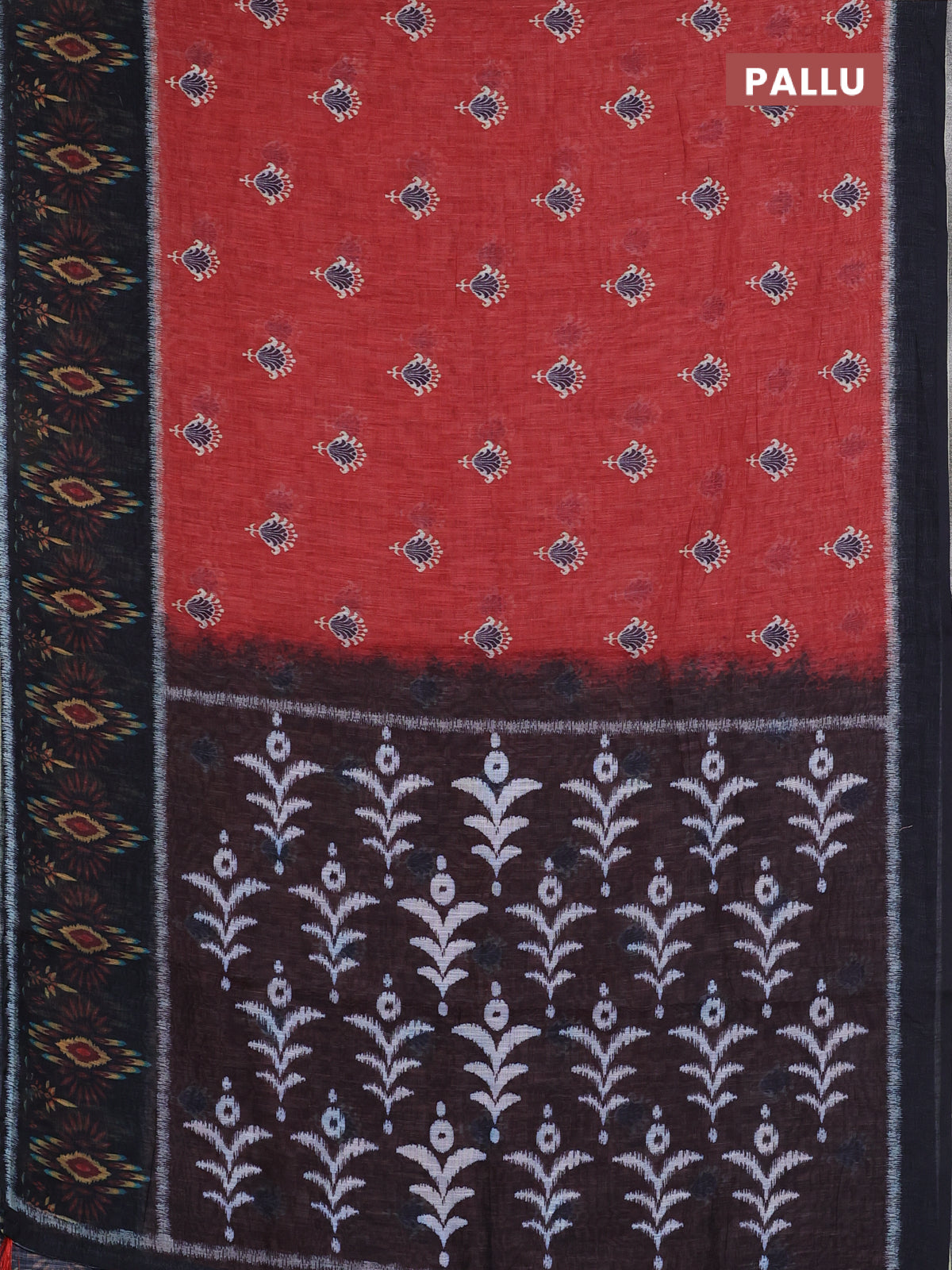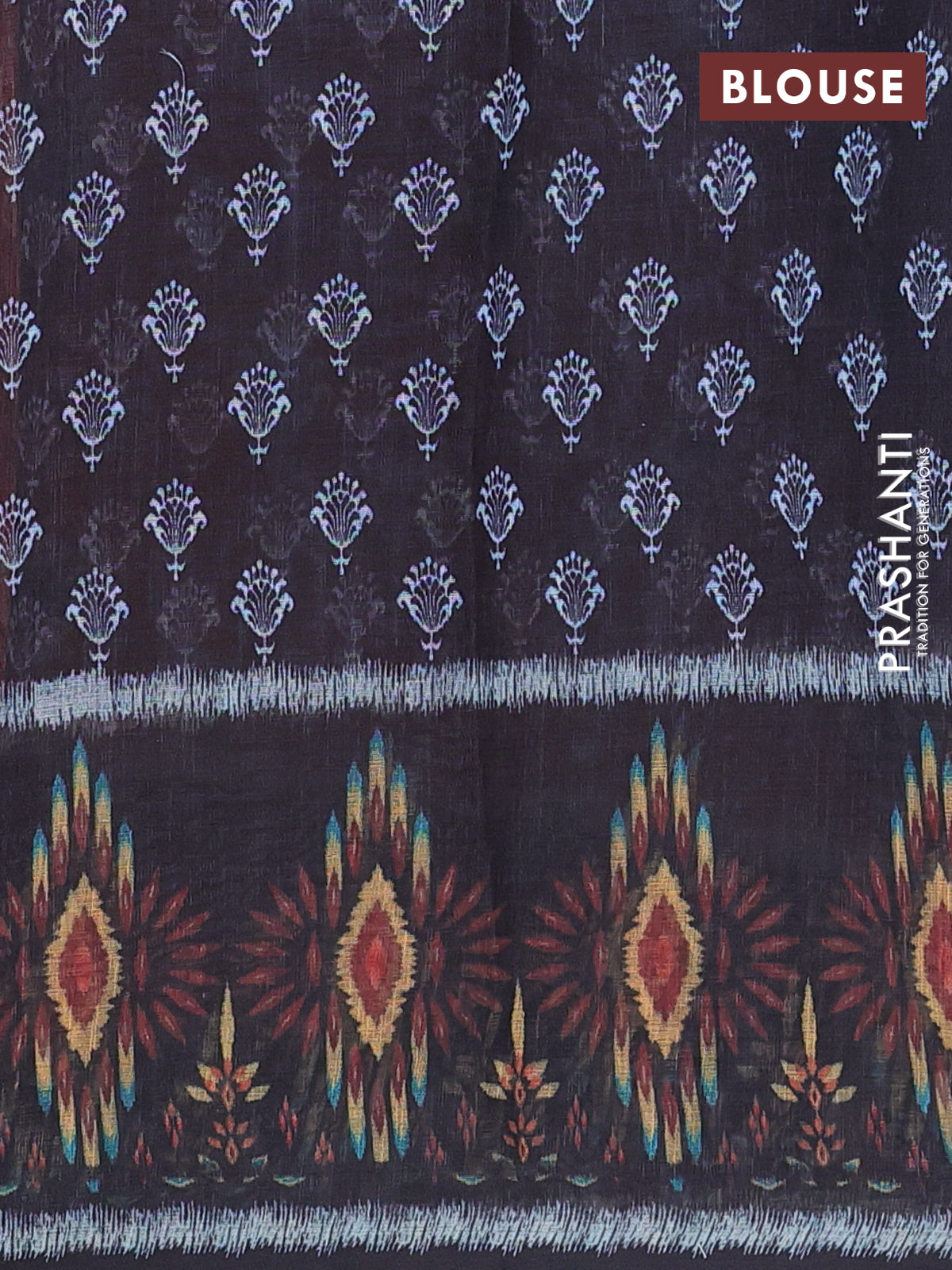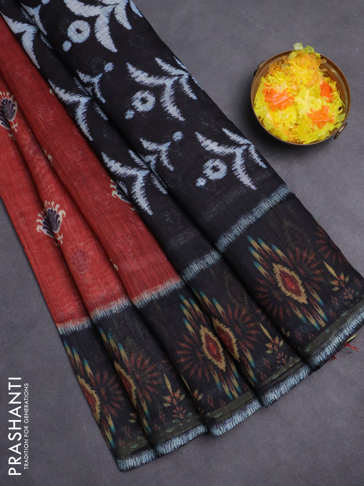 Semi linen saree rustic maroon and black with allover ikat butta prints and long printed border