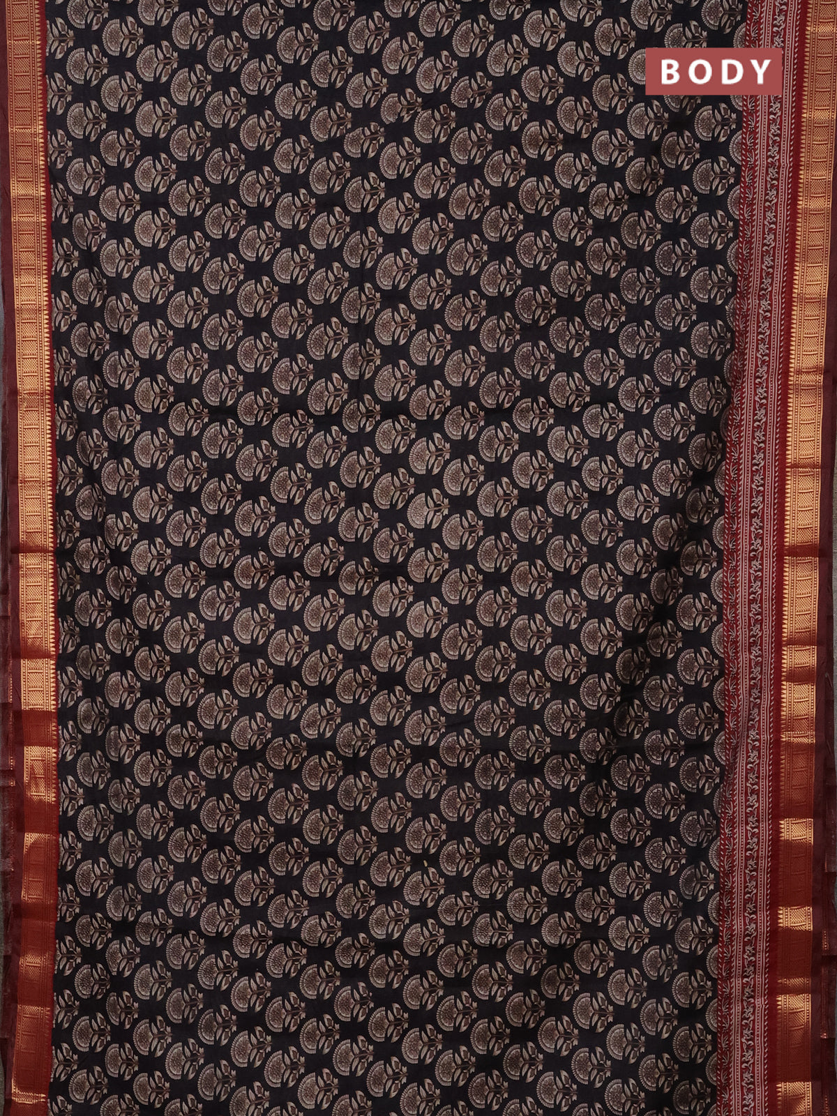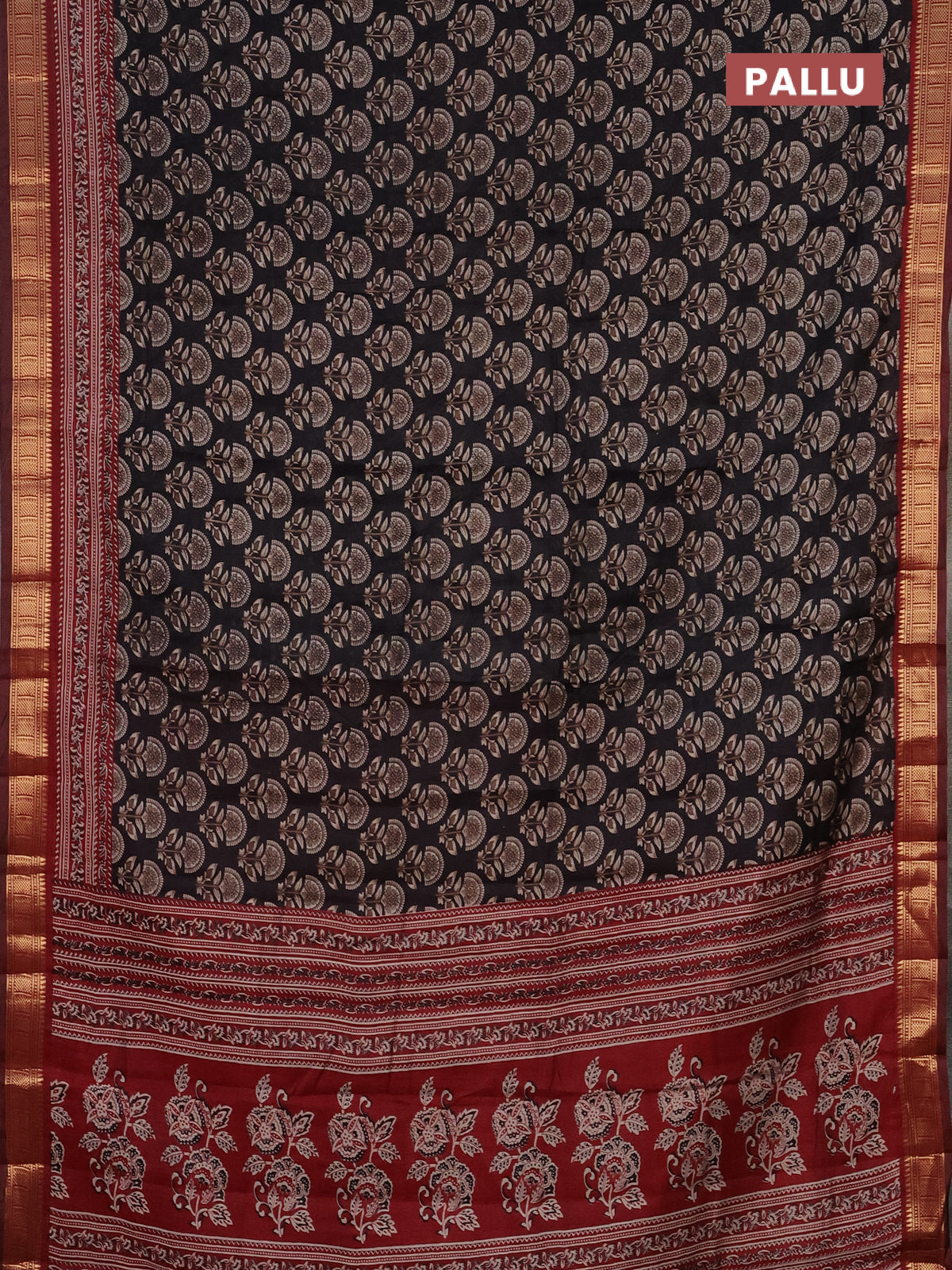 Semi maheshwari cotton saree black and maroon with allover butta prints and zari woven border