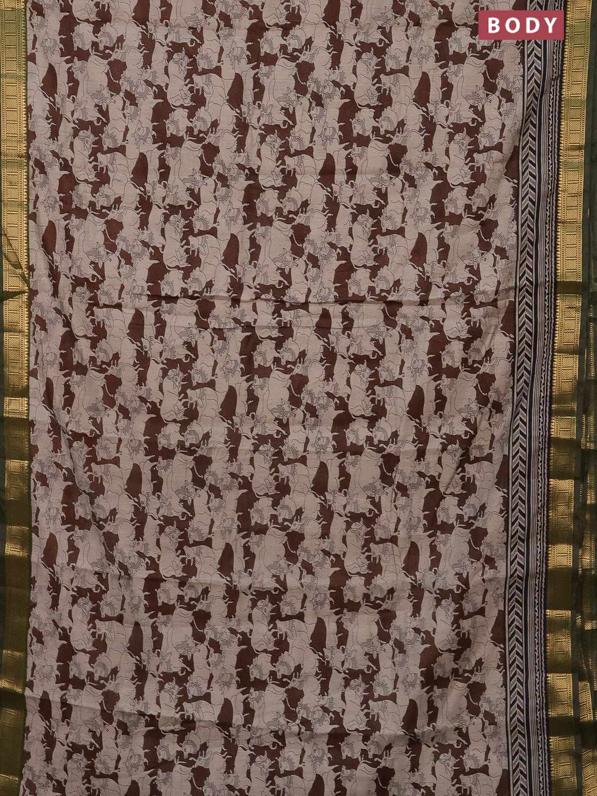 Semi maheshwari cotton saree coffee brown and sap green with allover pichwai prints and zari woven border