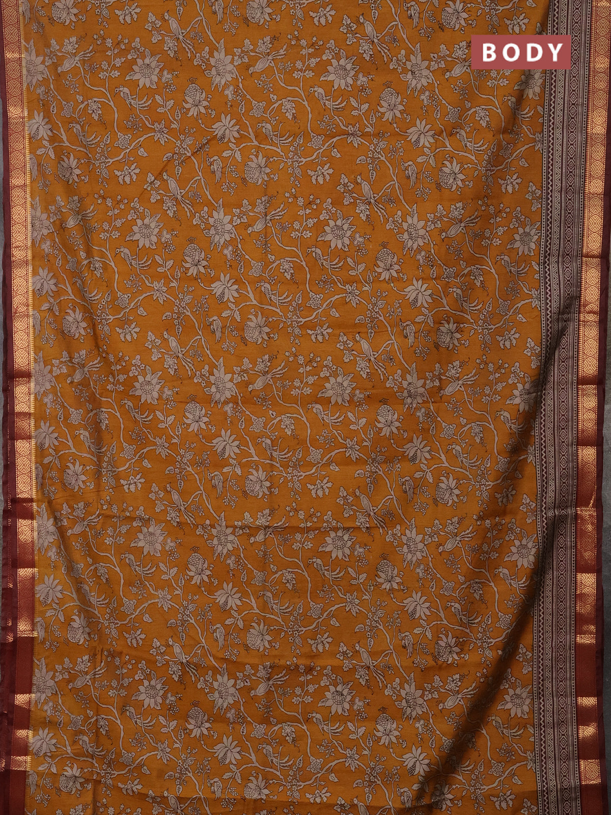 Semi maheshwari cotton saree dark mustard and maroon with allover kalamkari prints and zari woven border