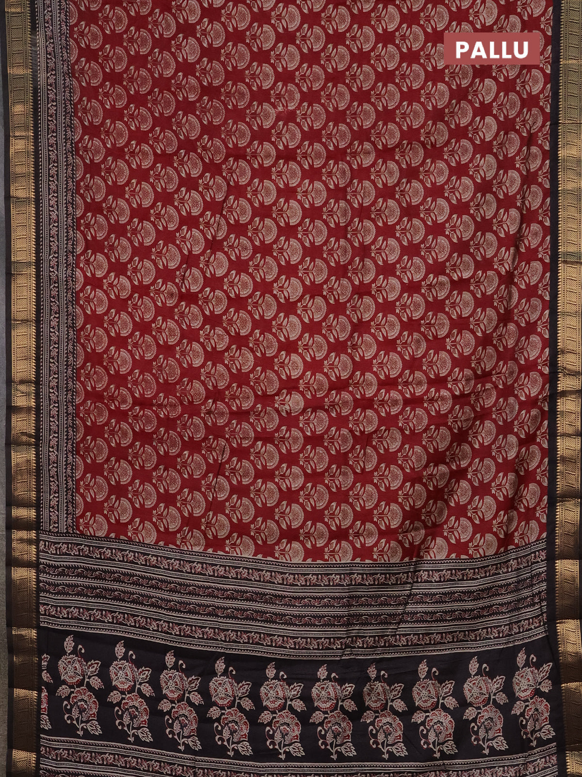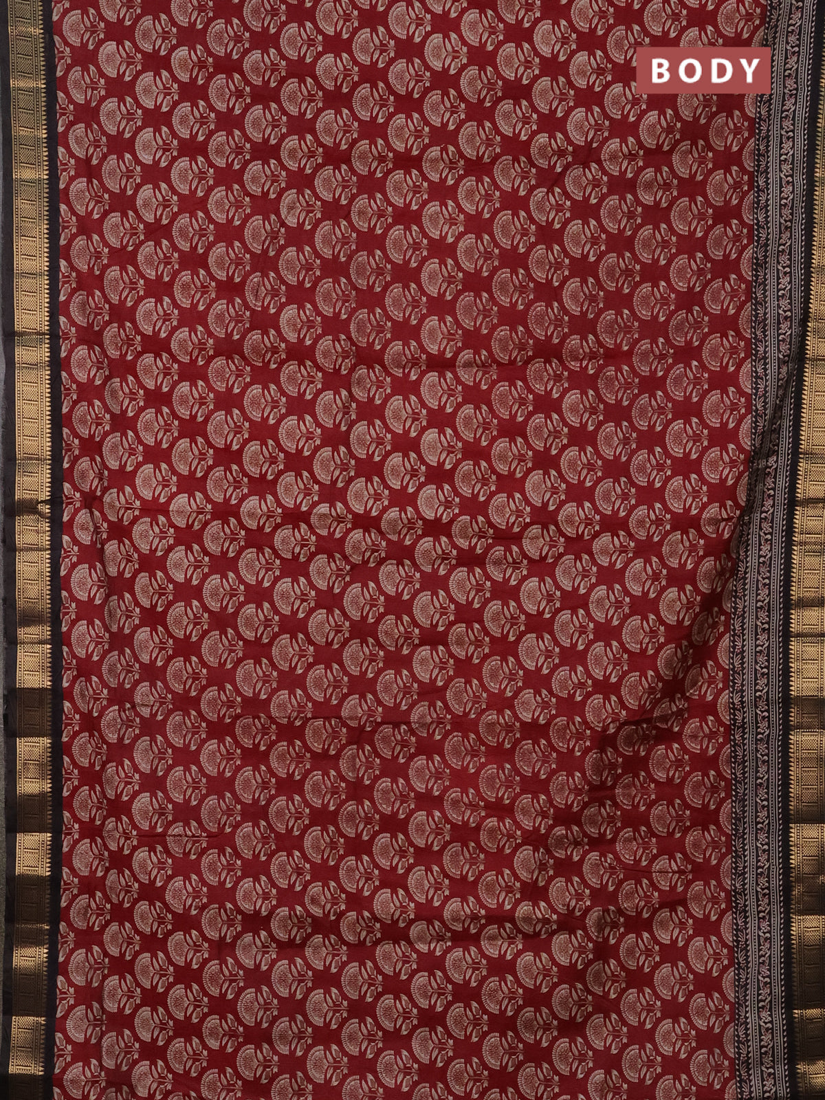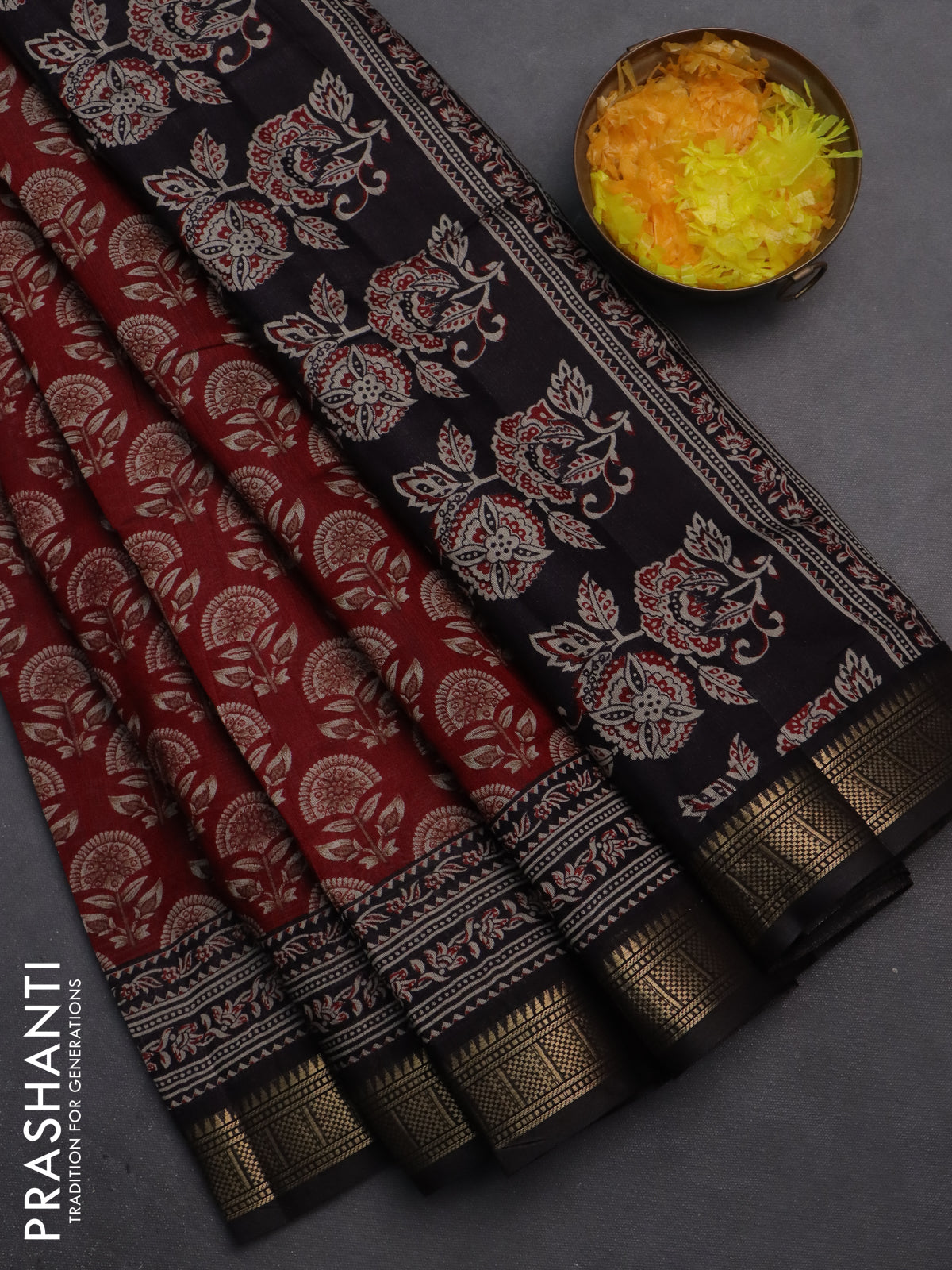 Semi maheshwari cotton saree maroon and black with allover butta prints and zari woven border