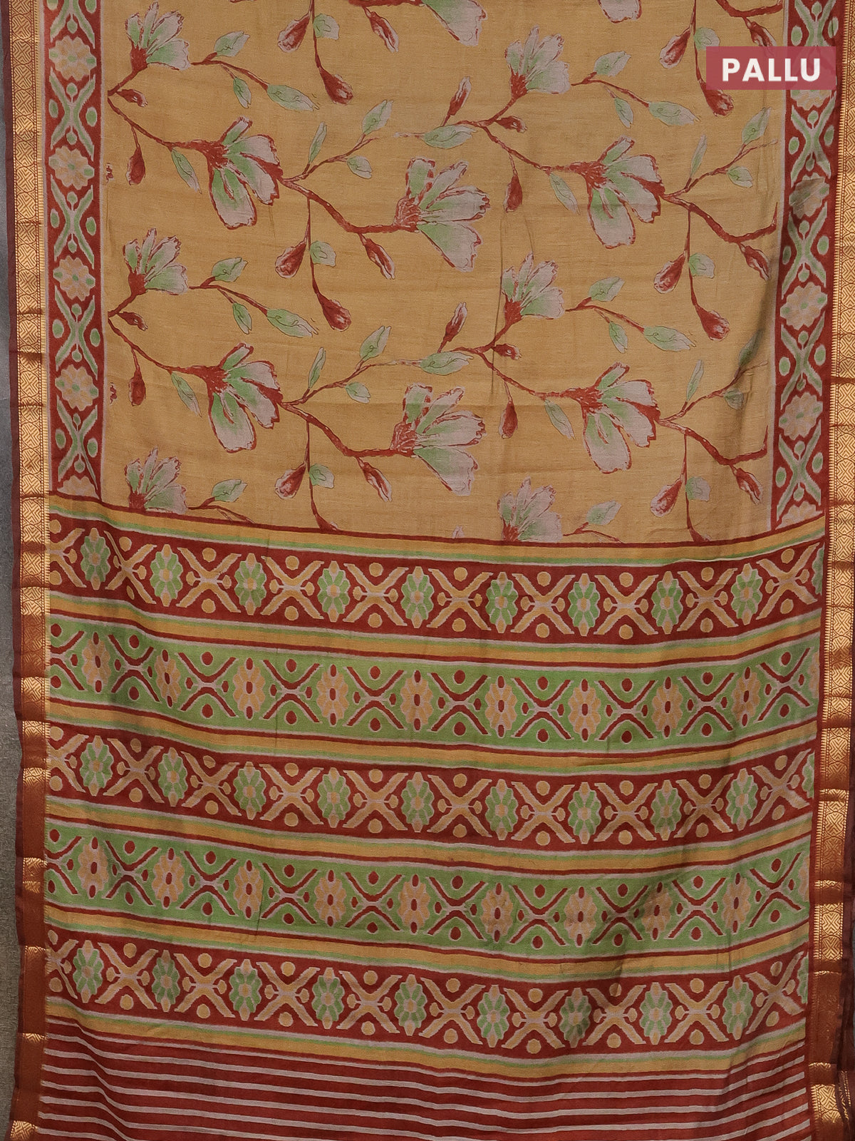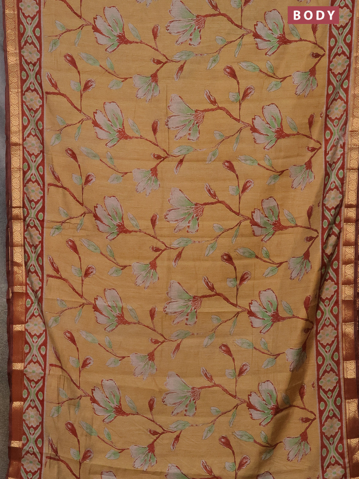 Semi maheshwari cotton saree sandal and maroon with allover floral prints and zari woven border