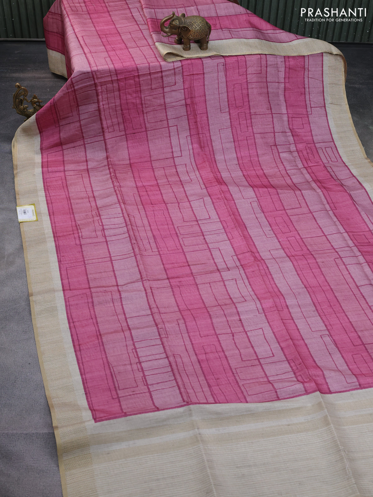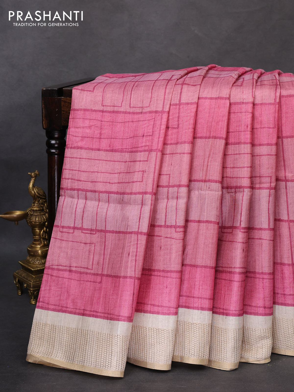 Semi matka saree pink and beige with allover geometric prints and zari woven border