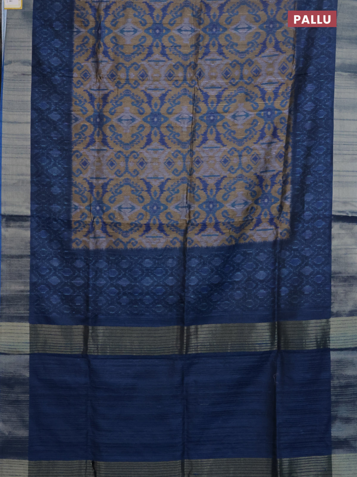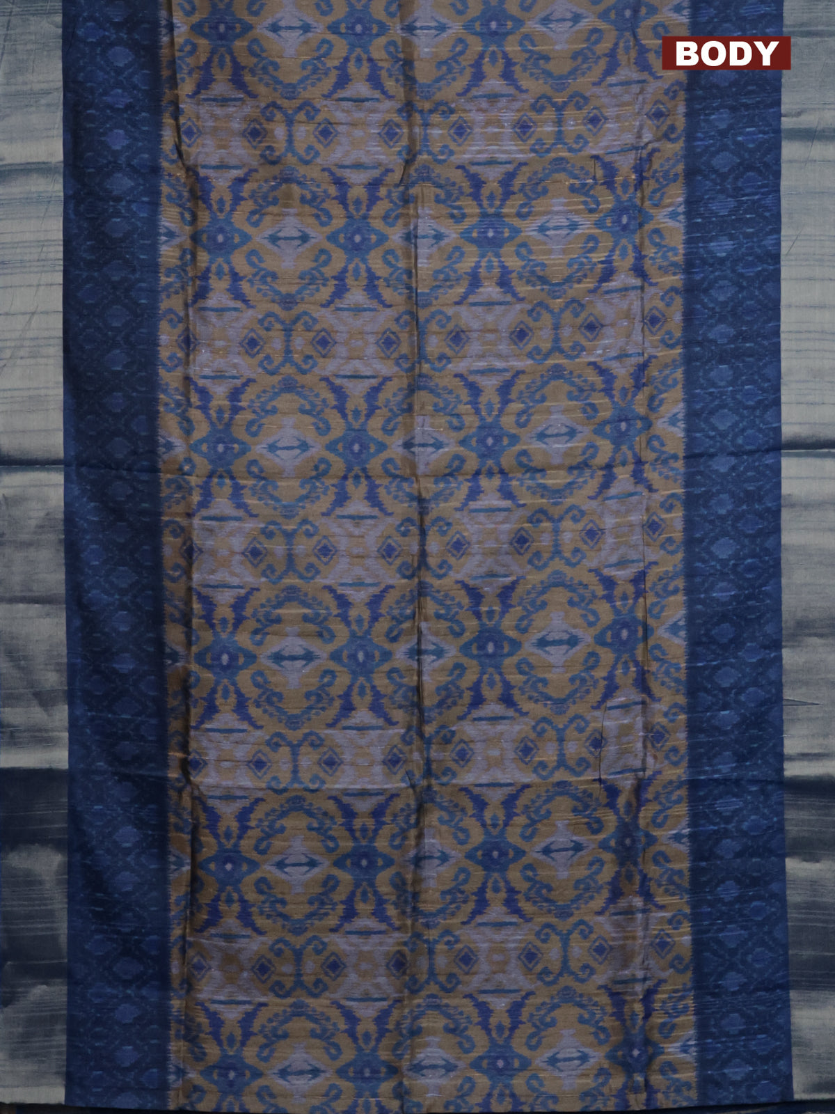 Semi matka saree sandal and blue with allover ikat prints and zari woven border