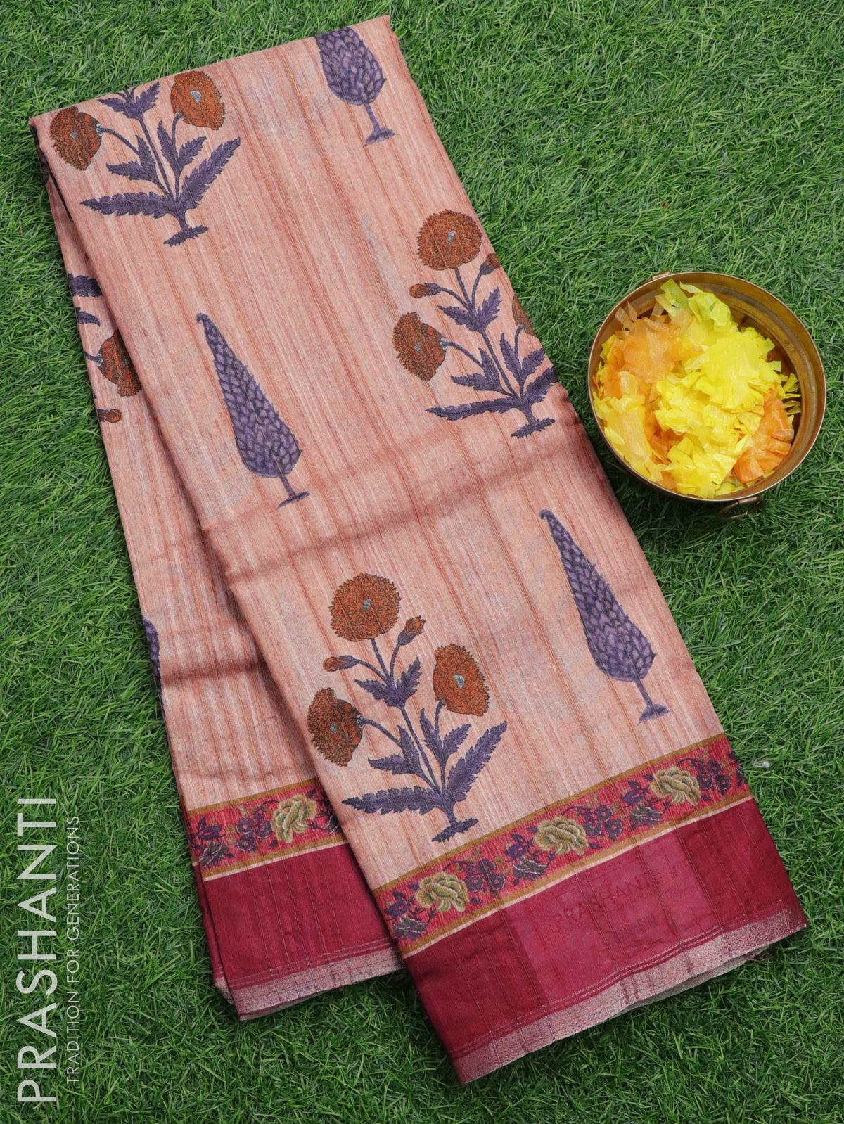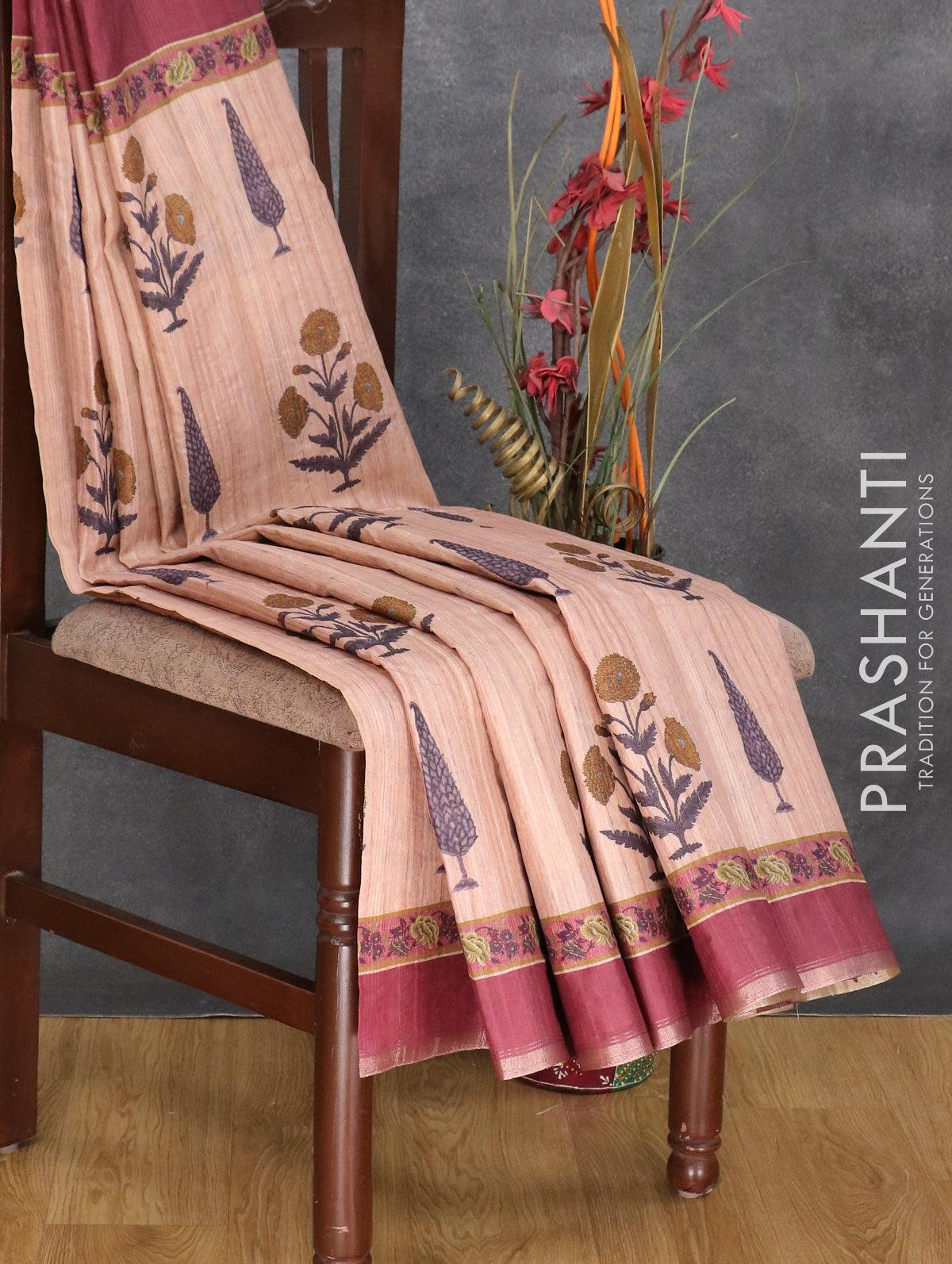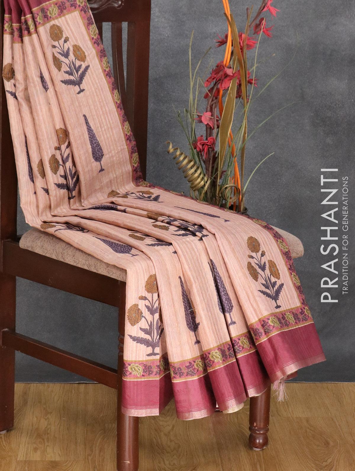 Semi matka silk saree pastel pink and magenta pink with allover floral butta prints and small zari woven border