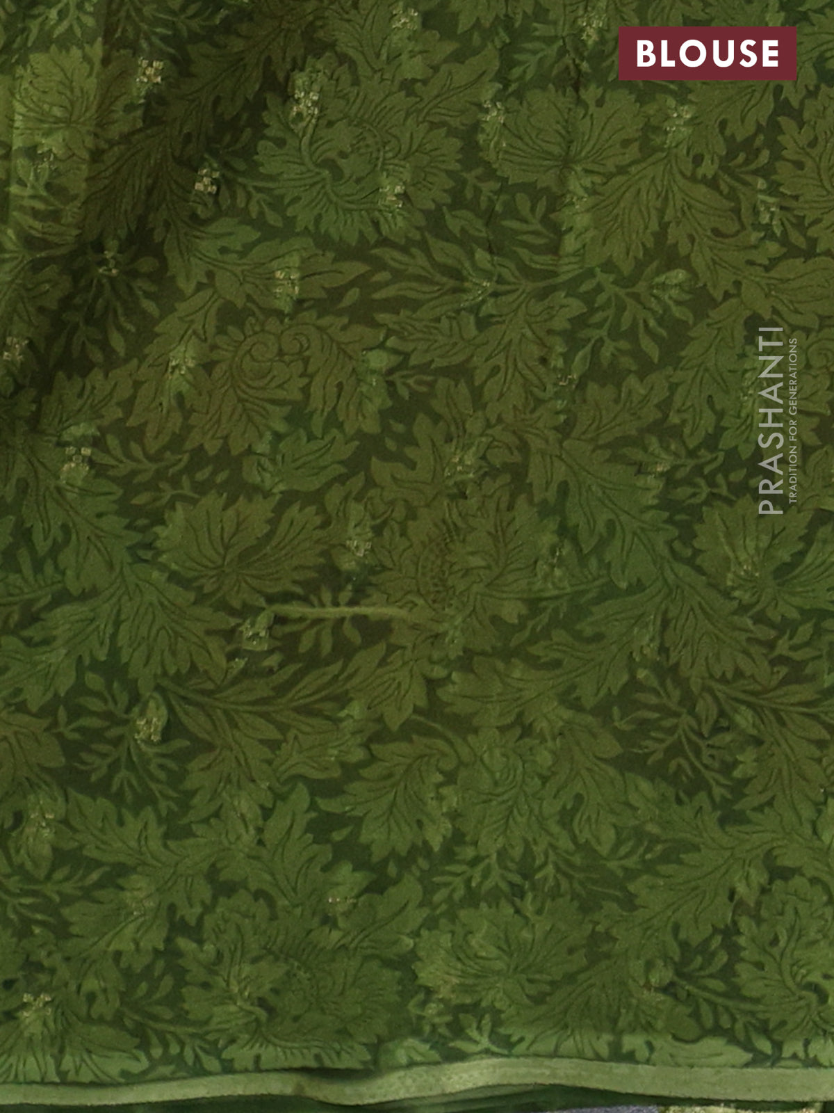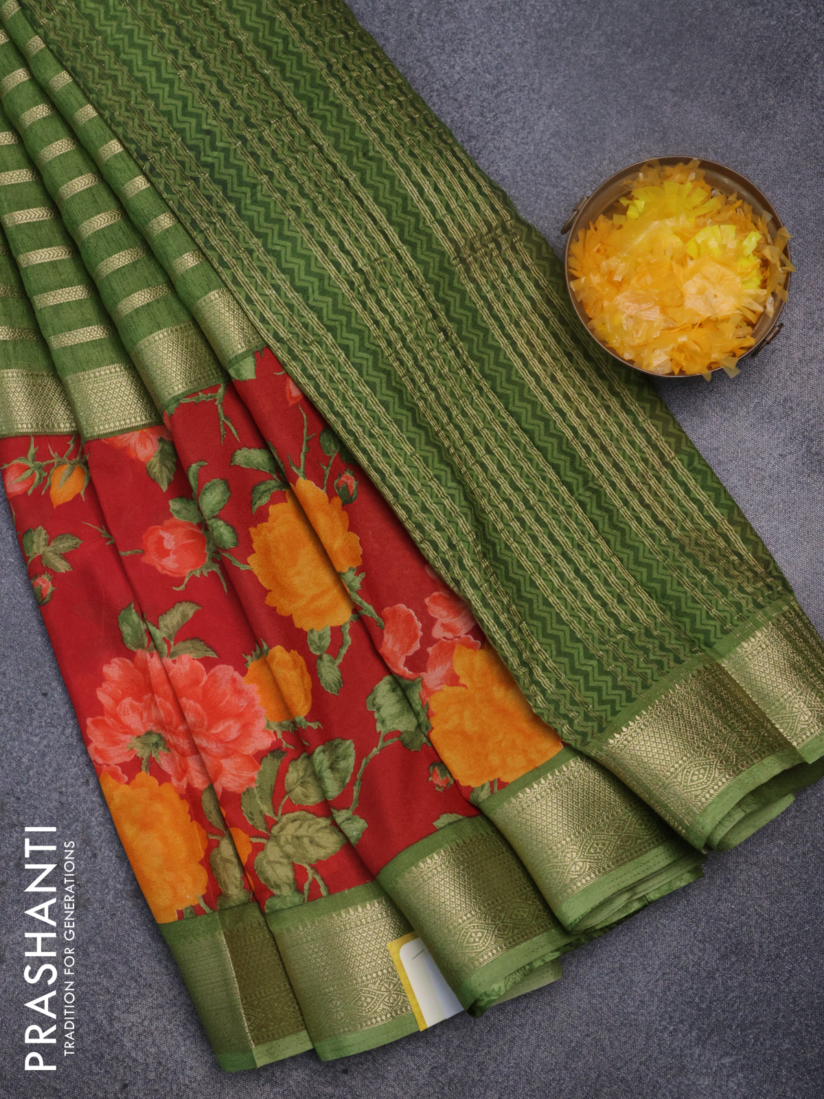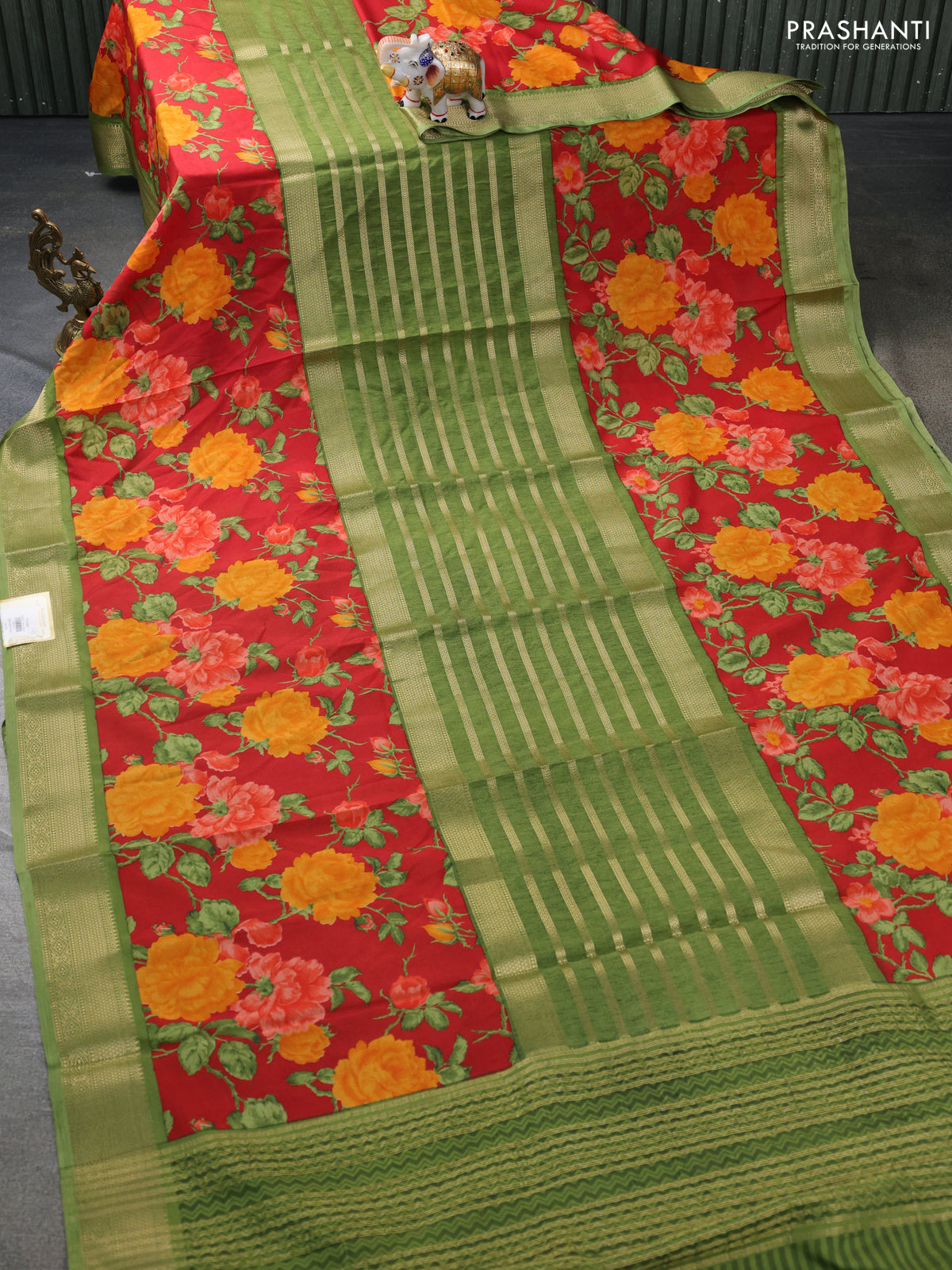 Semi mysore crepe saree green and red with zari weaves and long printed border