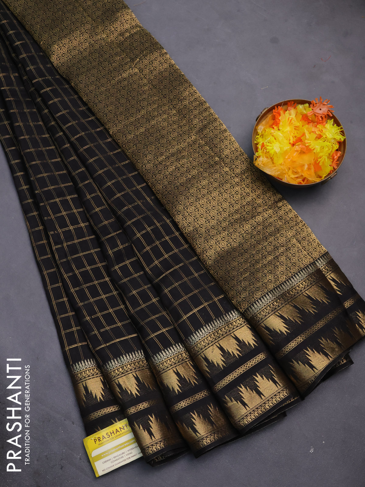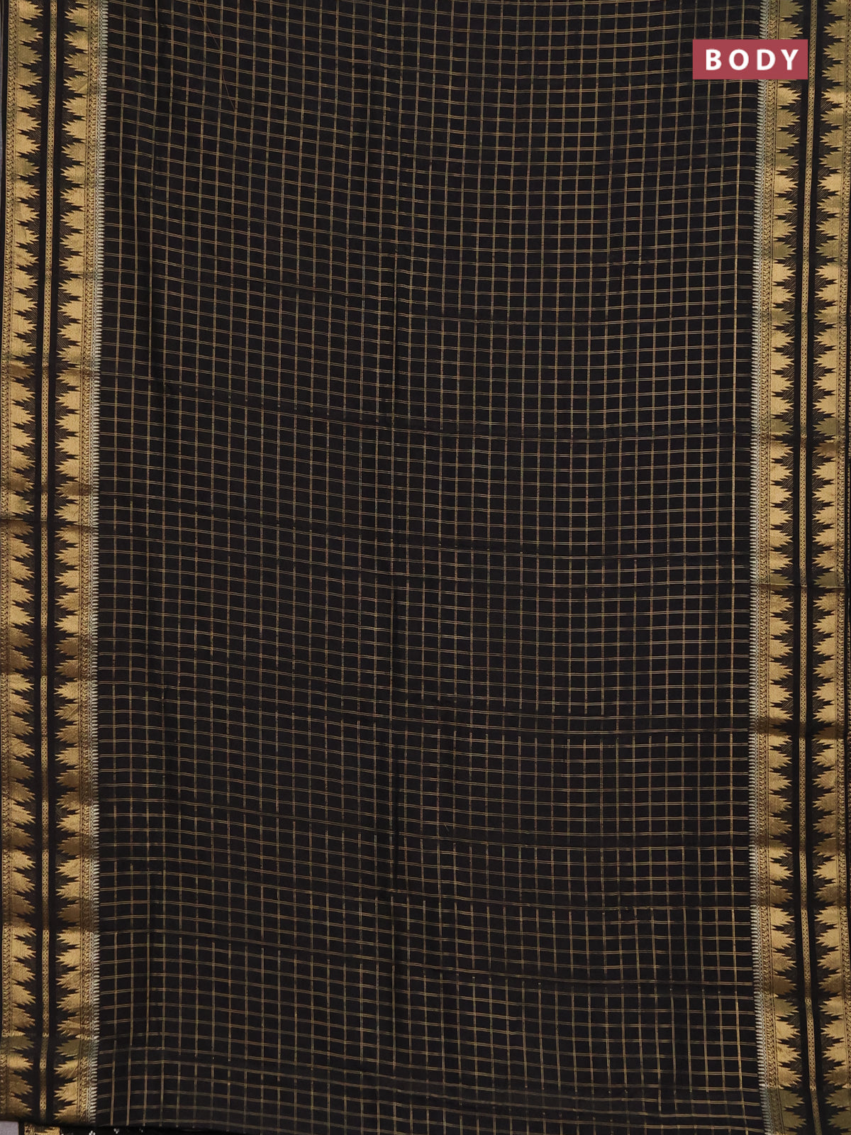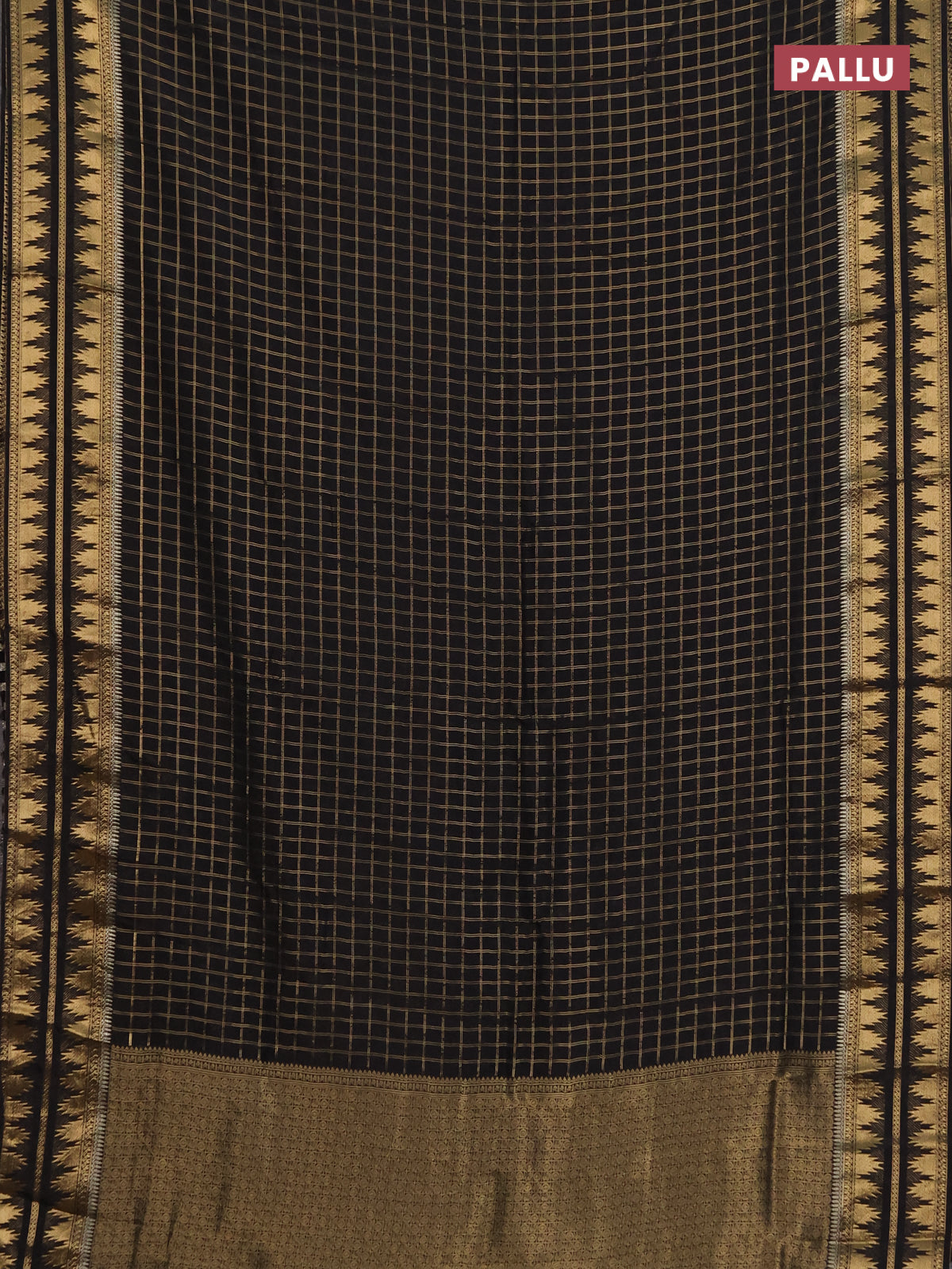 Semi mysore silk saree black with allover zari checked pattern and temple design zari woven border