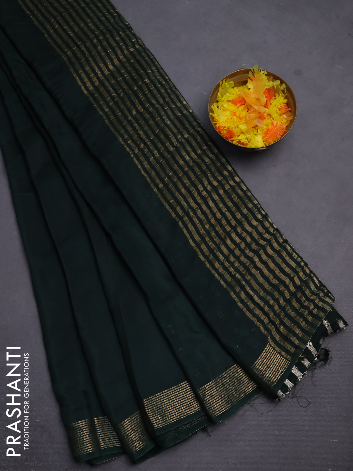 Semi mysore silk saree bottle green with plain body and zari woven border