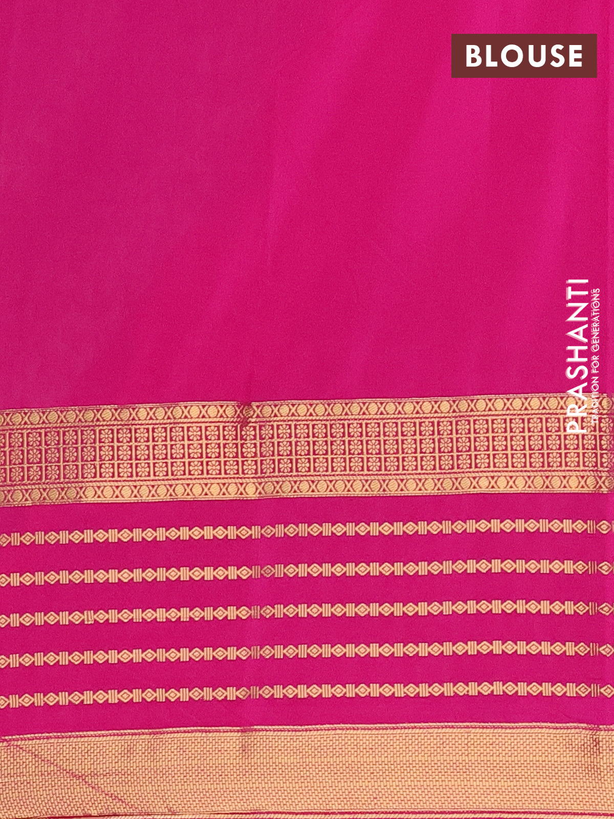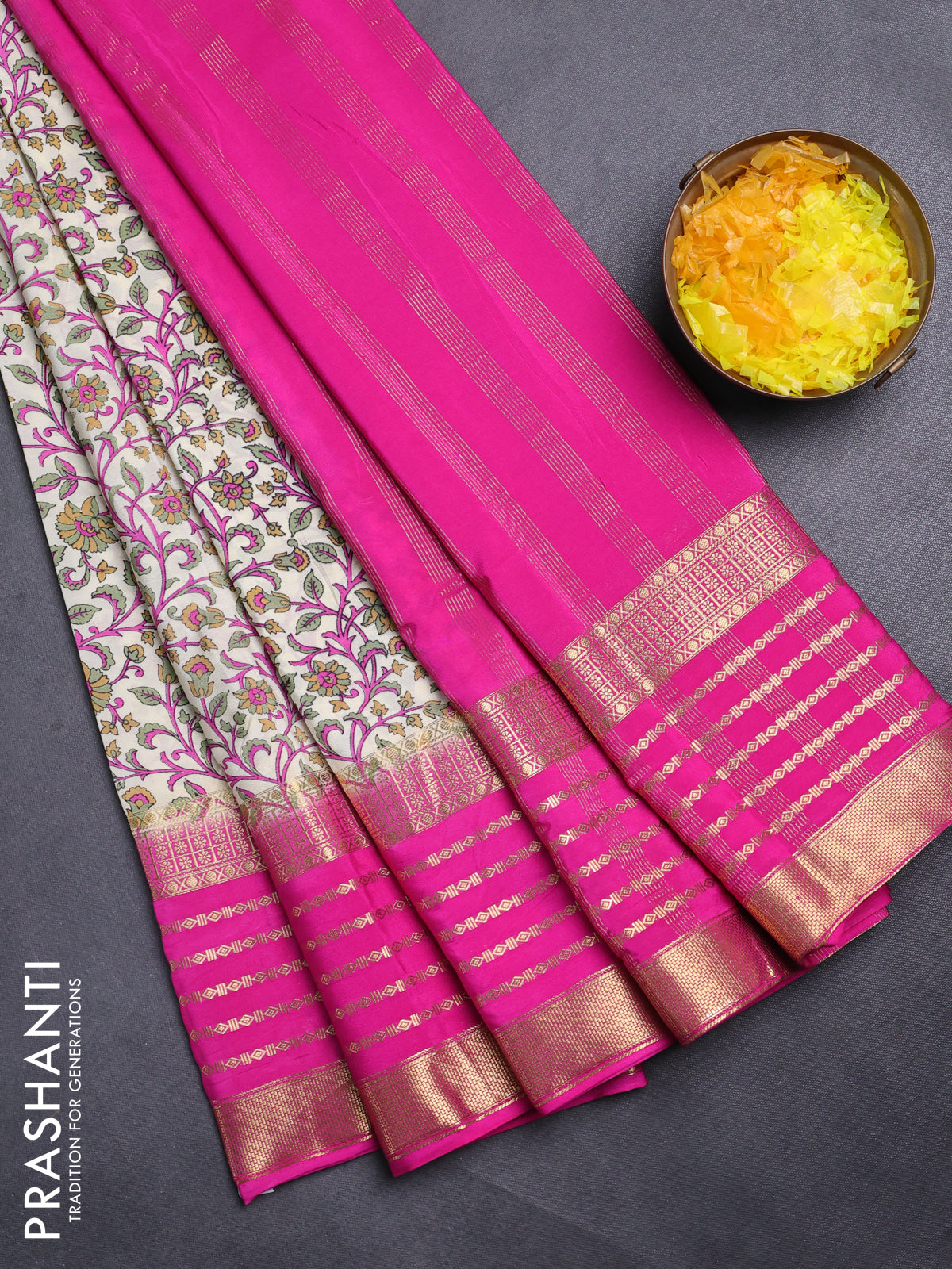 Semi mysore silk saree cream and pink with allover kalamkari prints and long zari woven border