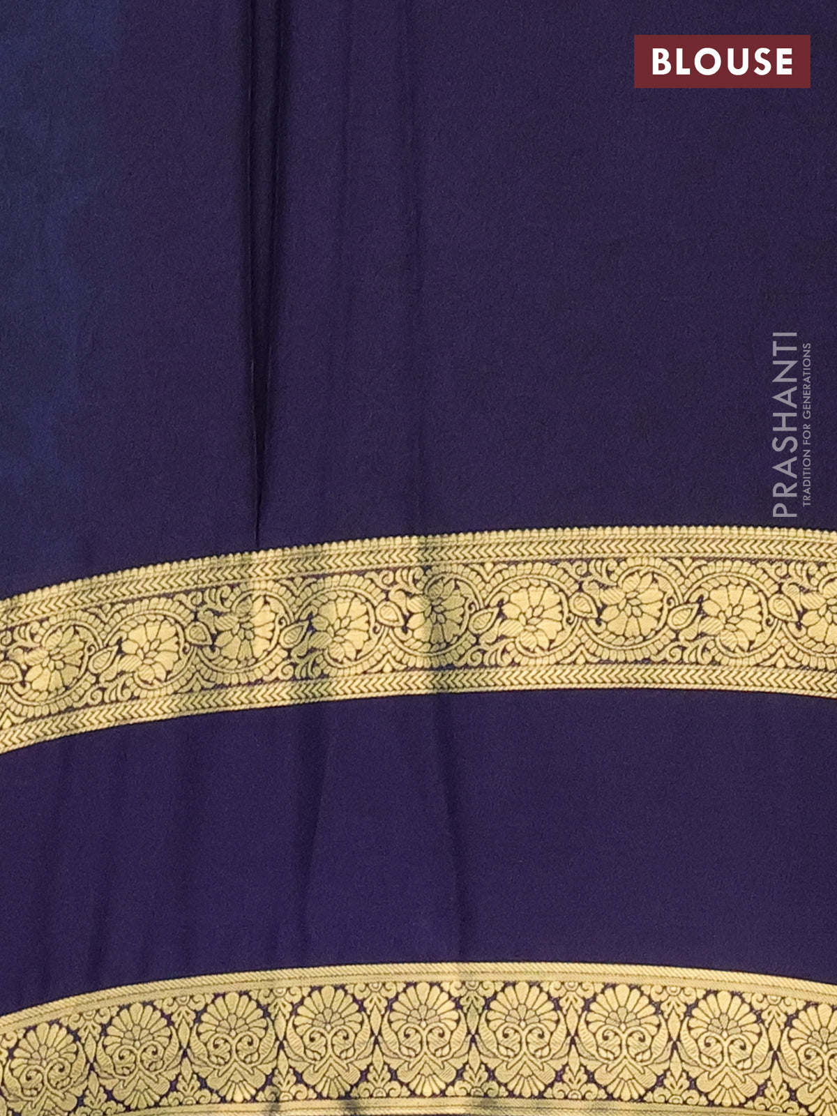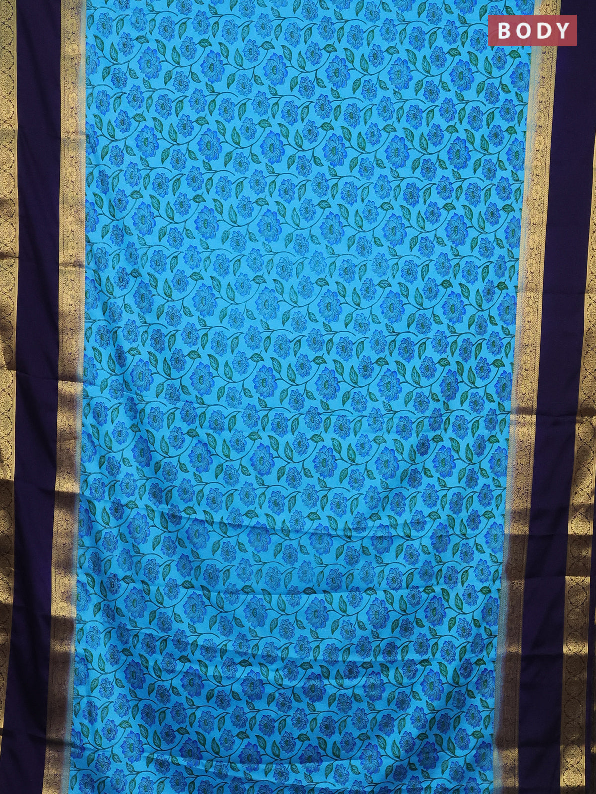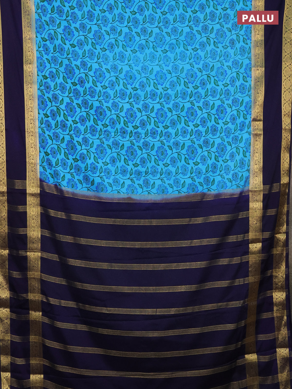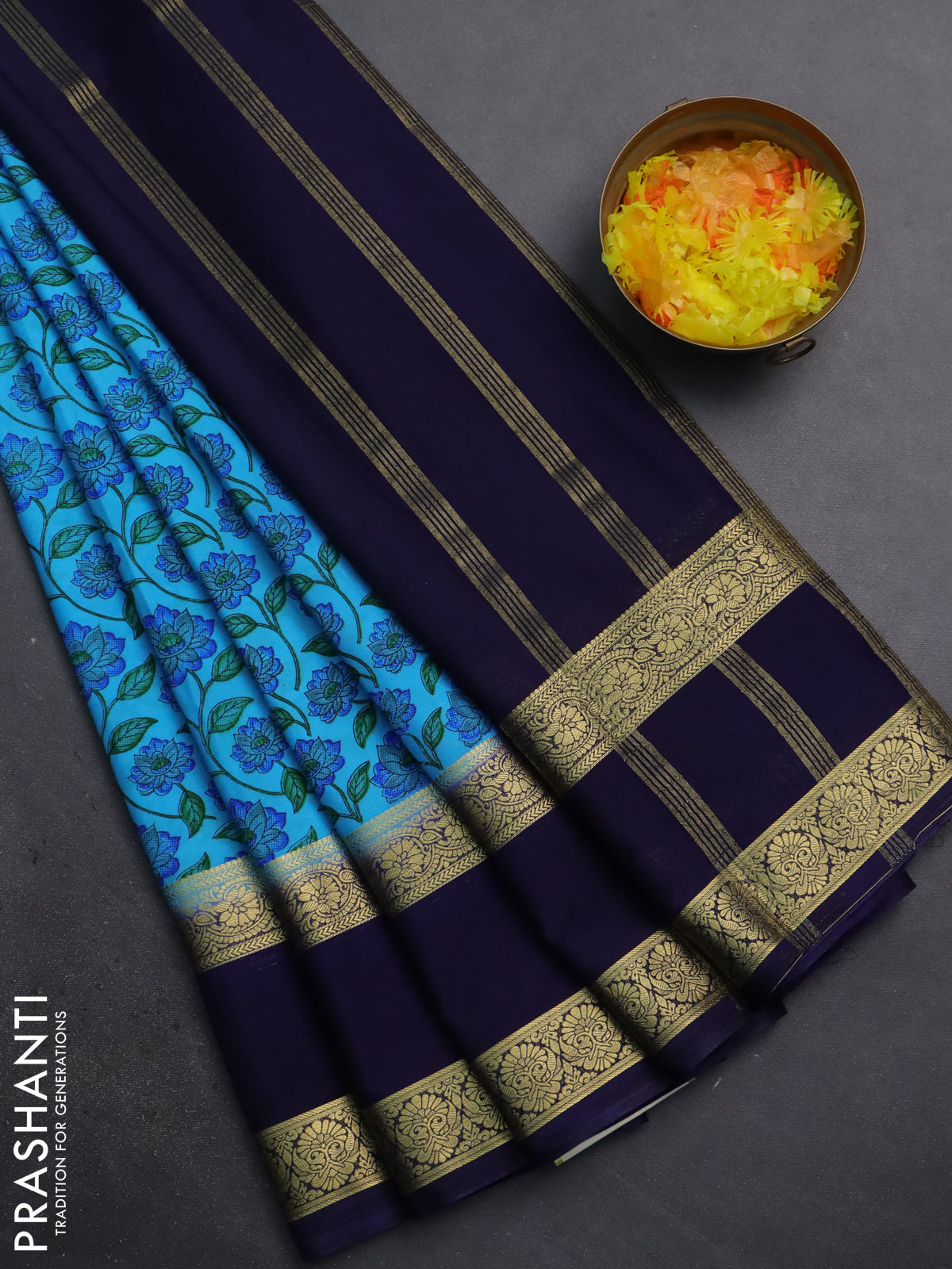 Semi mysore silk saree light blue and navy blue with allover floral prints and rettapet zari woven border