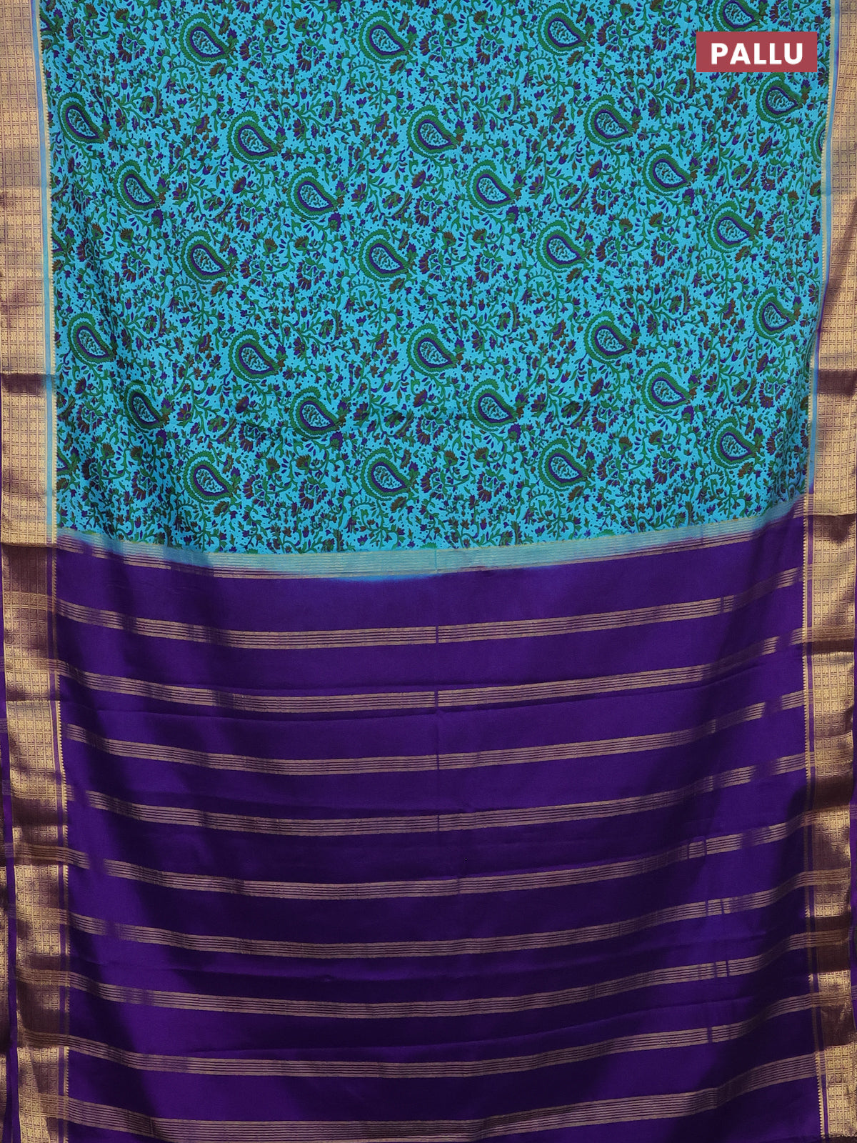Semi mysore silk saree light blue and violet with allover prints and zari woven border