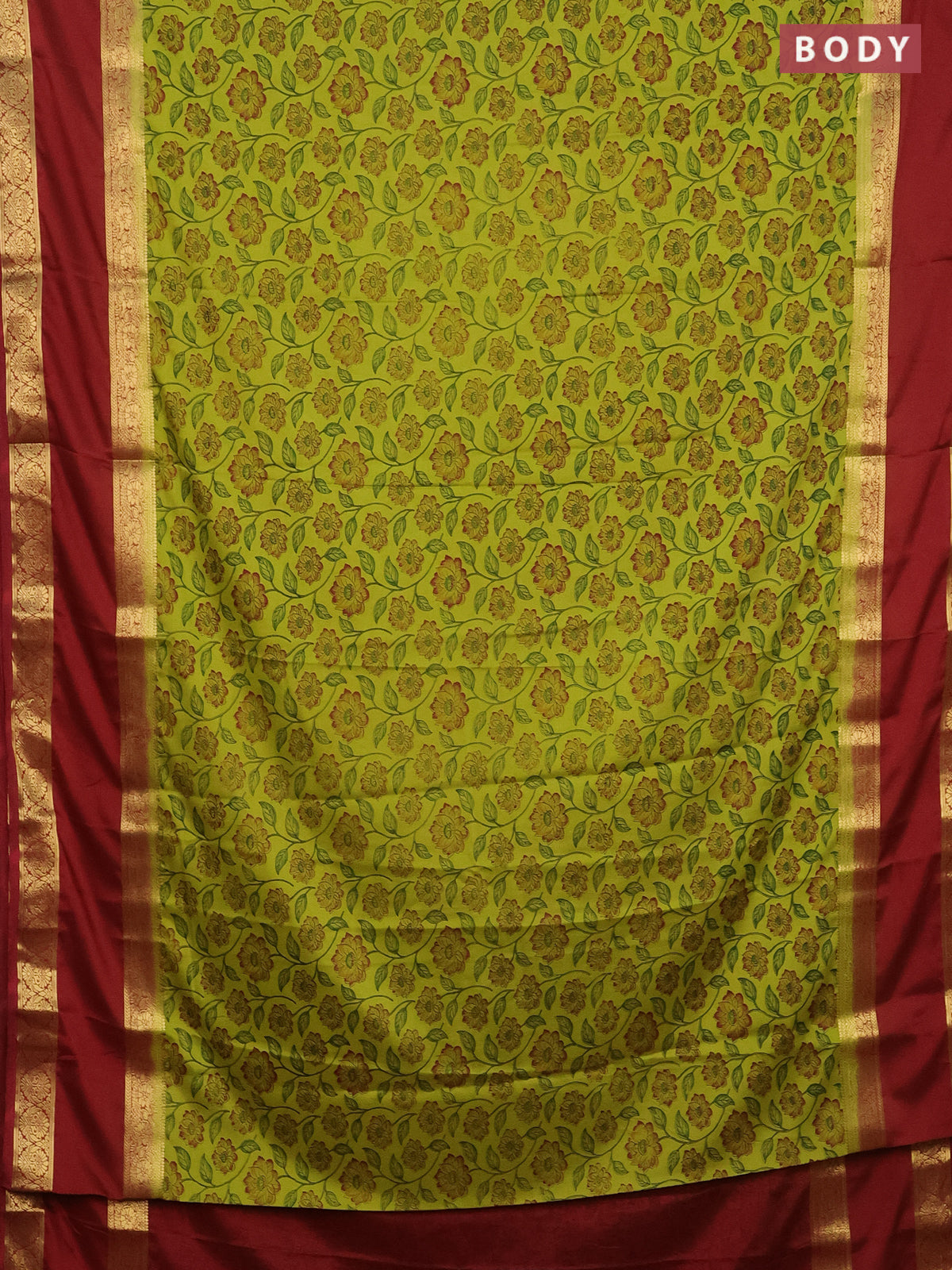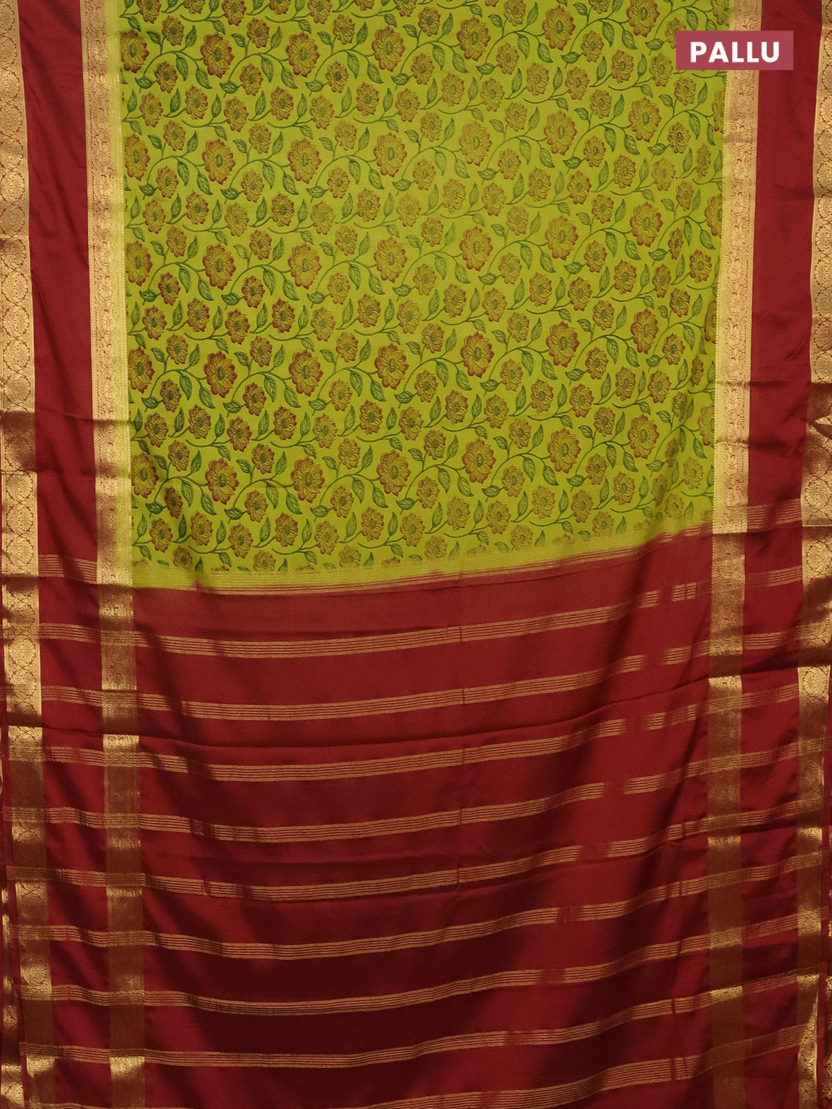 Semi mysore silk saree lime green and maroon with allover floral prints and rettapet zari woven border