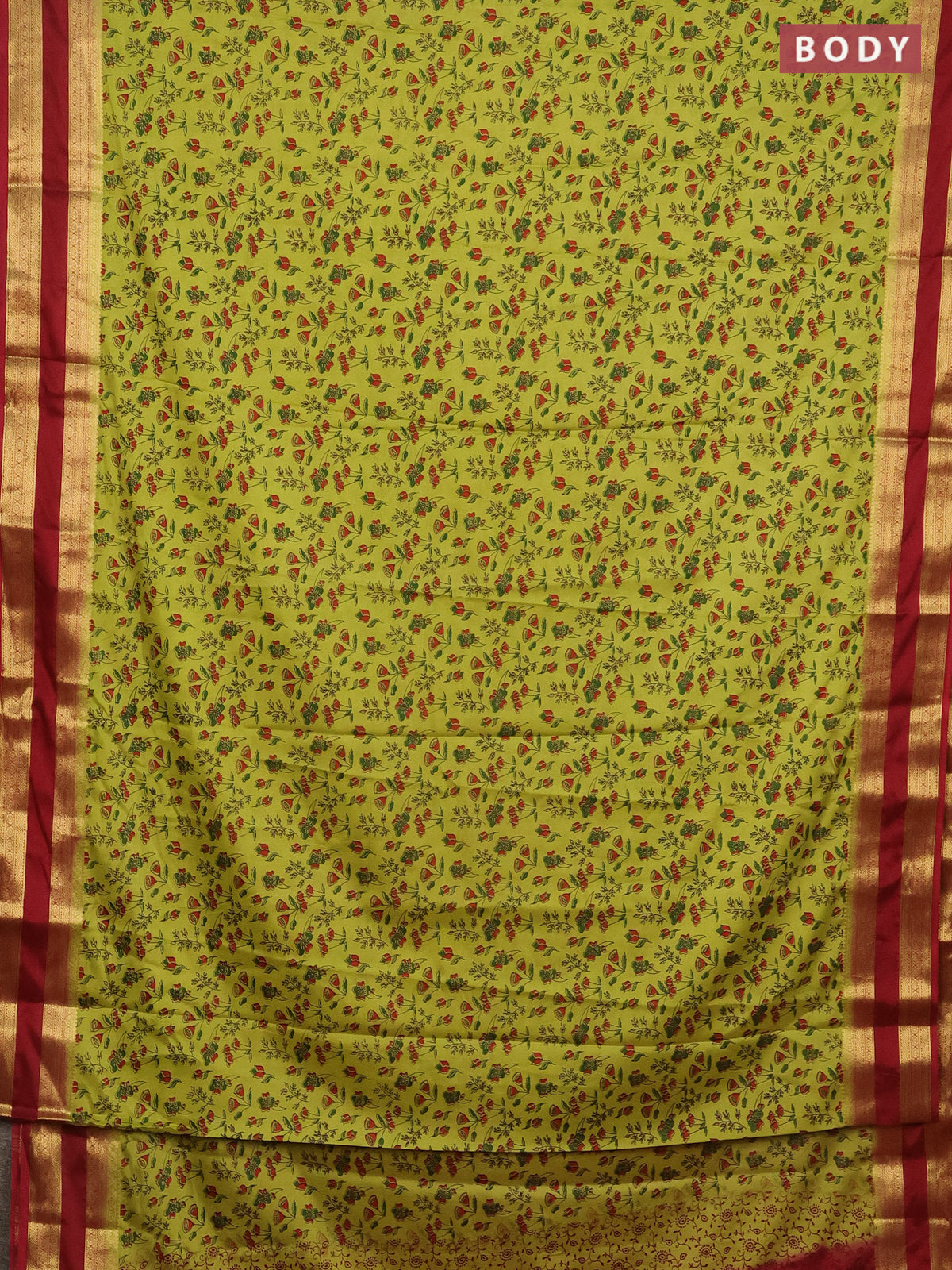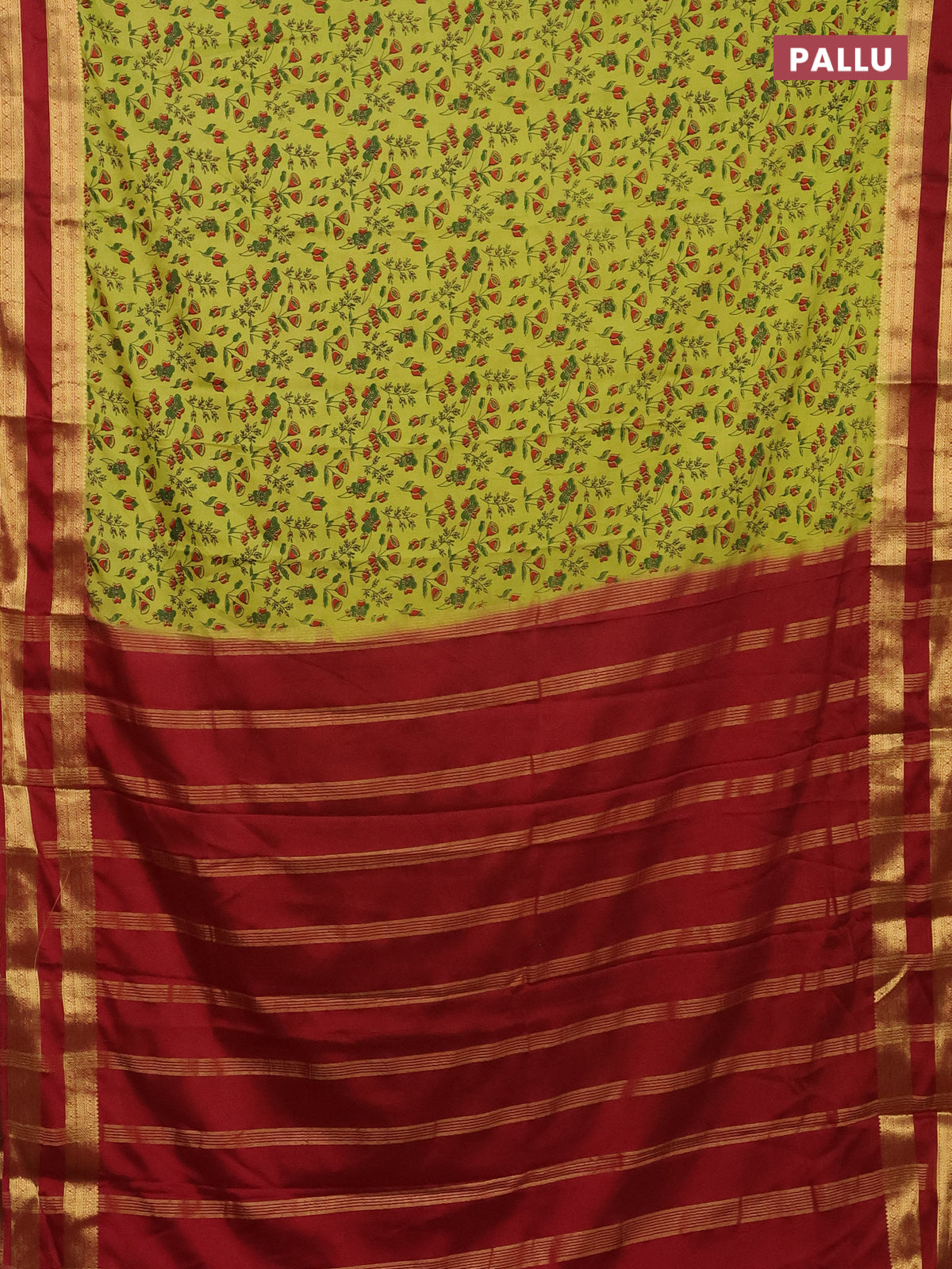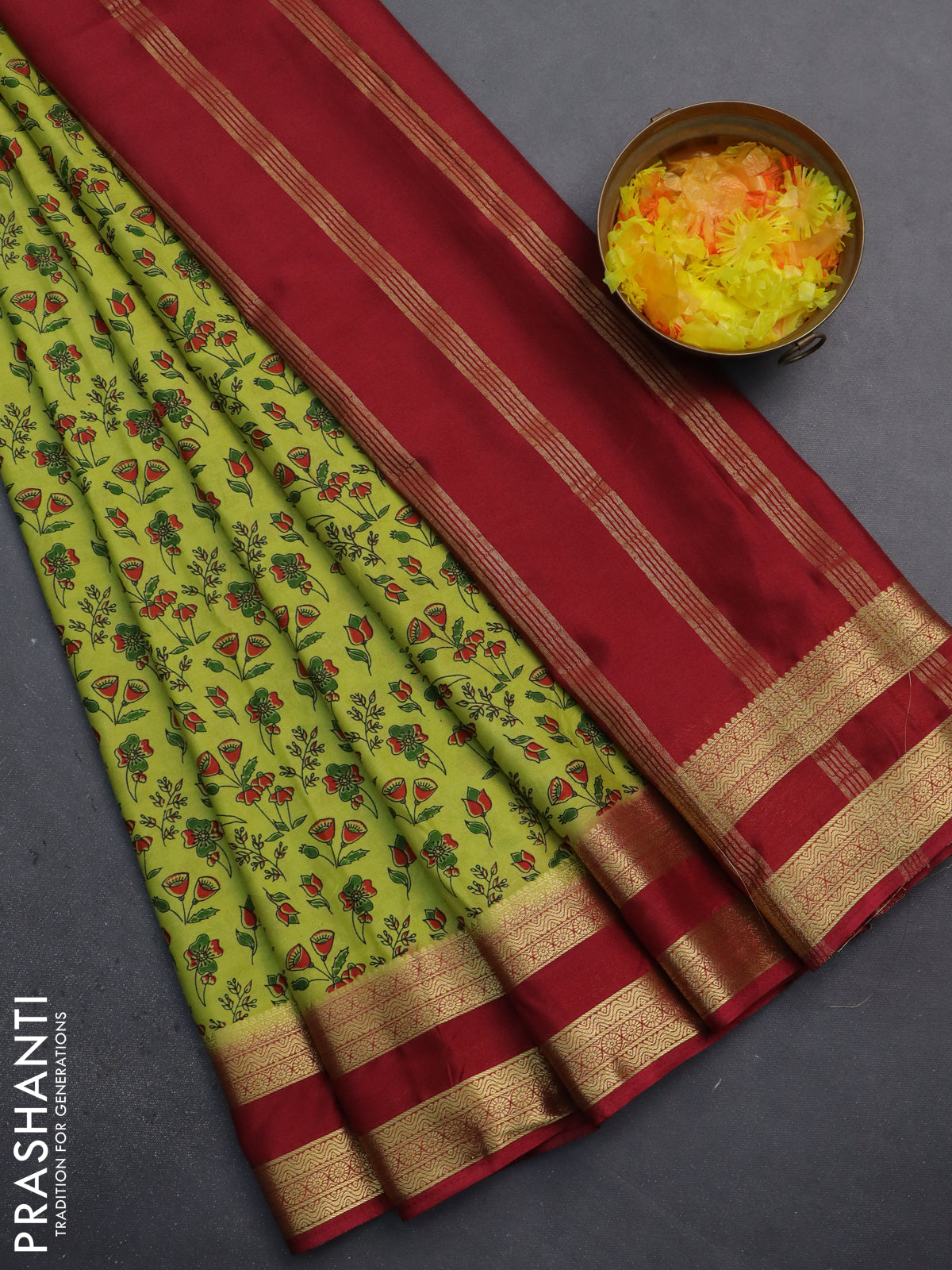 Semi mysore silk saree lime green and maroon with allover prints and rettapet zari woven border