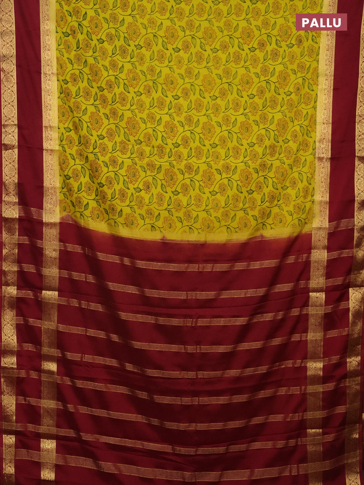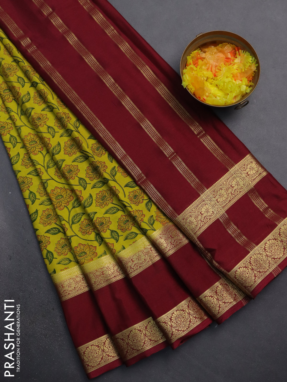 Semi mysore silk saree lime yellow and maroon with allover floral prints and rettapet zari woven border