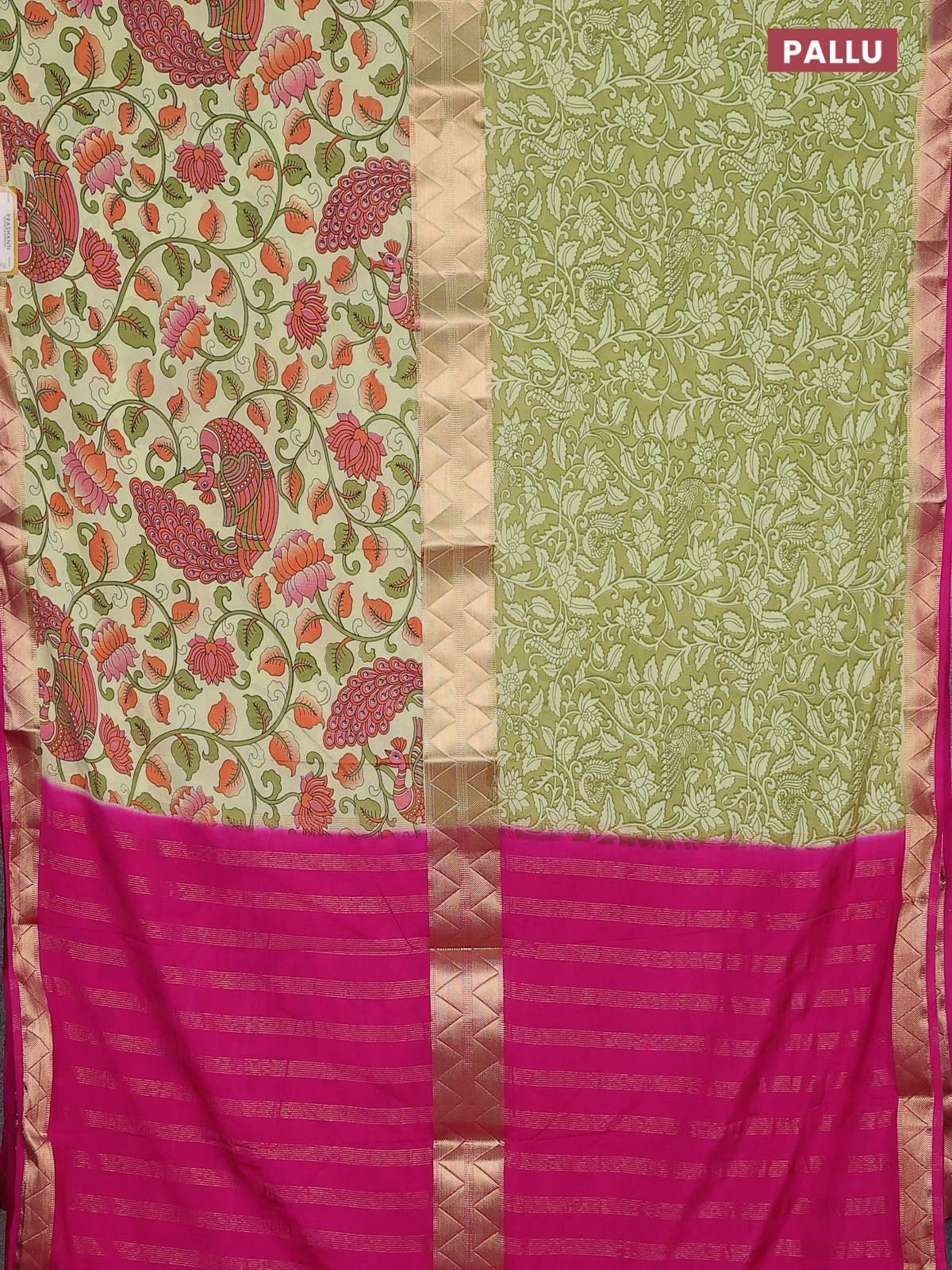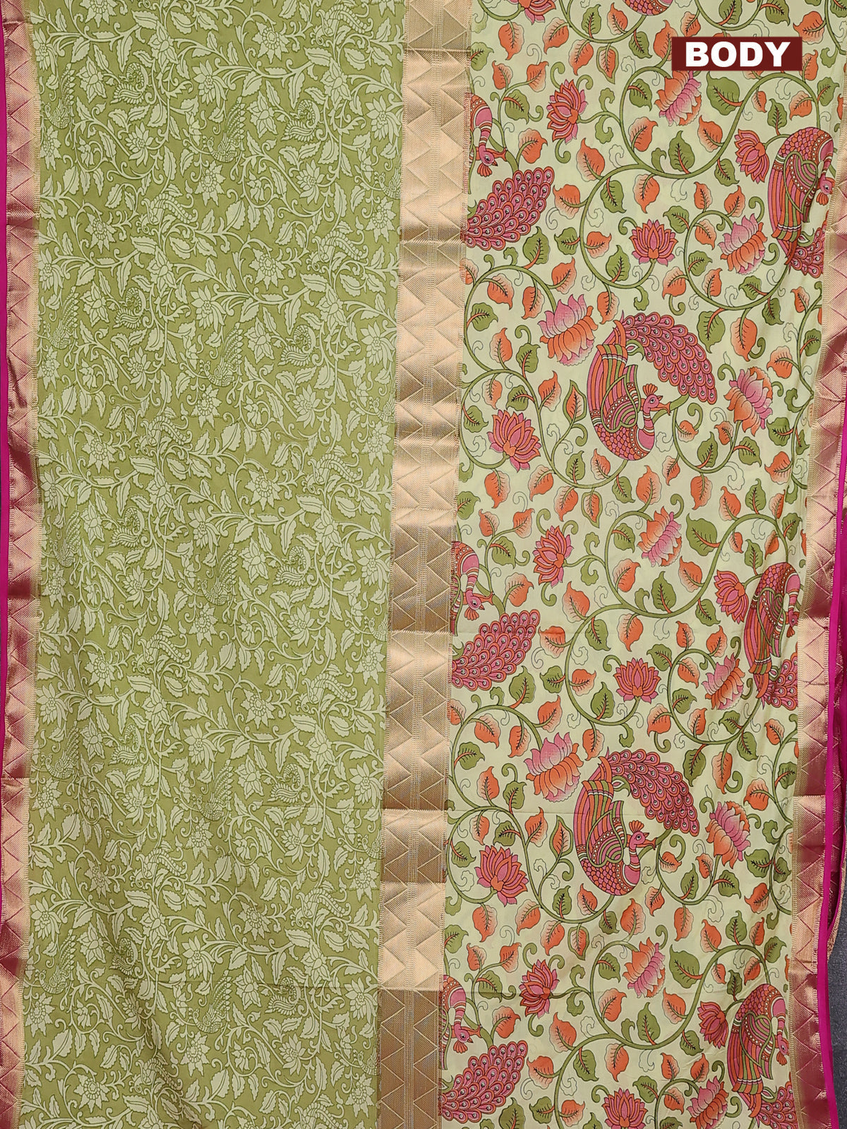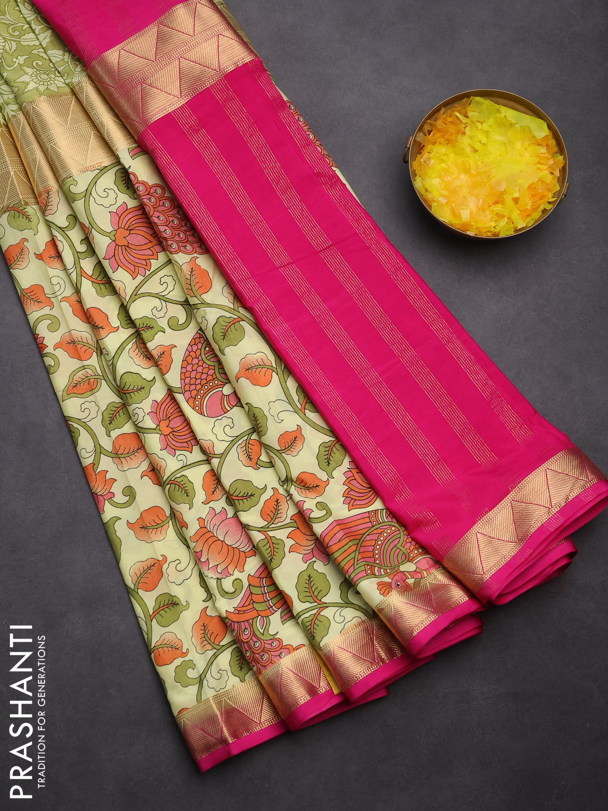 Semi mysore silk saree lime yellow and pink with half & half style and kalamkari prints