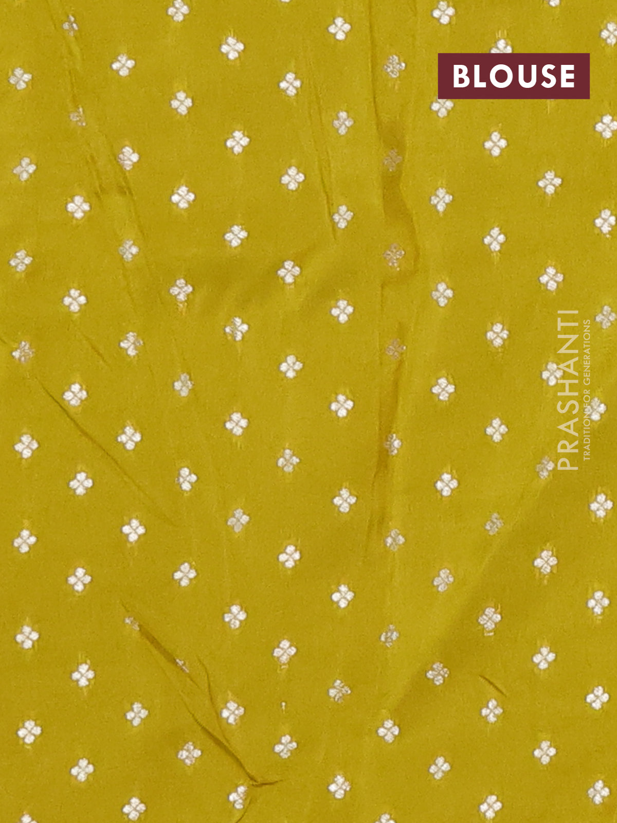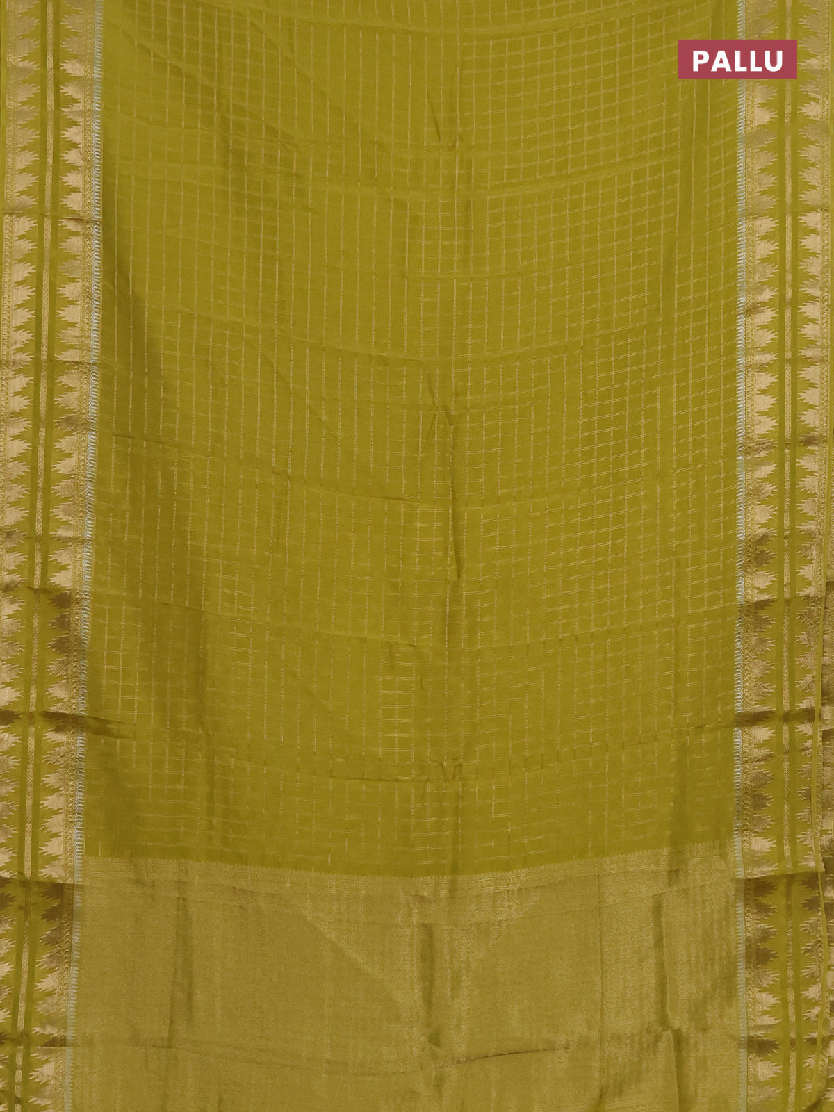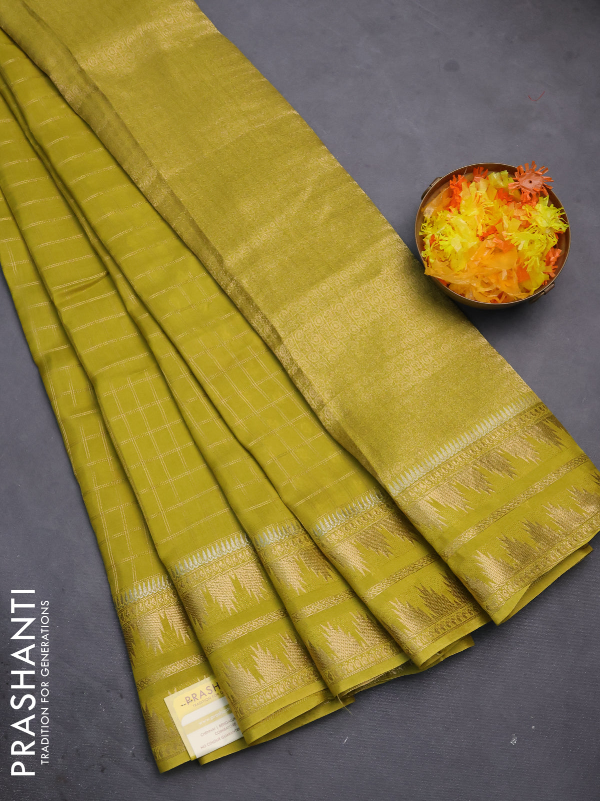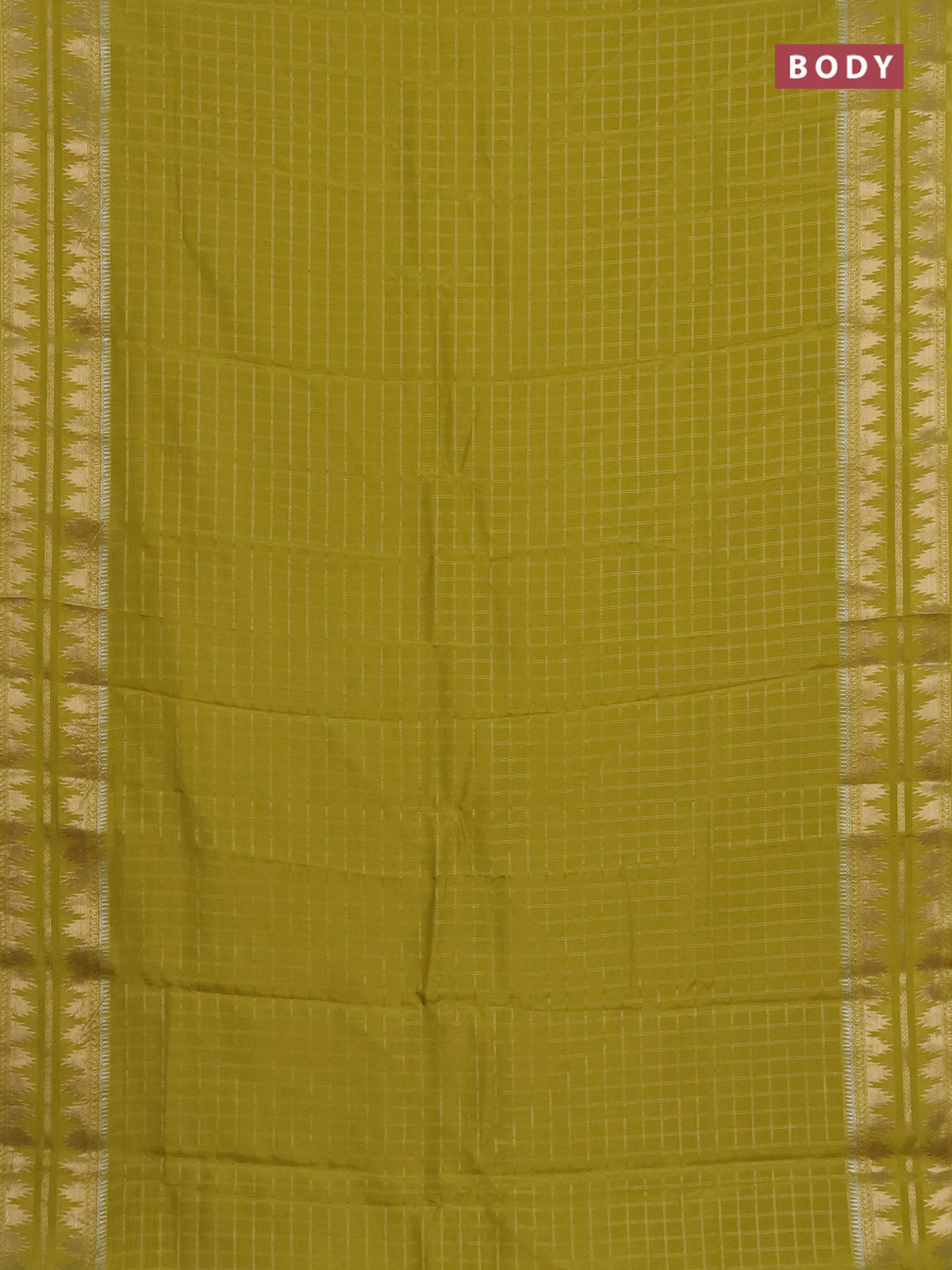Semi mysore silk saree lime yellow with allover zari checked pattern and temple design zari woven border