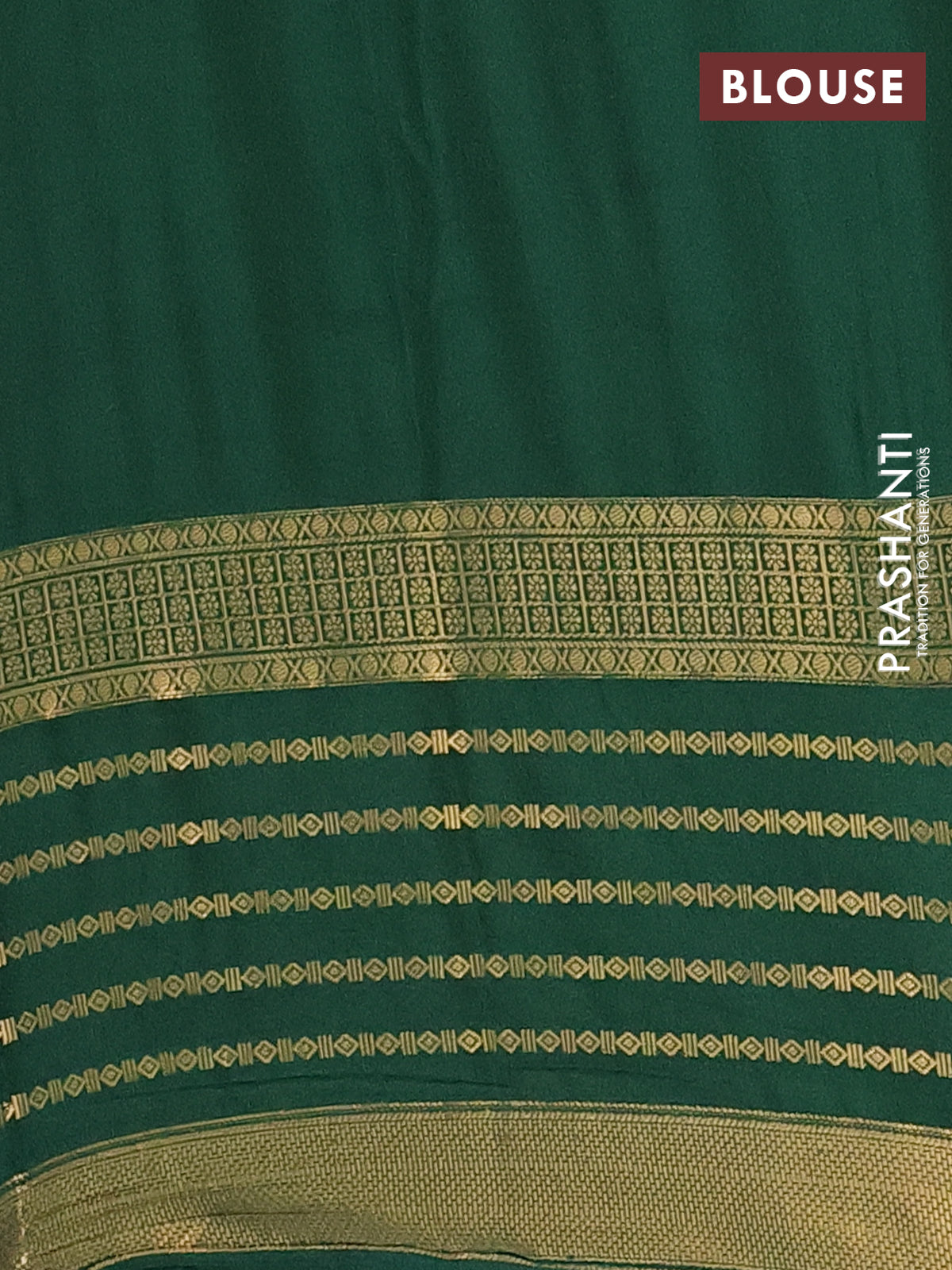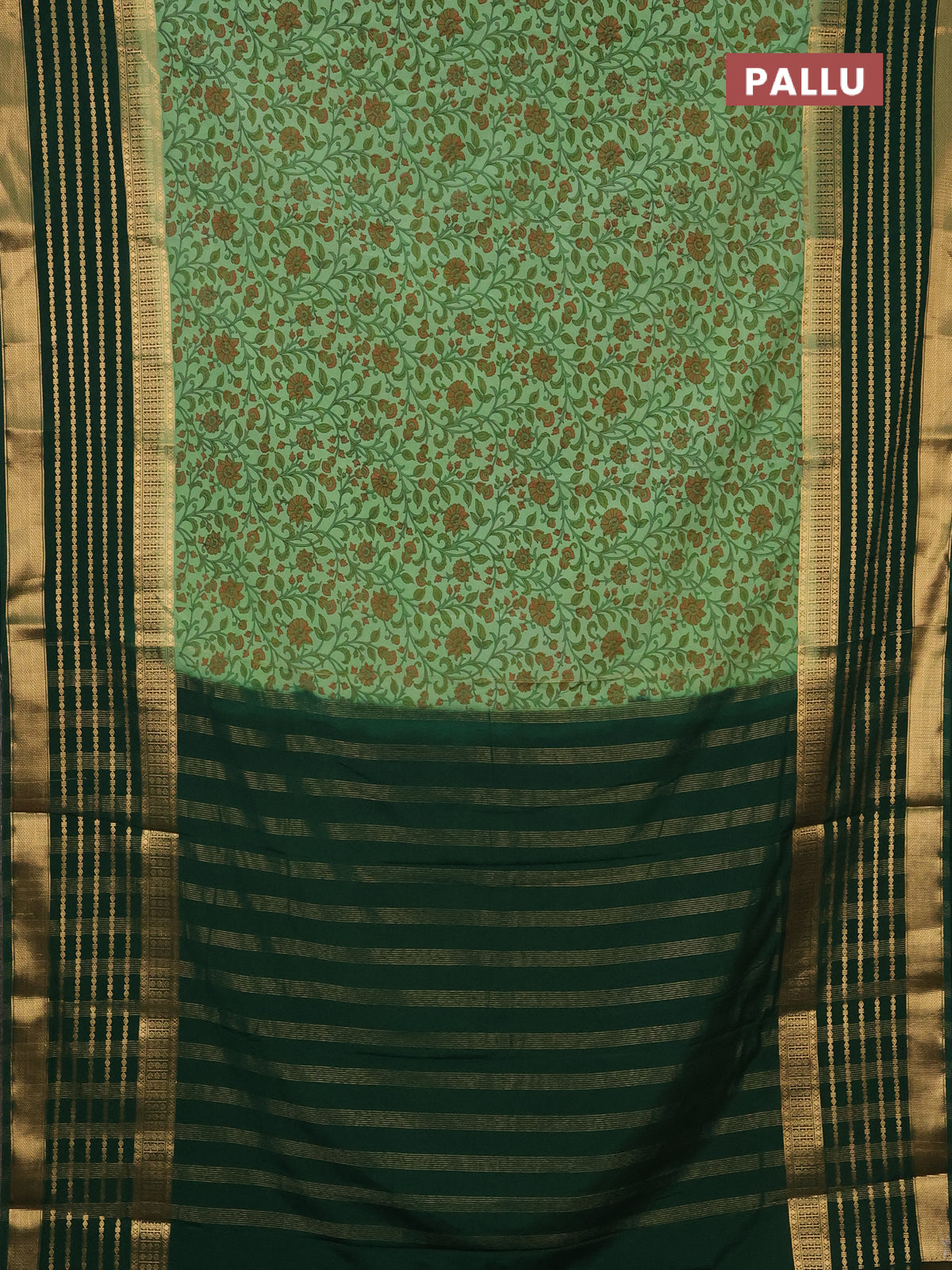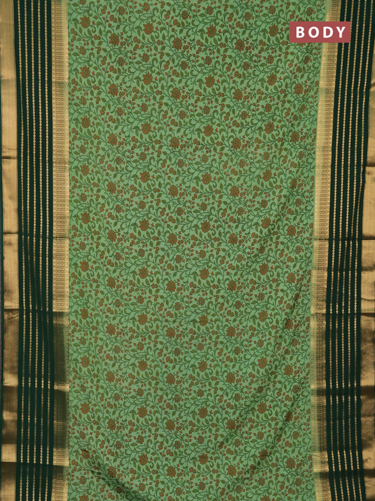 Semi mysore silk saree pastel green and green with allover kalamkari prints and long zari woven border