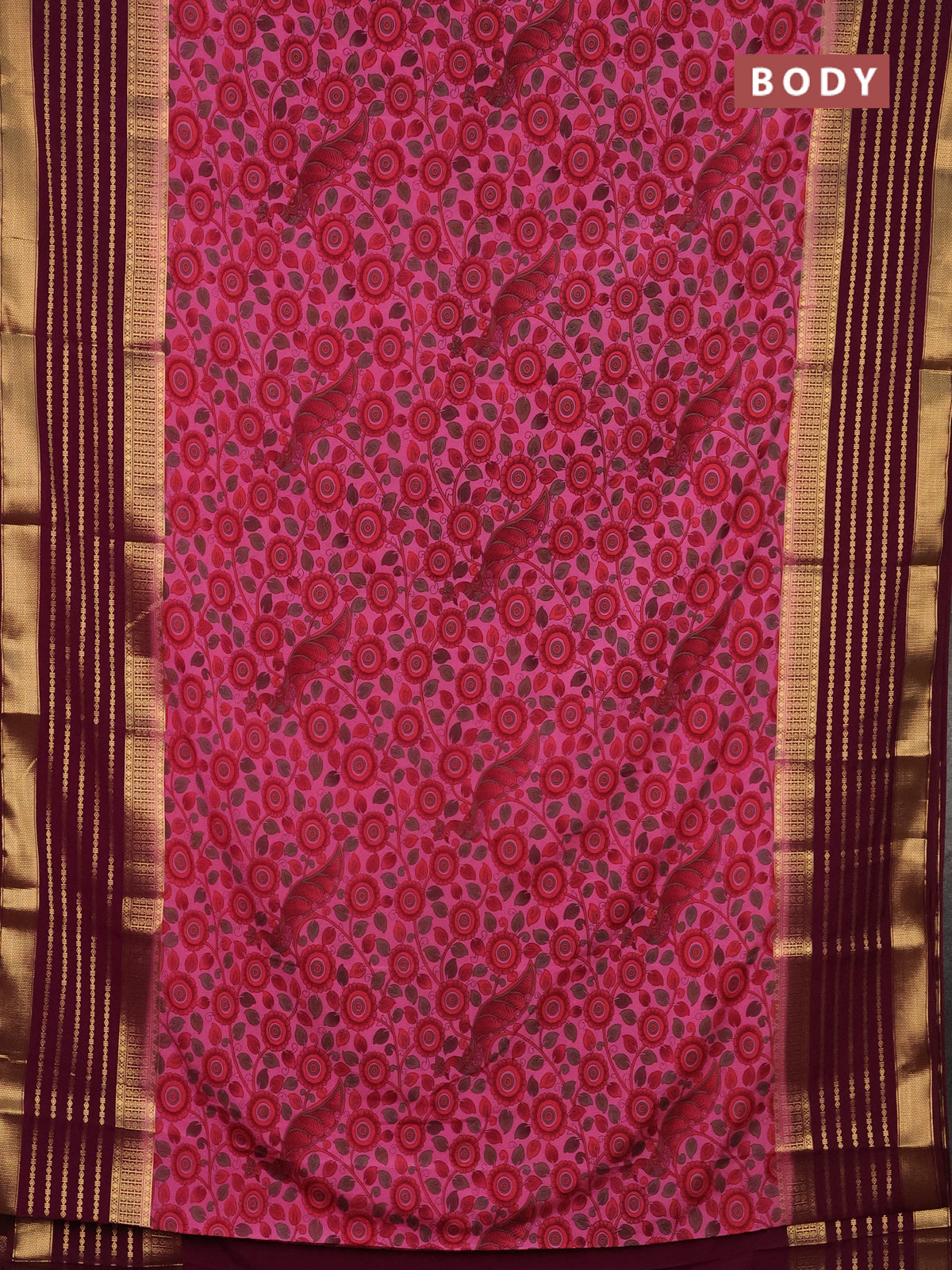 Semi mysore silk saree pink and wine shade with allover kalamkari prints and long zari woven border