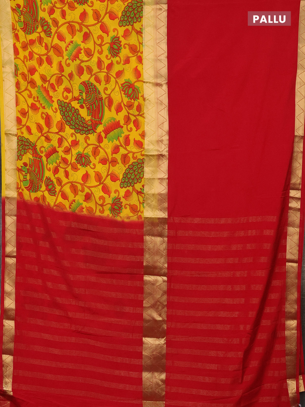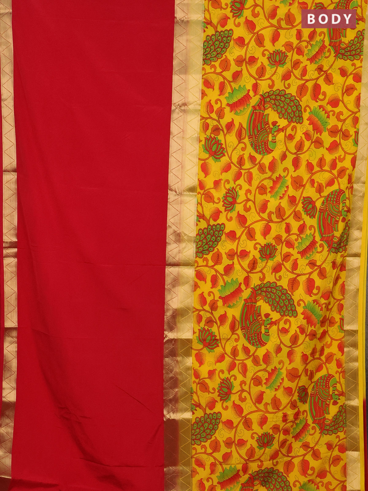 Semi mysore silk saree red and yellow with half & half style and long kalamkari printed border