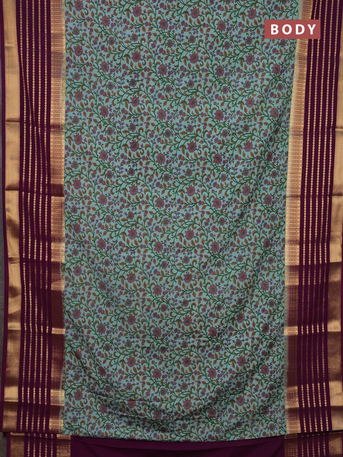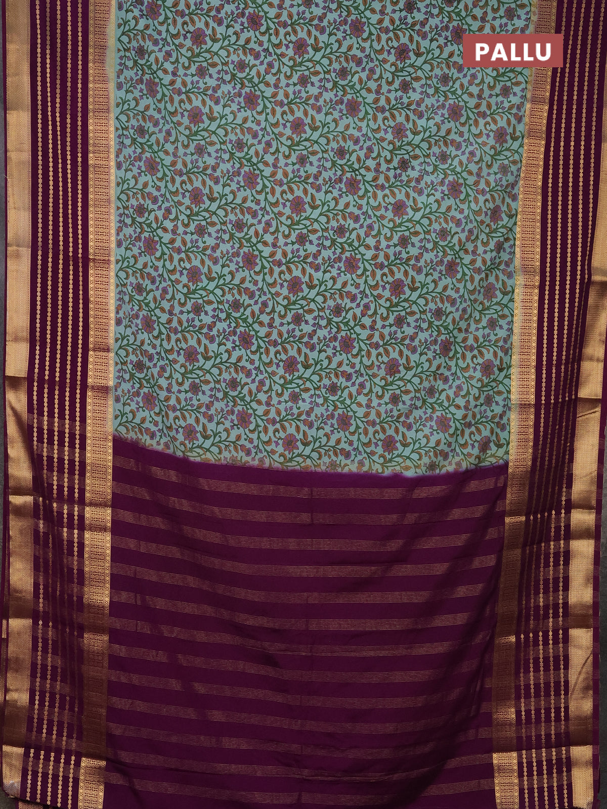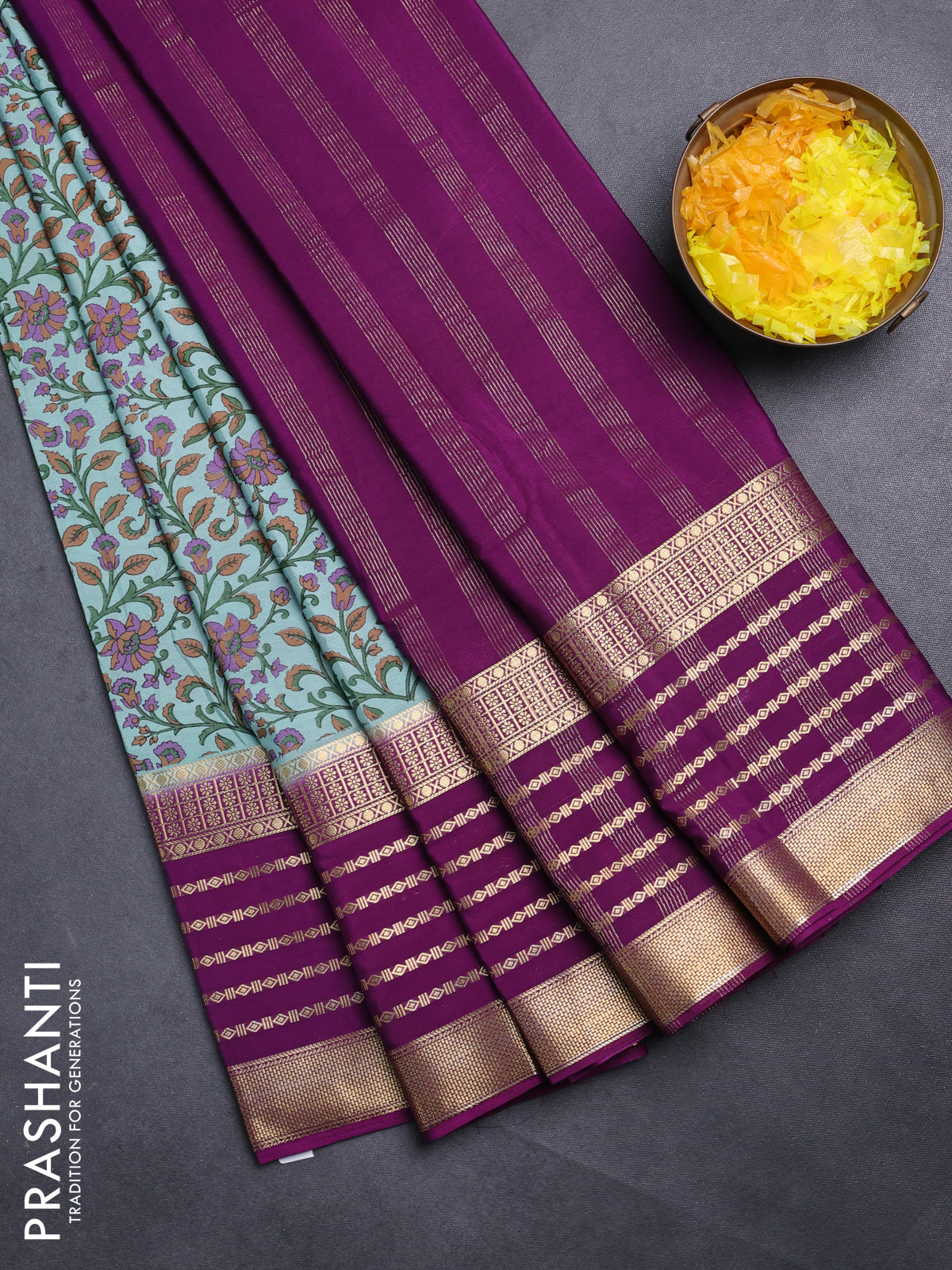 Semi mysore silk saree teal shade and purple with allover kalamkari prints and long zari woven border