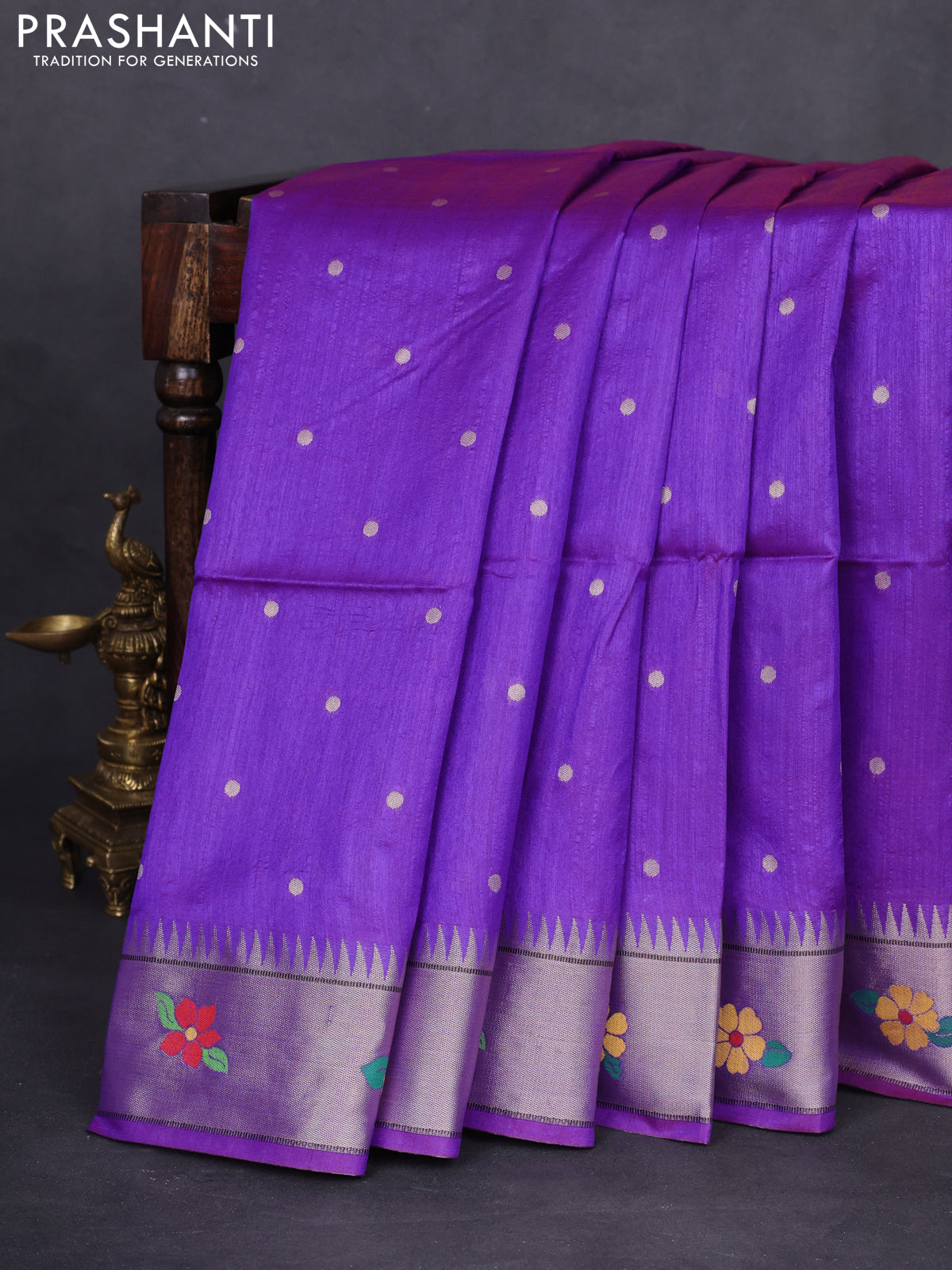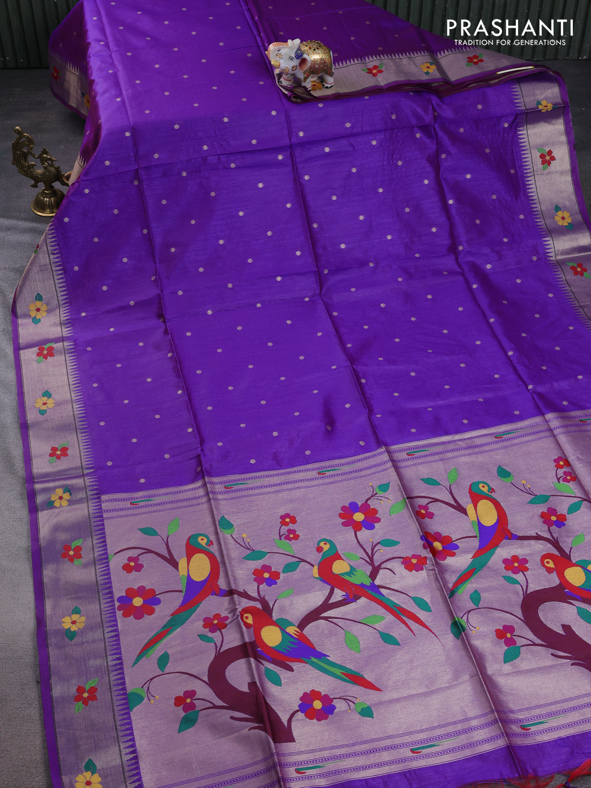 Semi paithani saree purple with allover zari woven buttas and parrot design paithani pallu