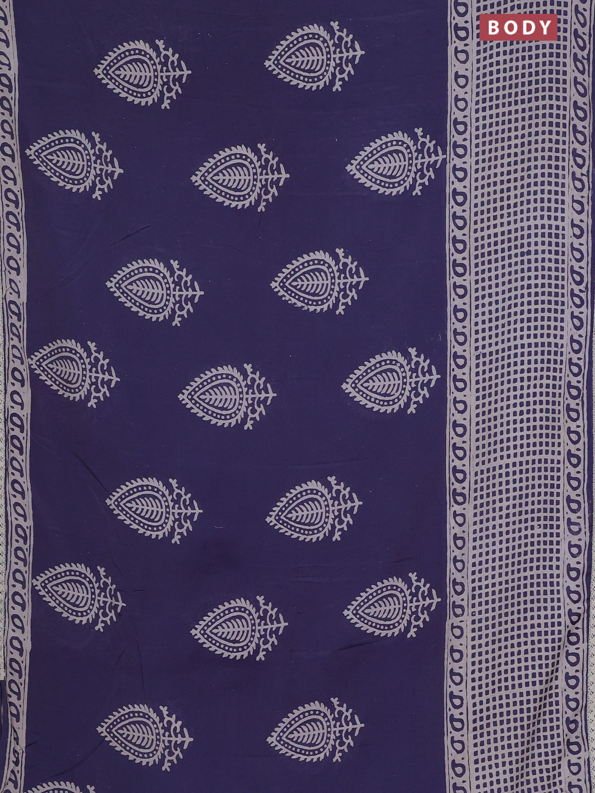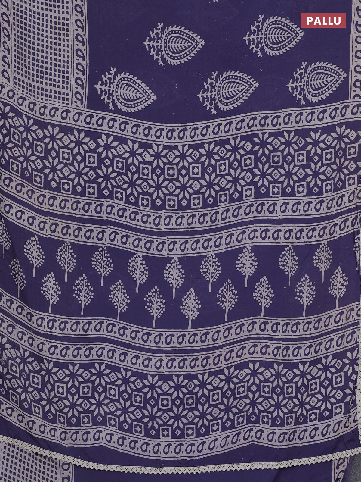 Semi pashmina silk saree blue shade and cream with butta prints and long printed crocia lace work border