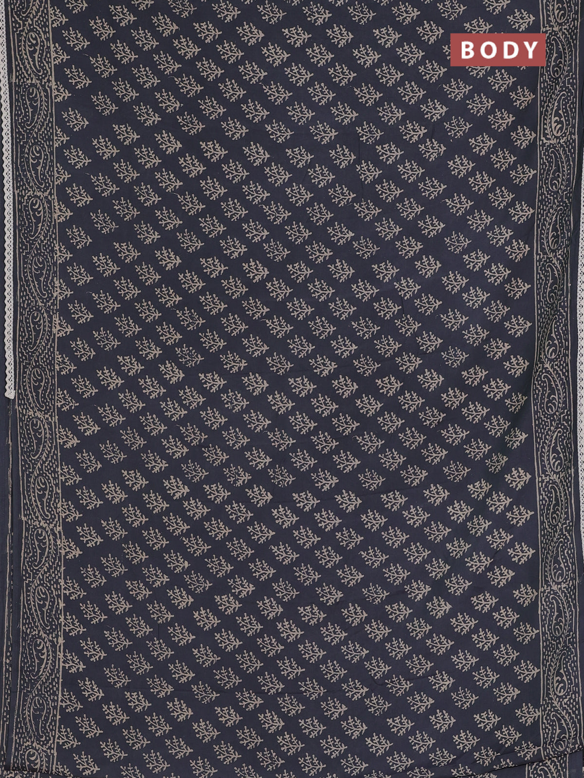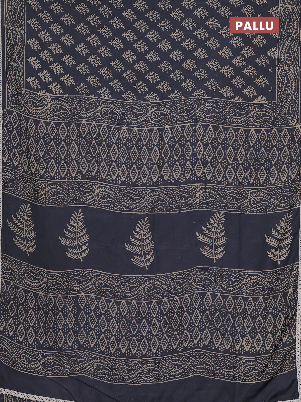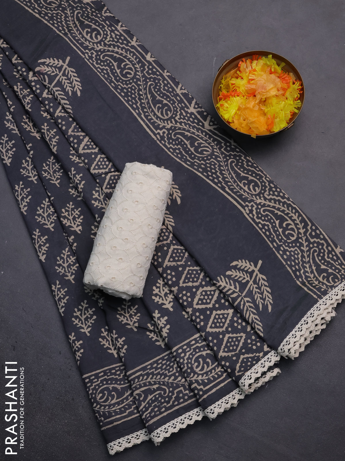 Semi pashmina silk saree dark grey and cream with allover butta prints and crocia lace work border