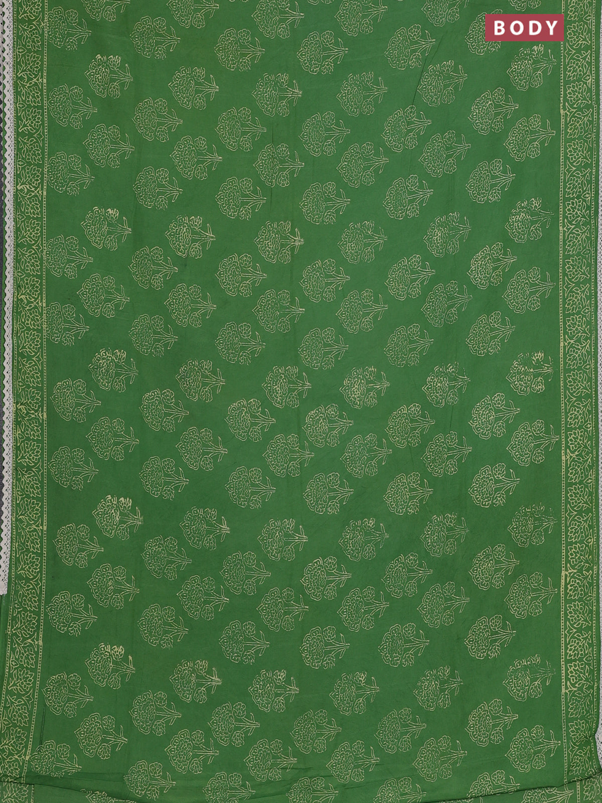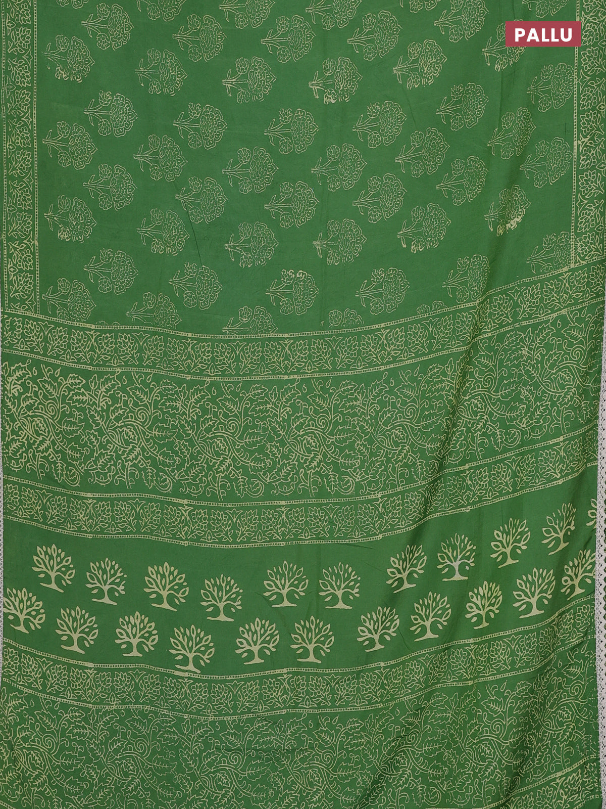 Semi pashmina silk saree green and cream with allover floral butta prints and crocia lace work border