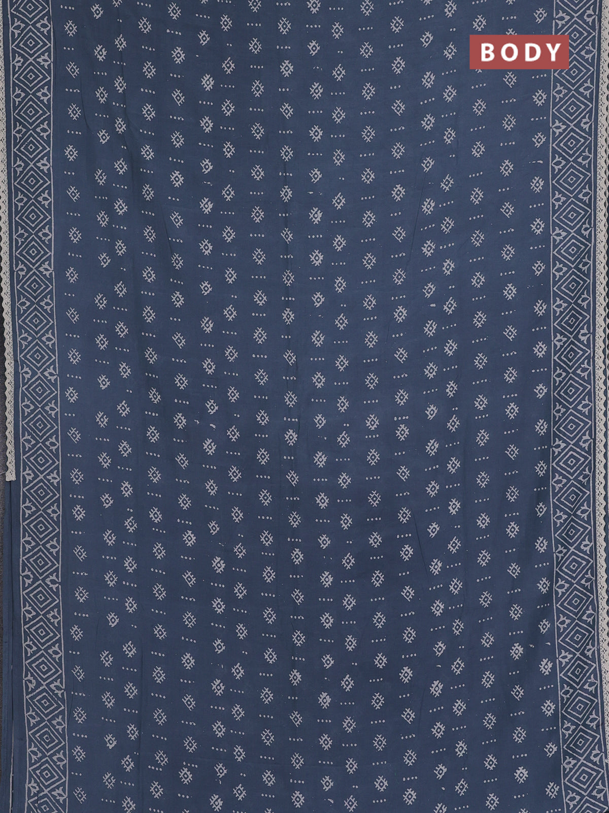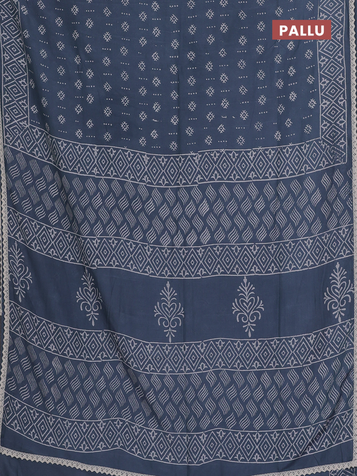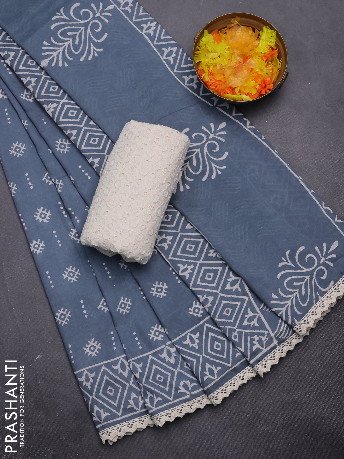 Semi pashmina silk saree grey and cream with allover butta prints and crocia lace work border