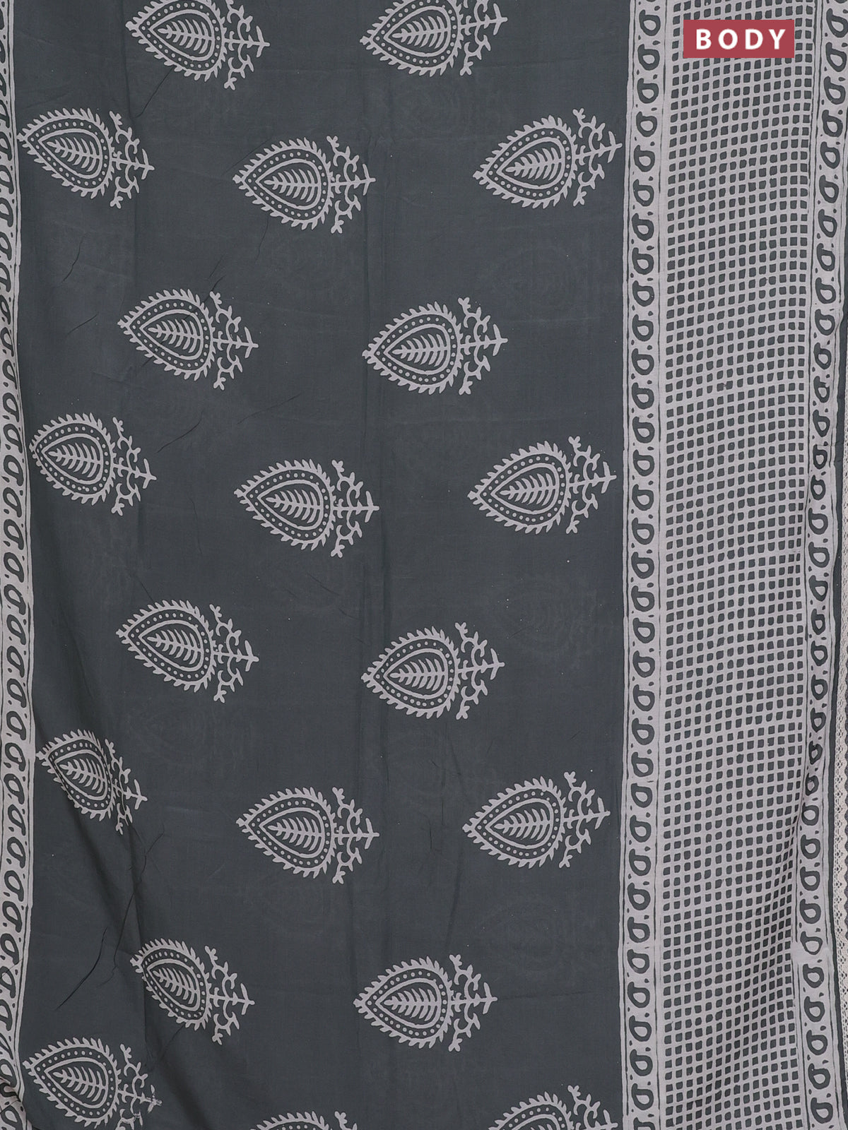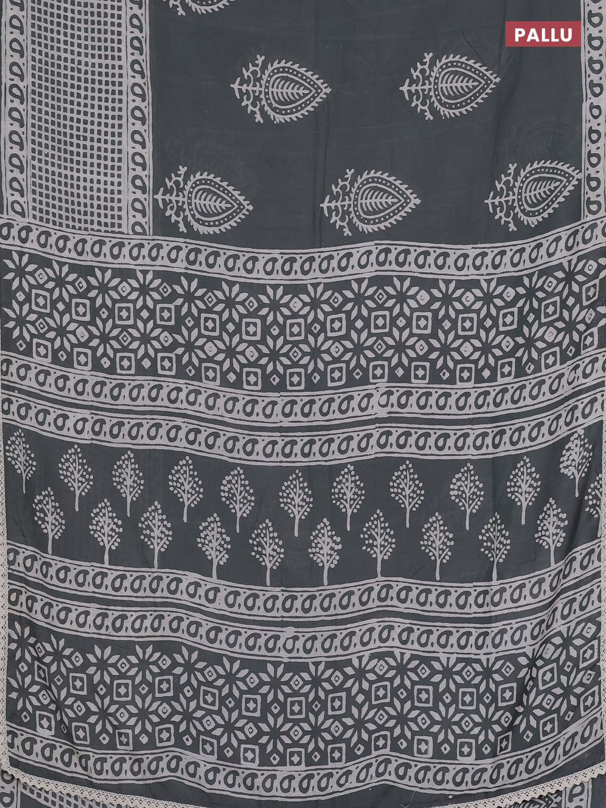 Semi pashmina silk saree grey and cream with butta prints and long printed crocia lace work border