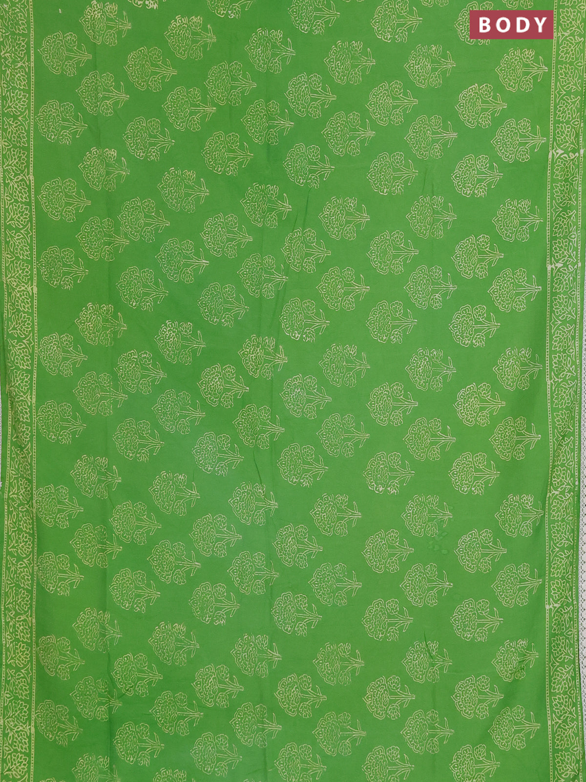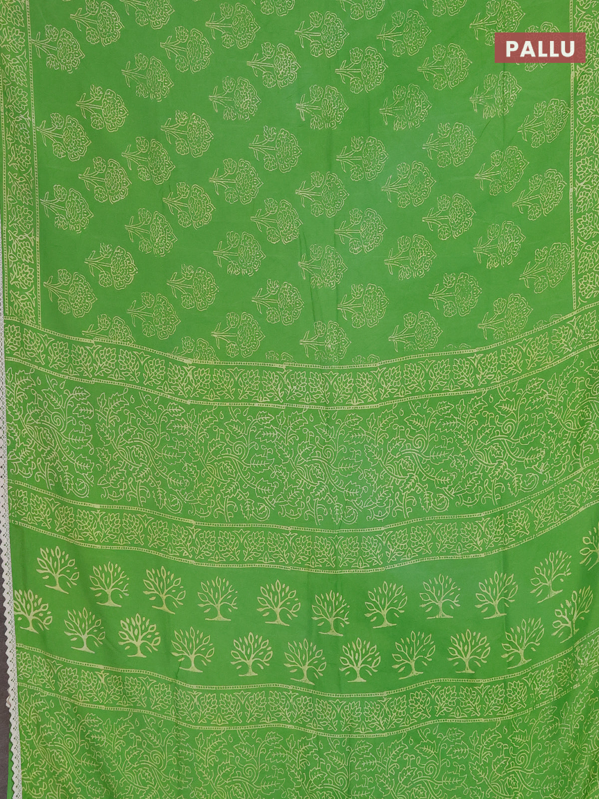 Semi pashmina silk saree light green and cream with allover floral butta prints and crocia lace work border