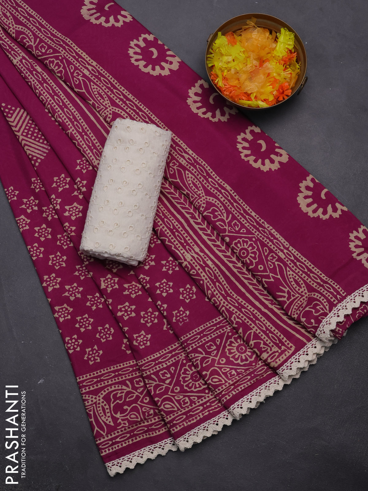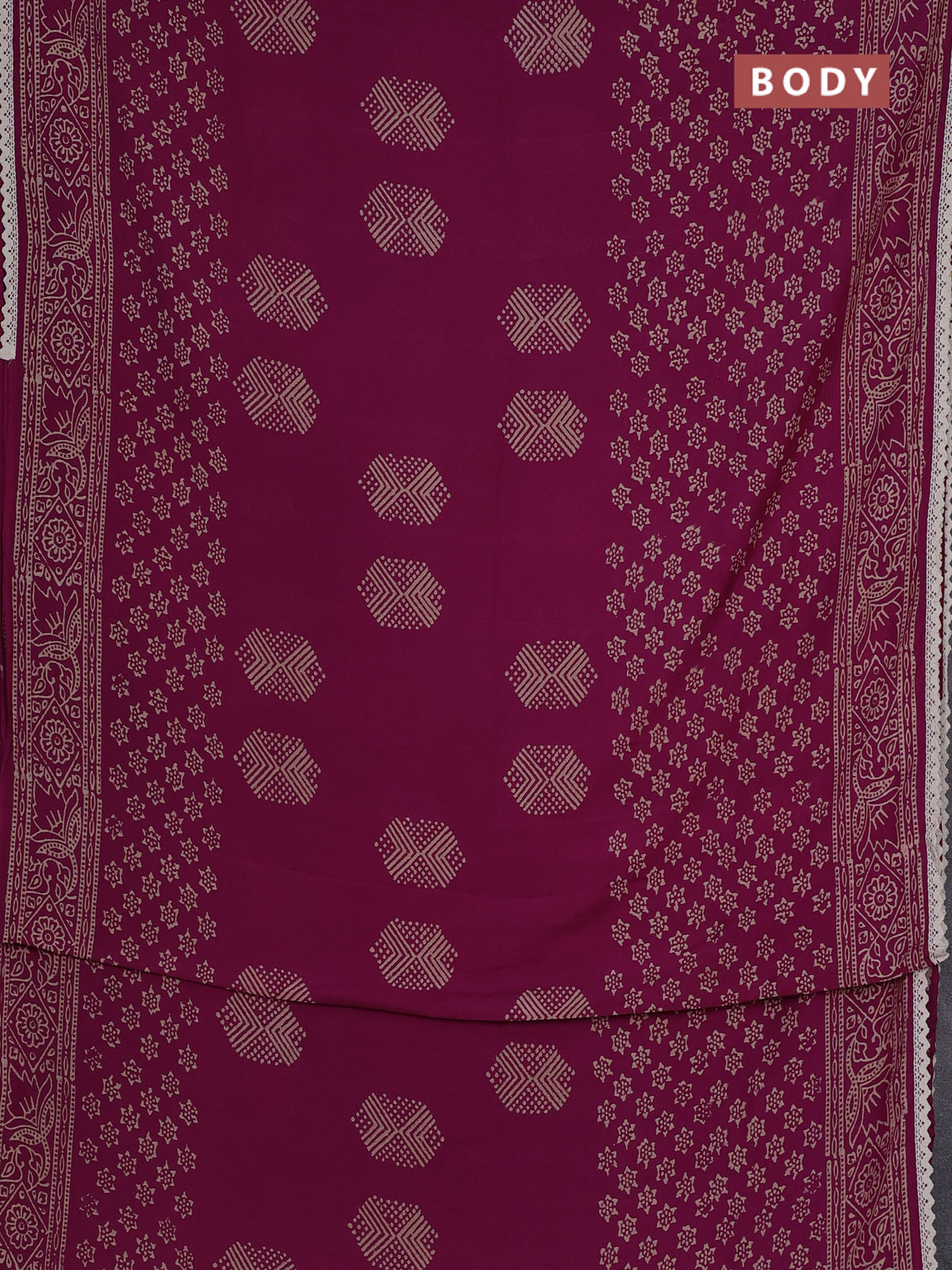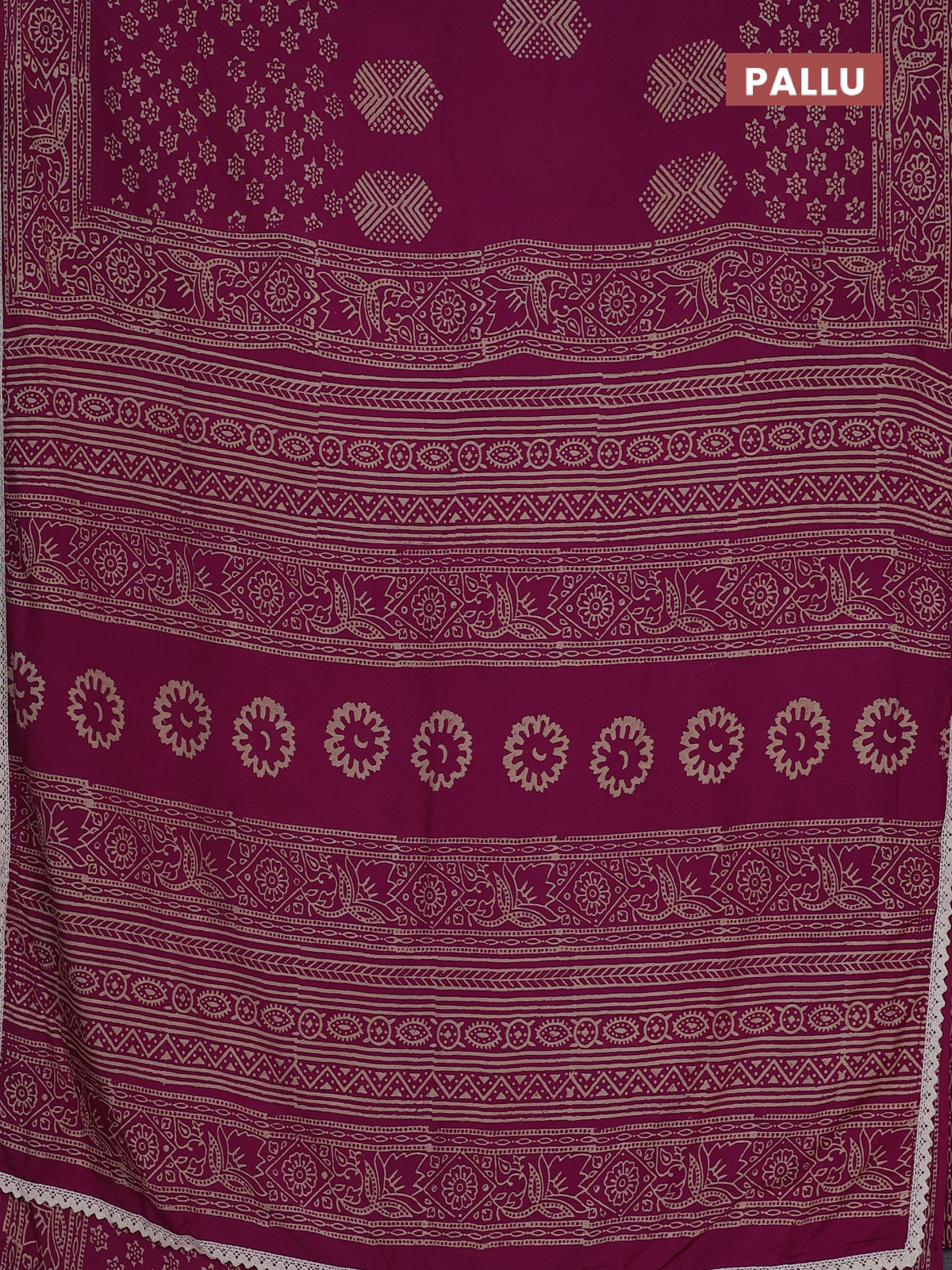 Semi pashmina silk saree magenta pink and cream with butta prints and crocia lace work border