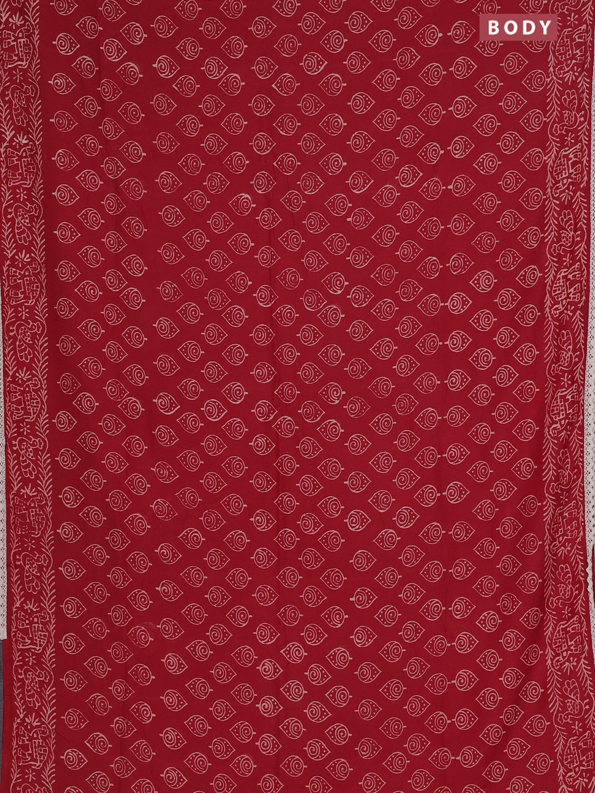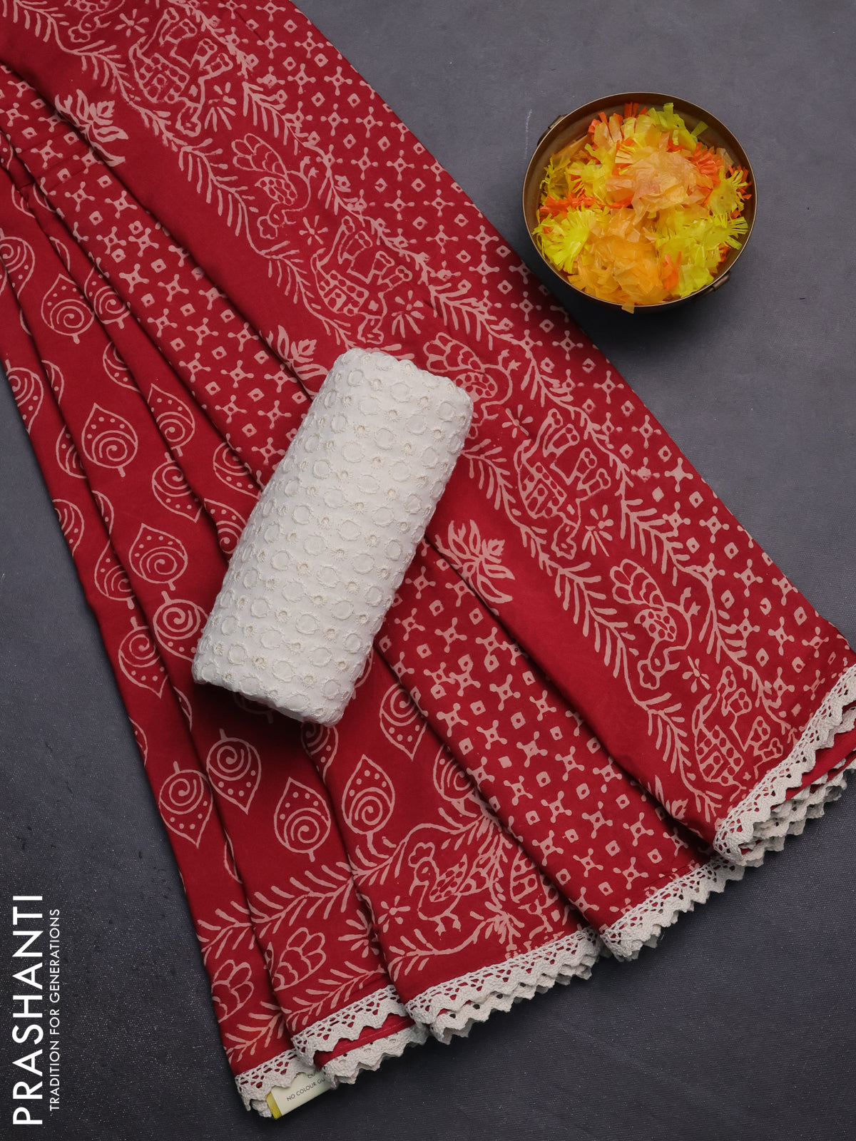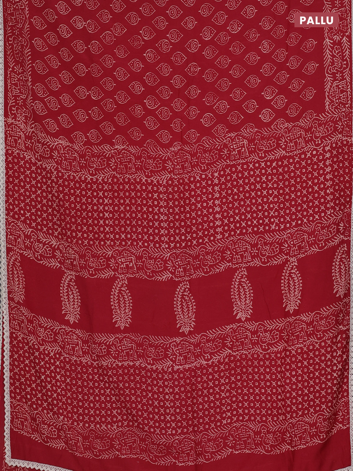 Semi pashmina silk saree maroon and cream with allover butta prints and crocia lace work border