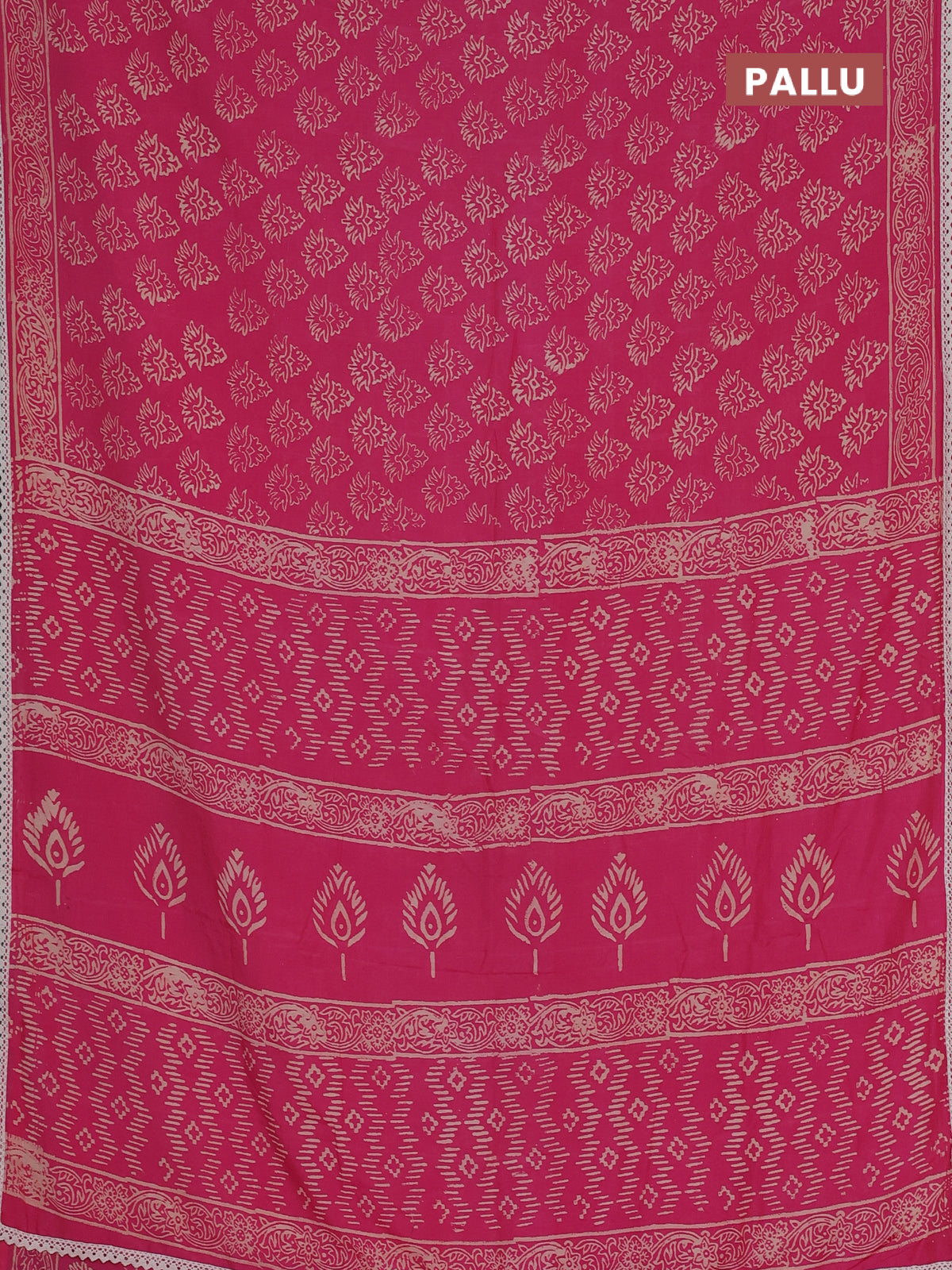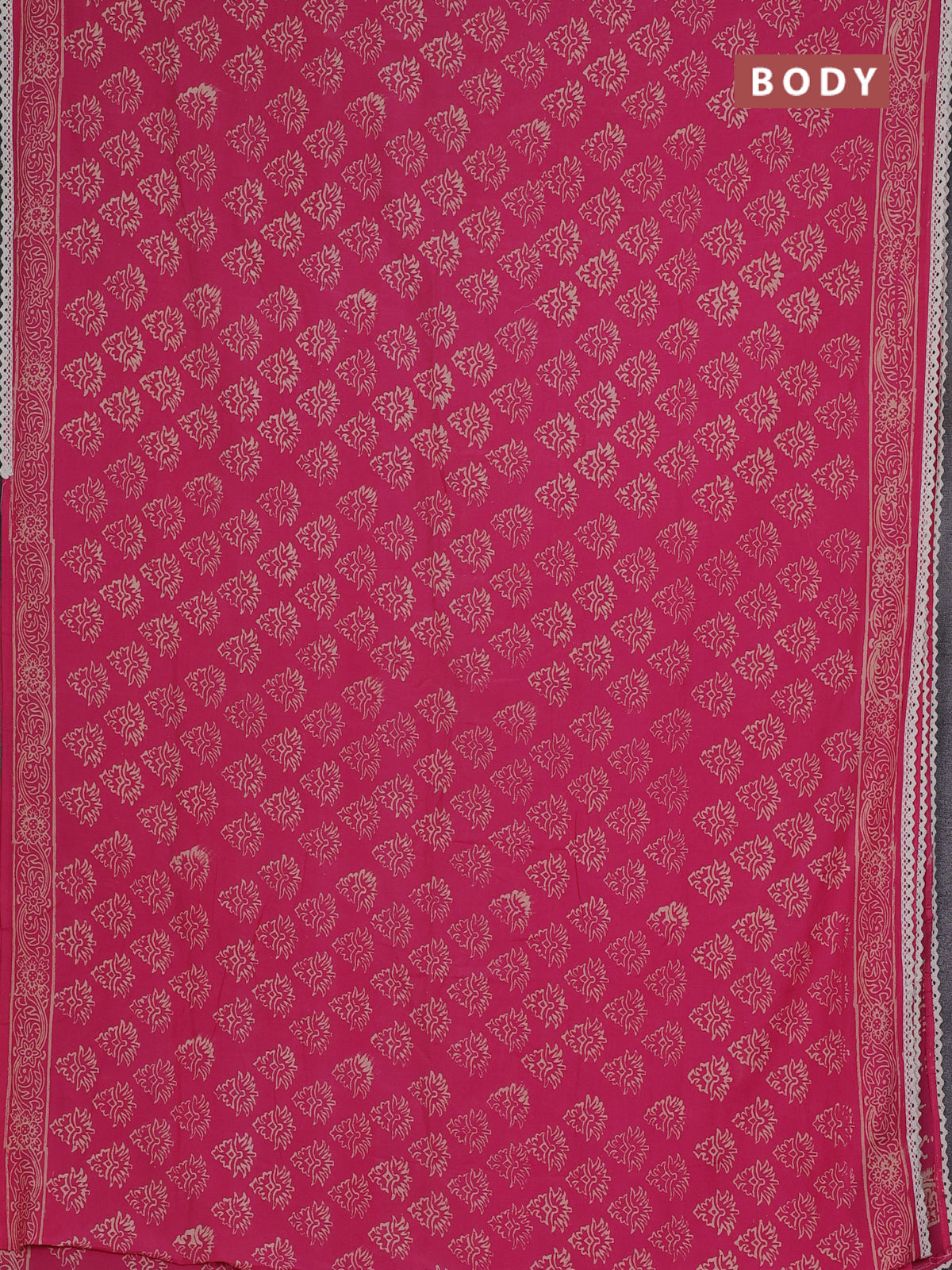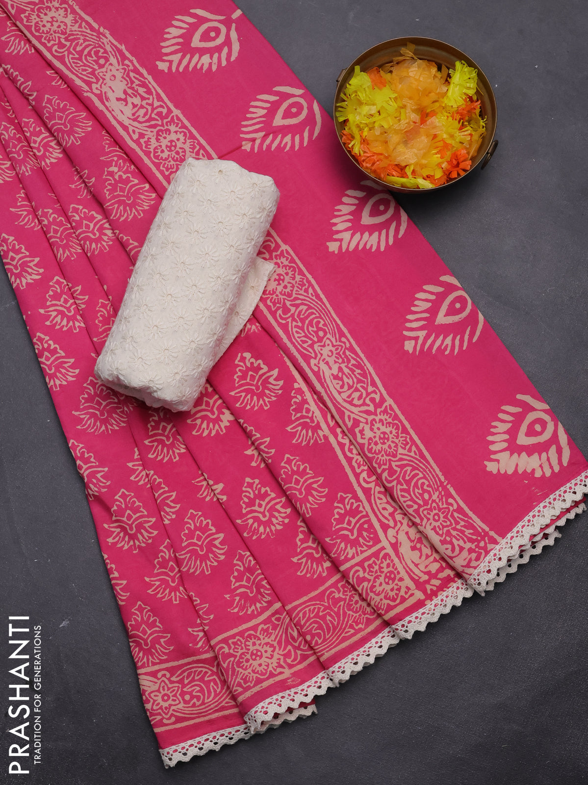 Semi pashmina silk saree pink and cream with allover butta prints and crocia lace work border