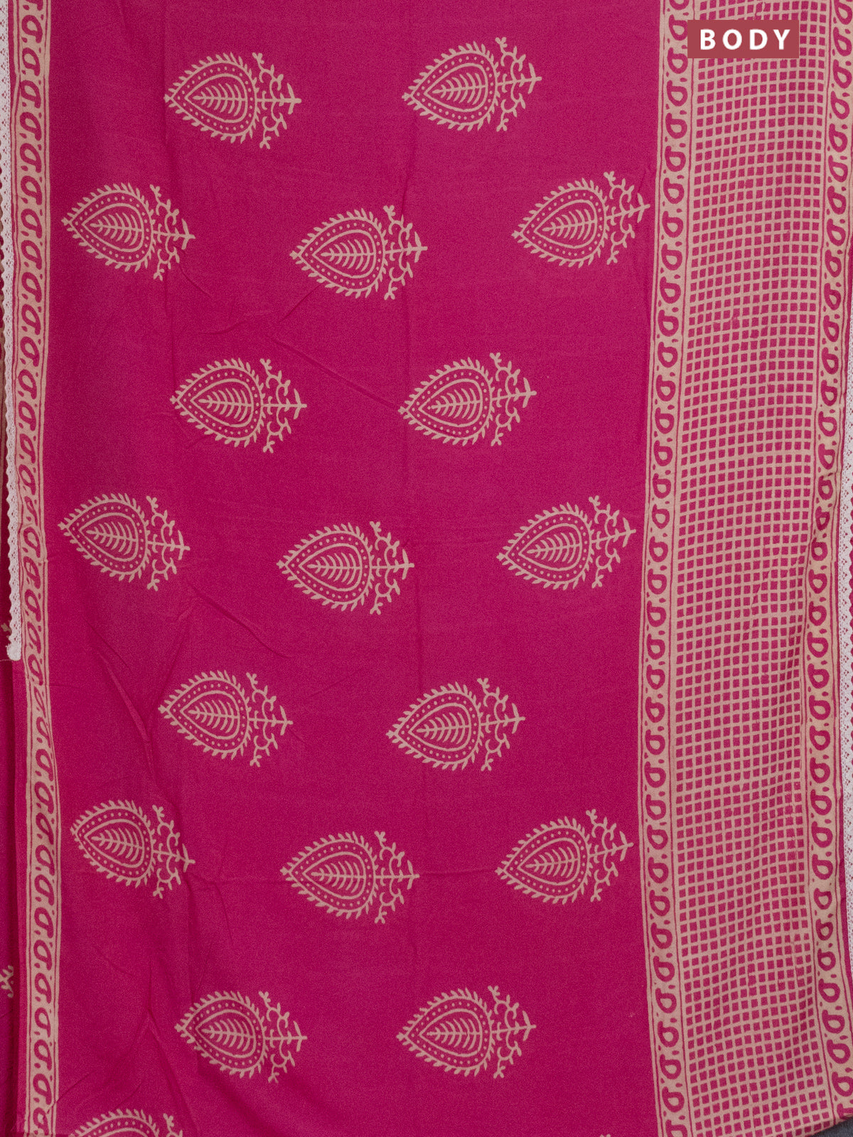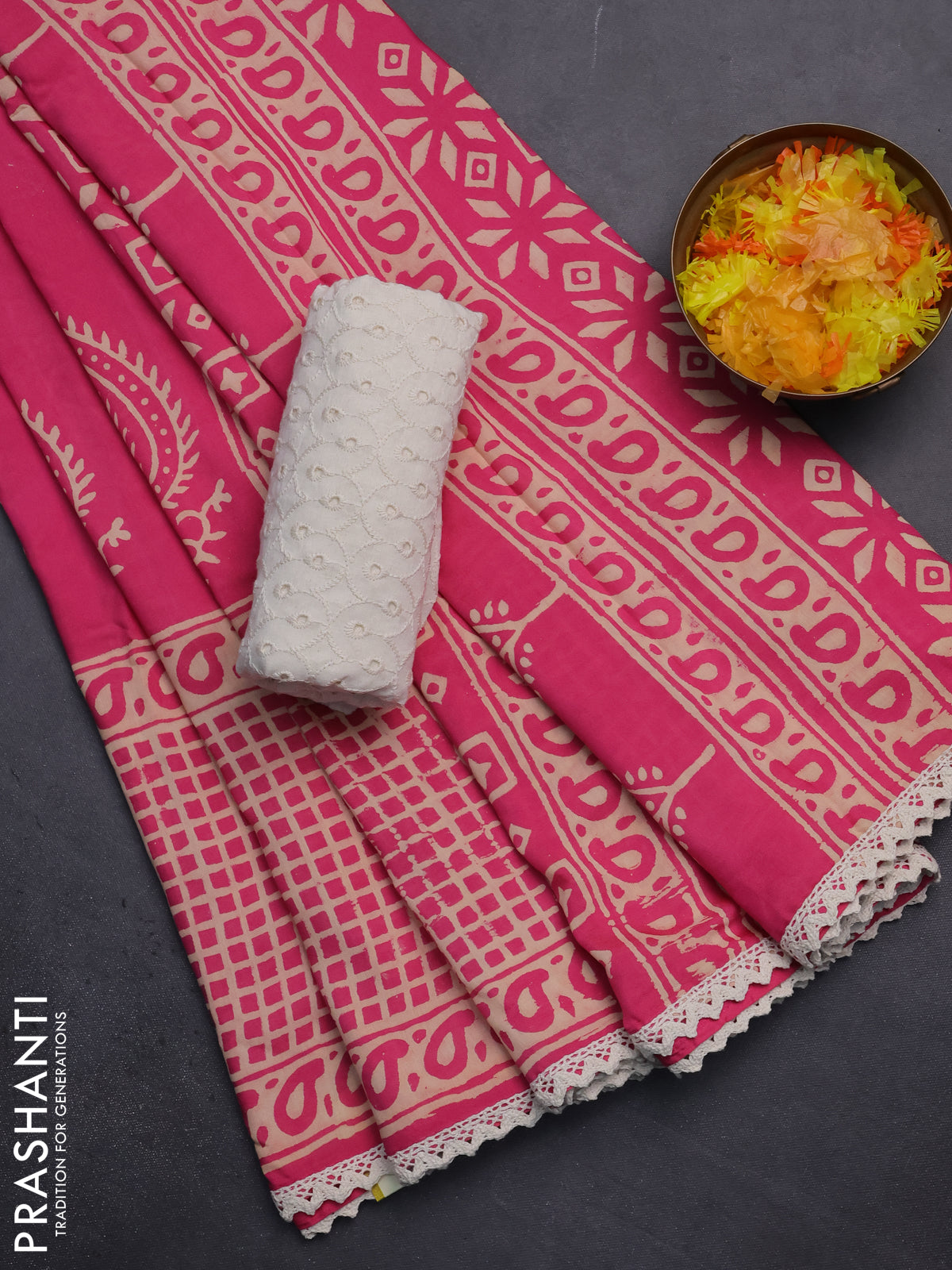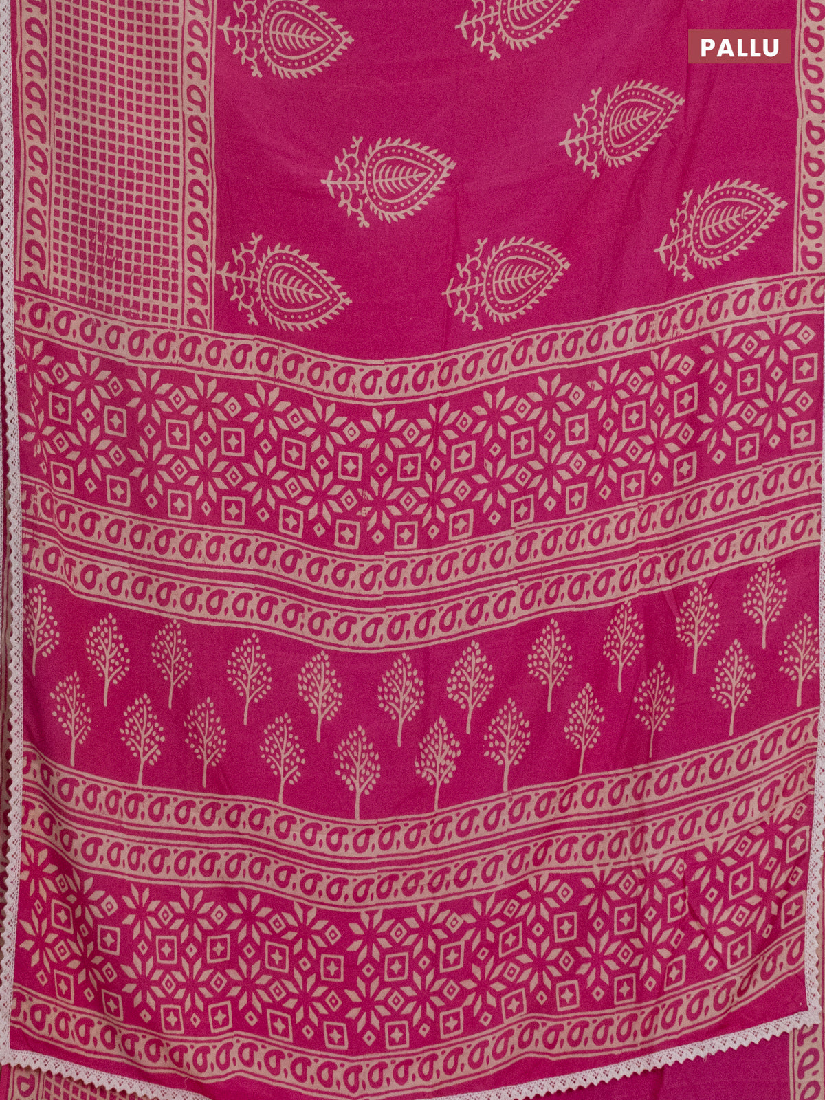 Semi pashmina silk saree pink and cream with butta prints and long printed crocia lace work border