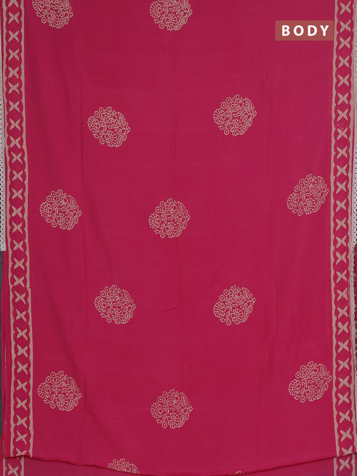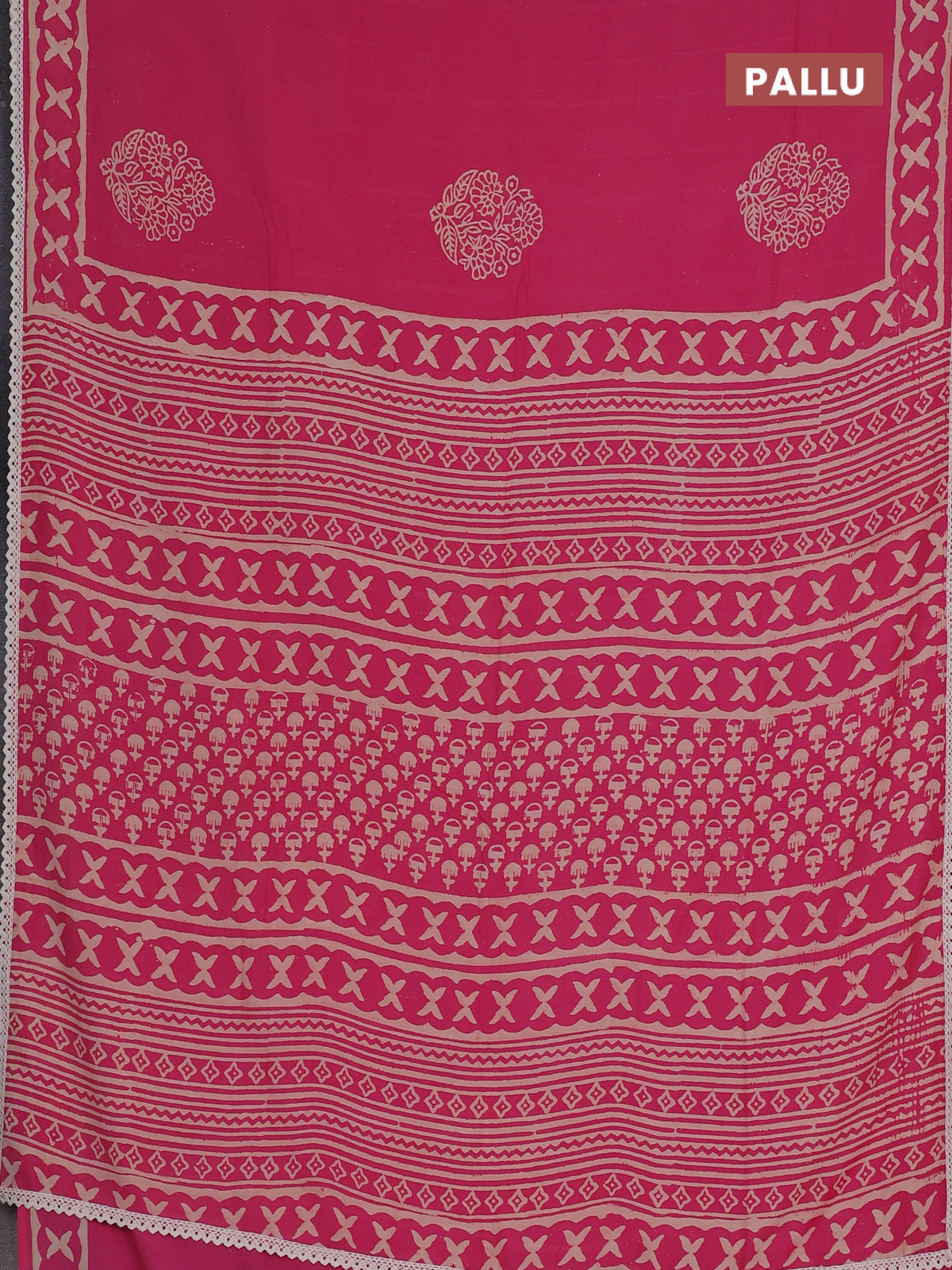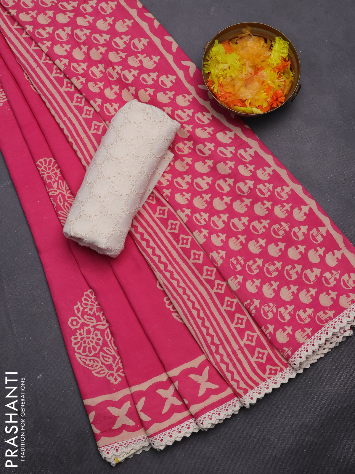 Semi pashmina silk saree pink and cream with floral butta prints and crocia lace work border
