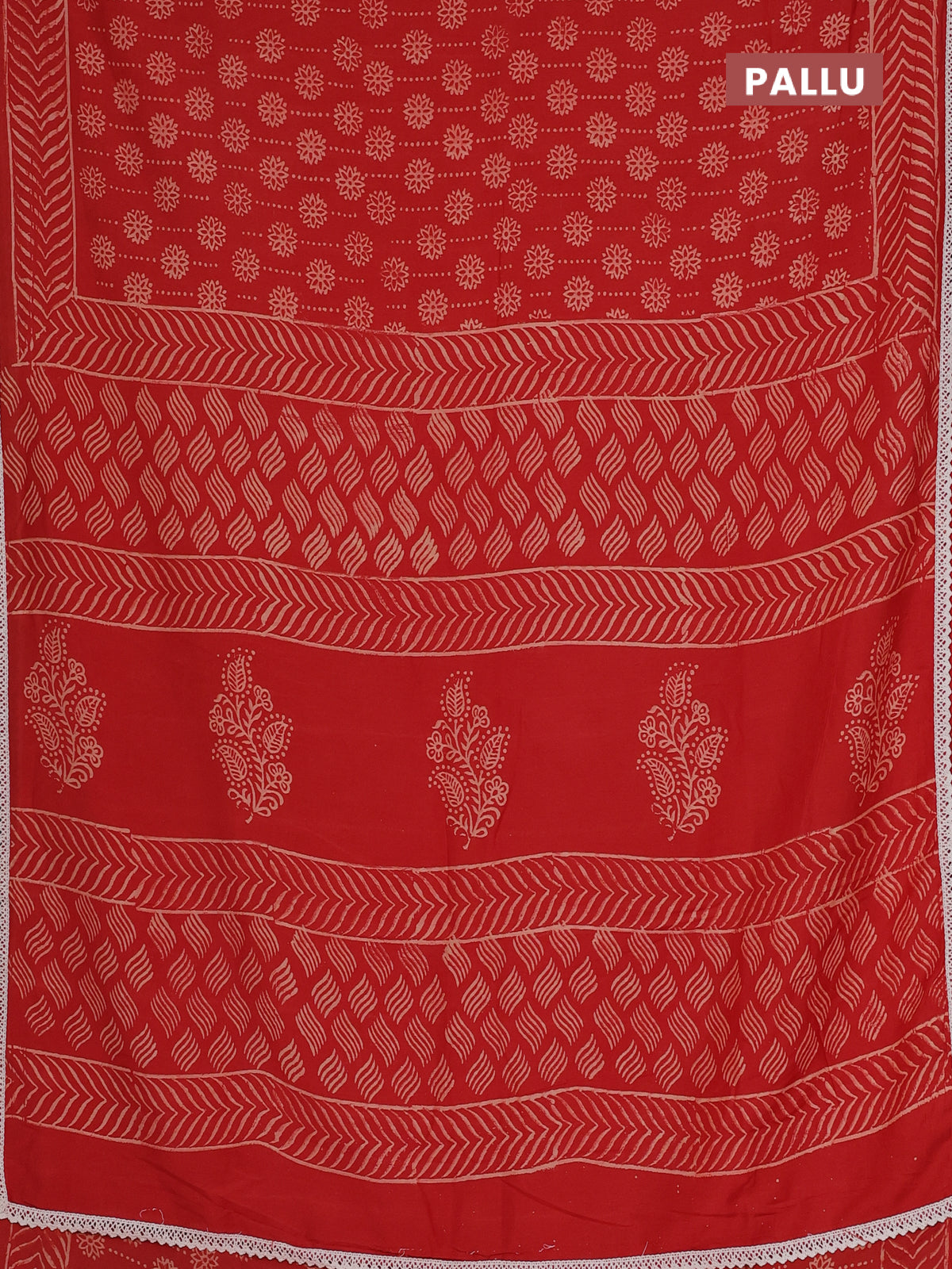 Semi pashmina silk saree red and cream with allover prints and crocia lace work border