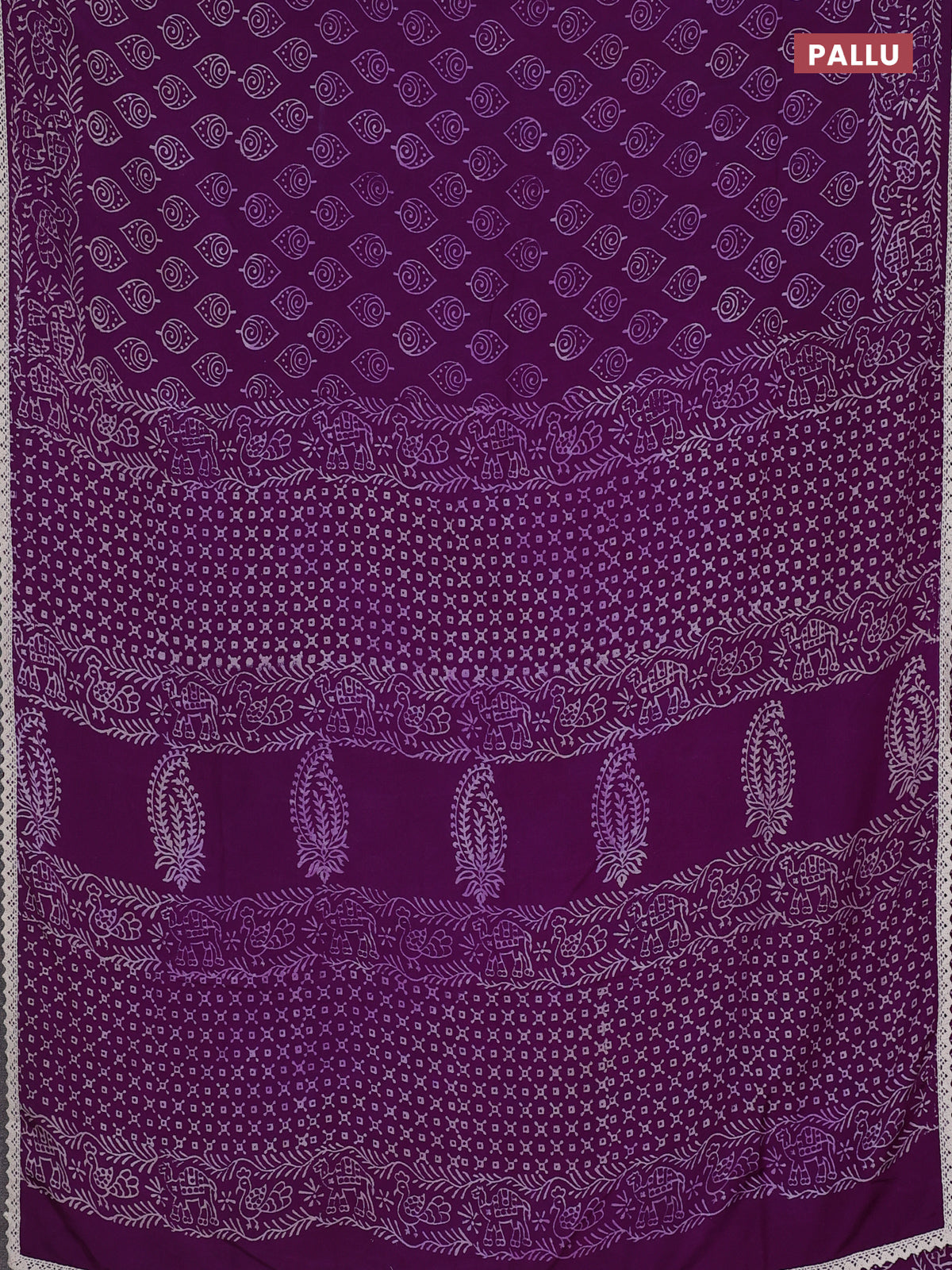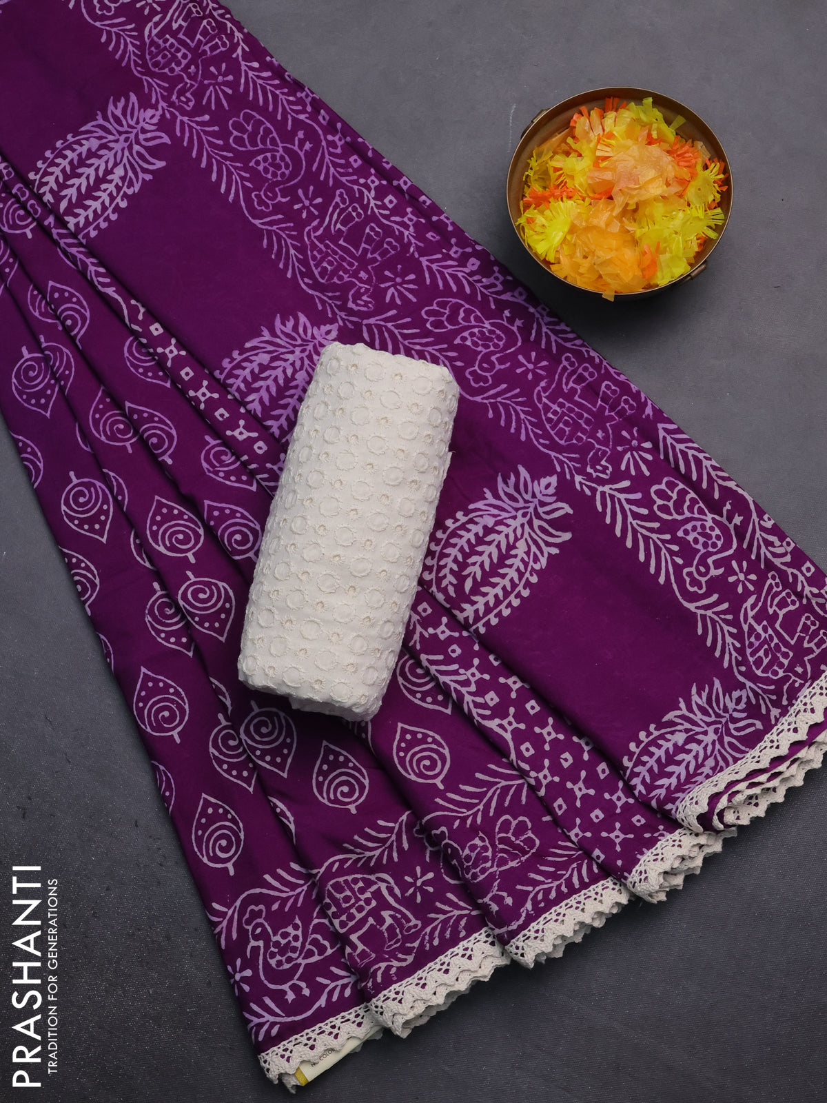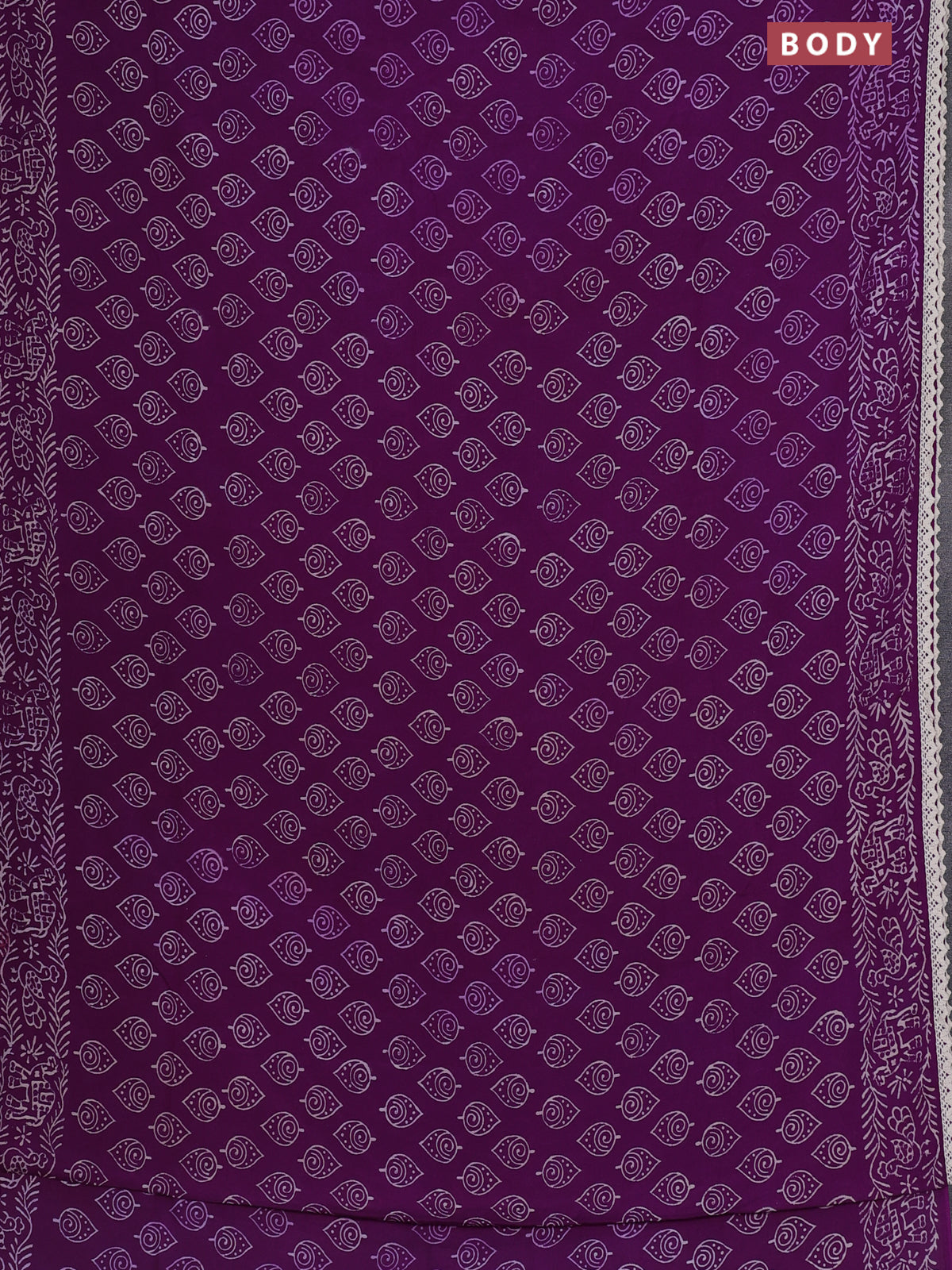 Semi pashmina silk saree violet and cream with allover butta prints and crocia lace work border