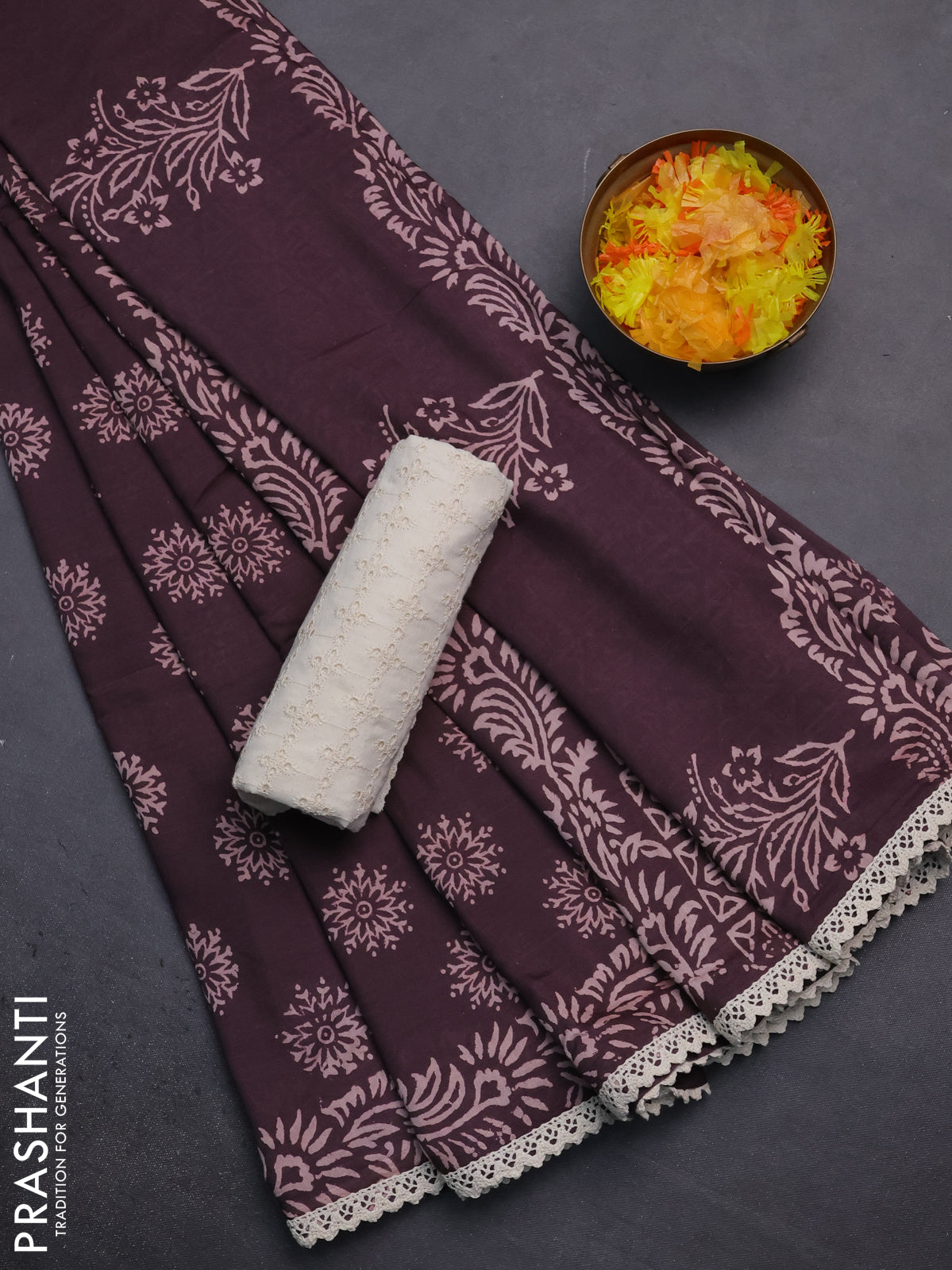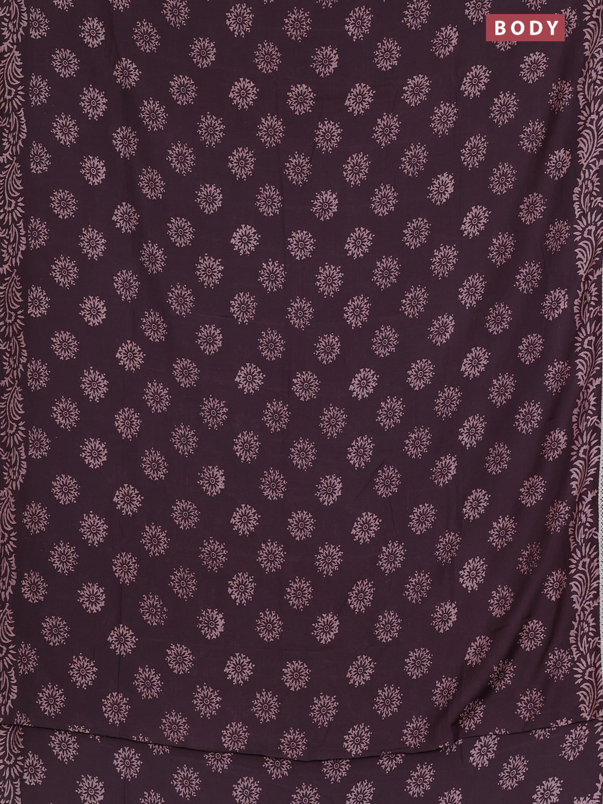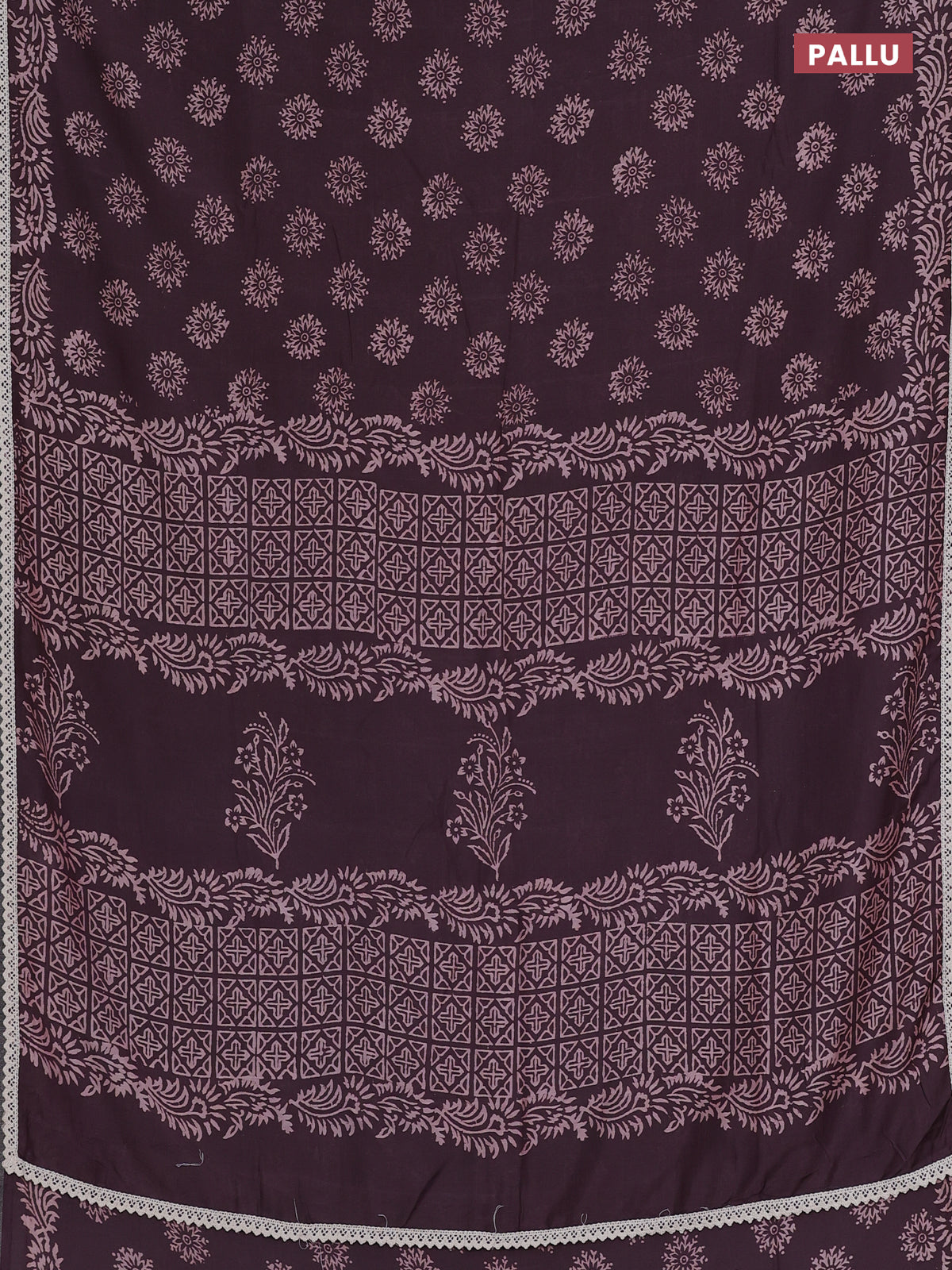 Semi pashmina silk saree wine shade and cream with allover butta prints and crocia lace work border
