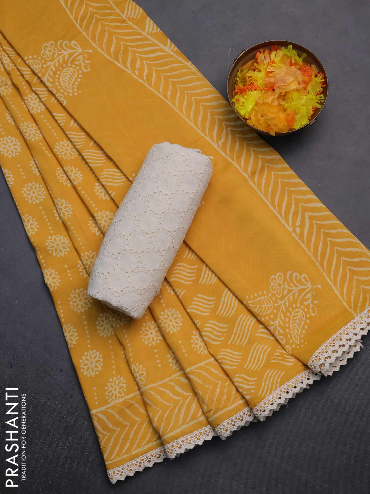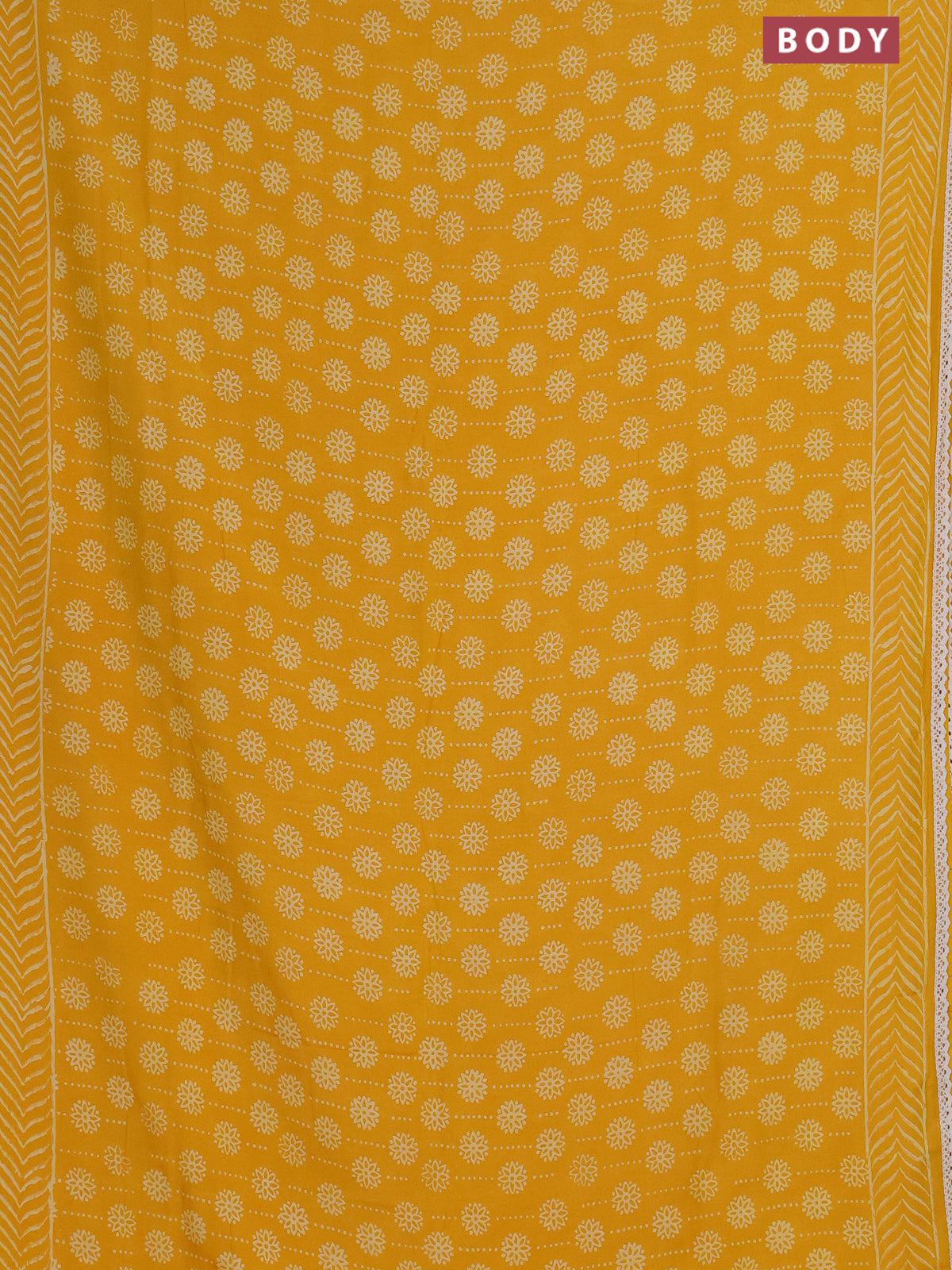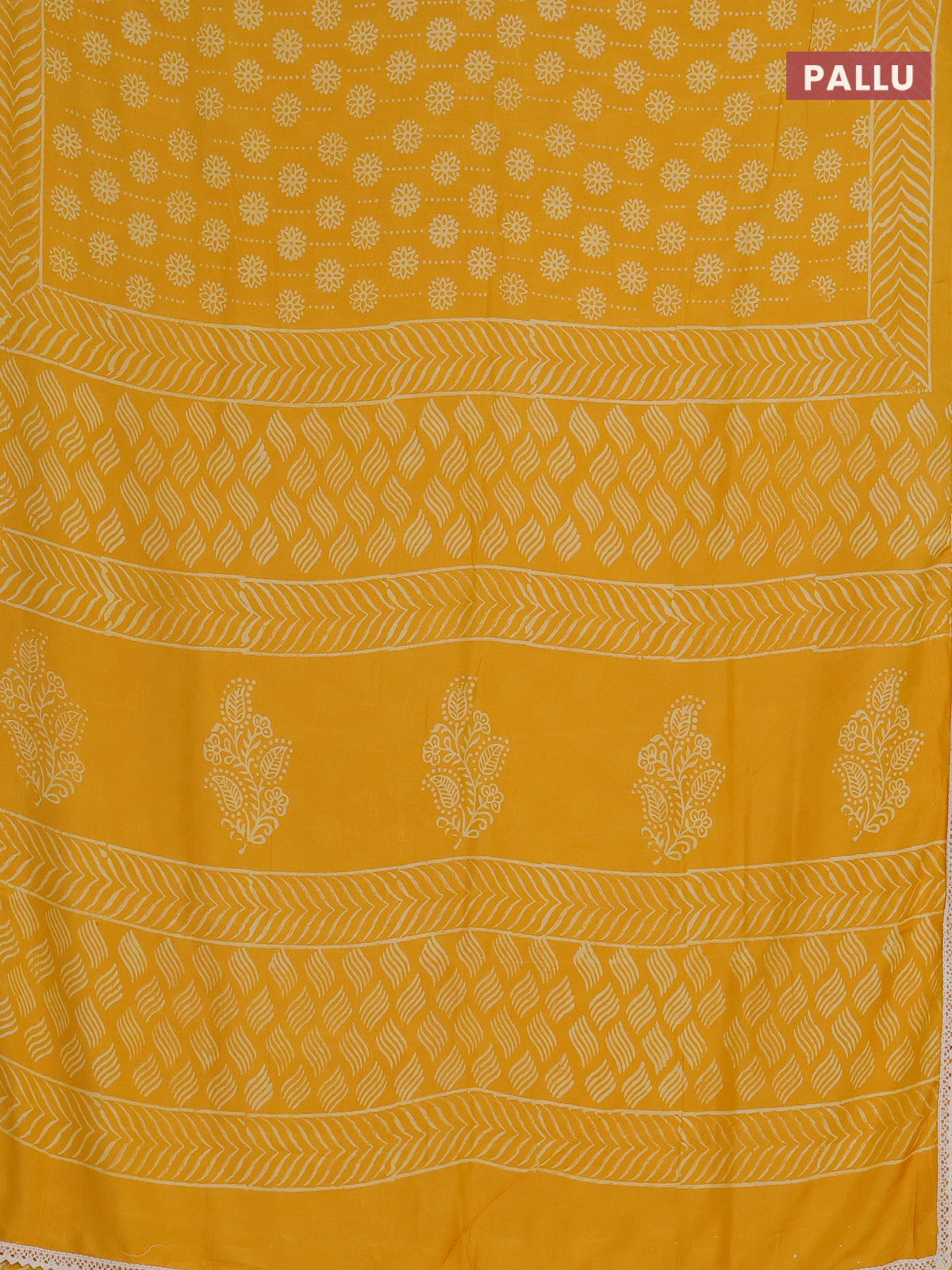 Semi pashmina silk saree yellow and cream with allover prints and crocia lace work border