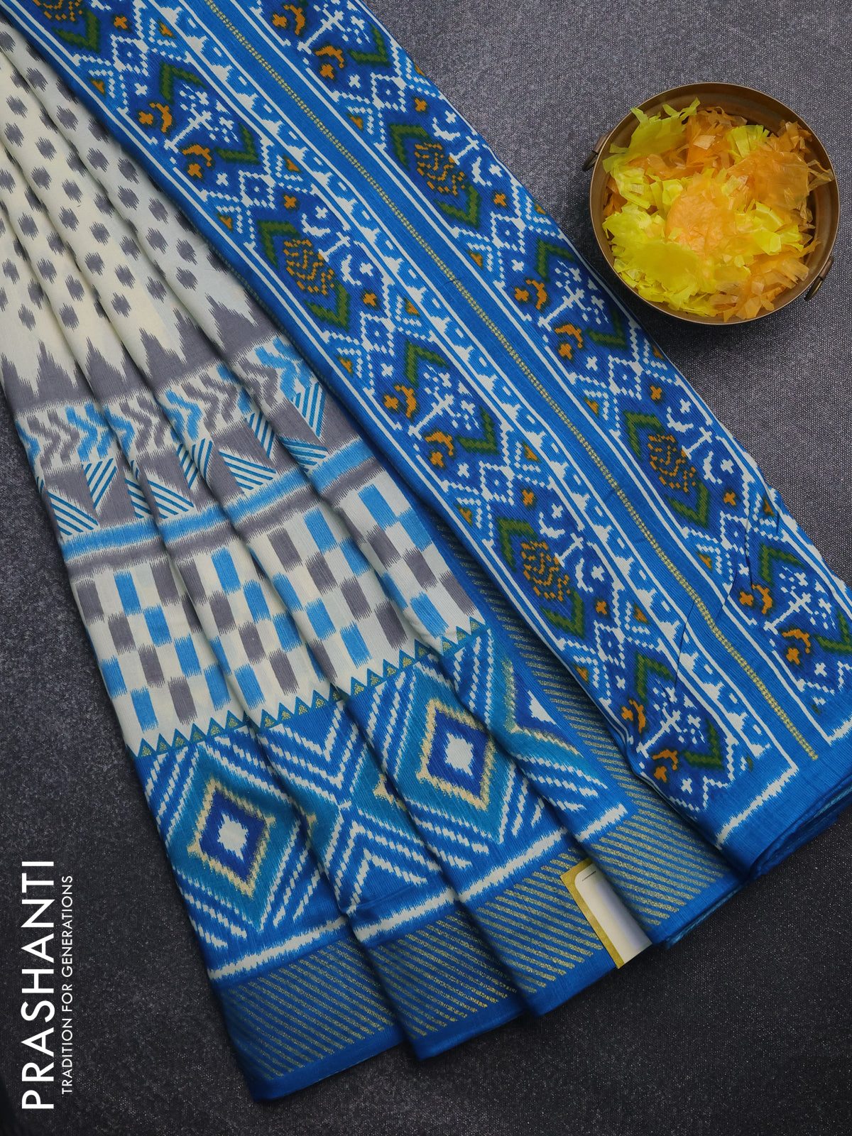 Semi patola saree off white and cs blue with allover ikat weaves and zari woven border