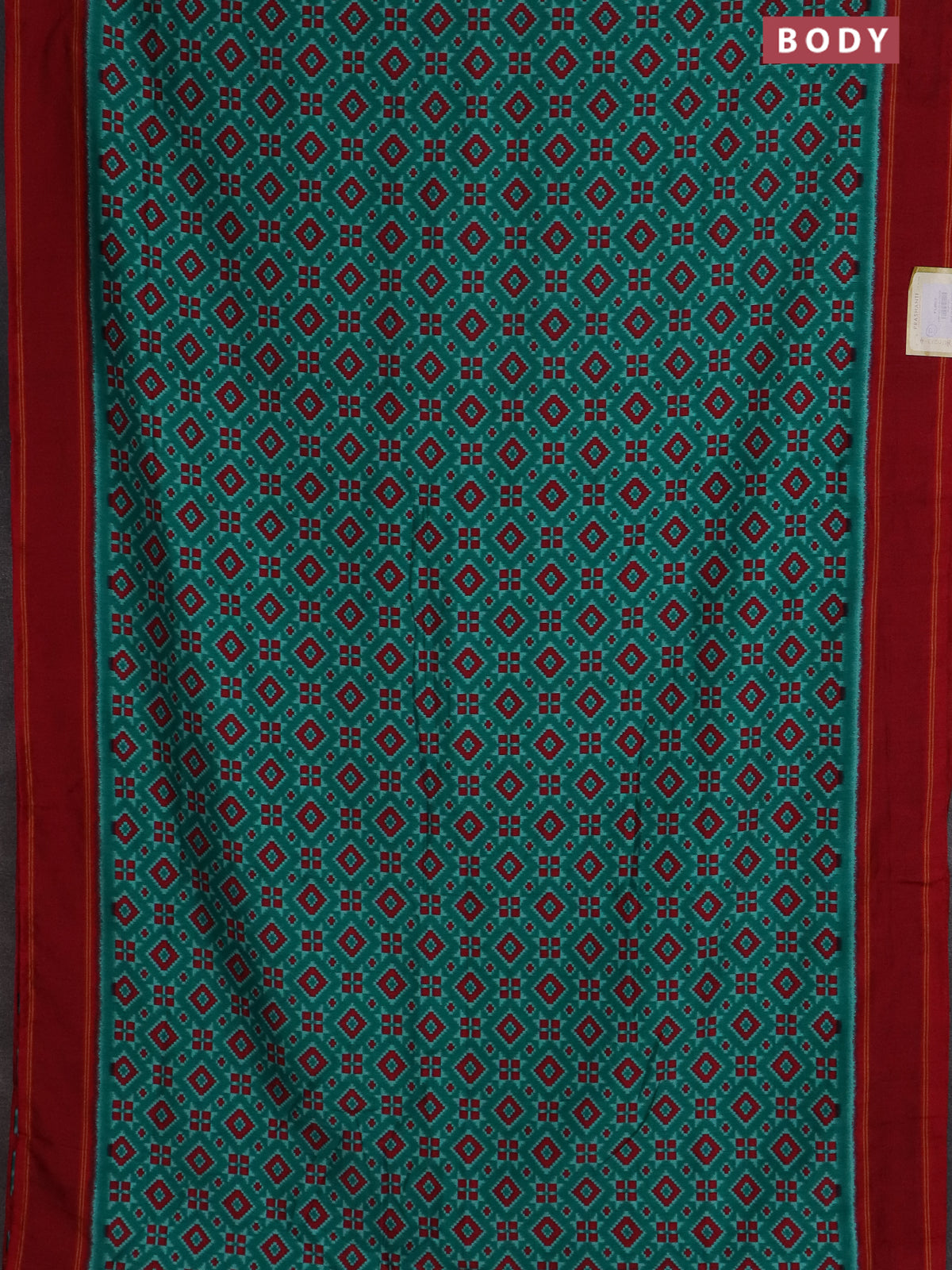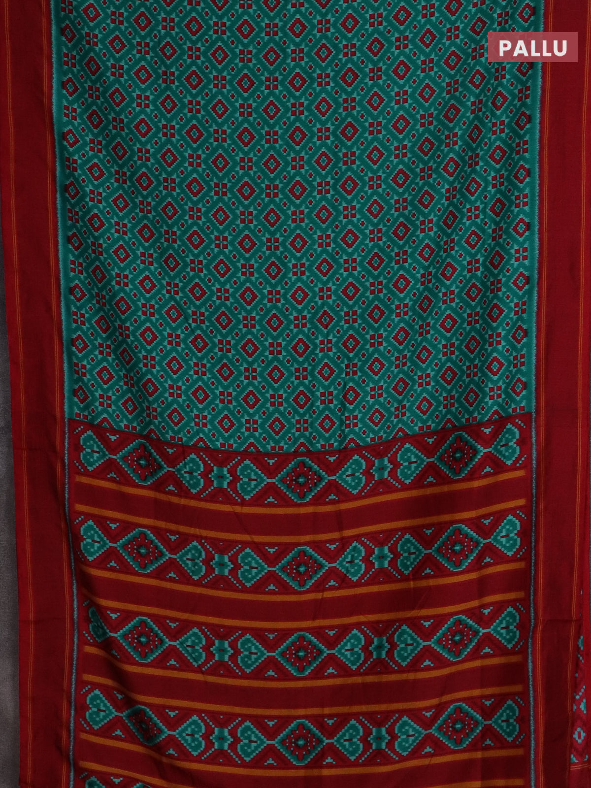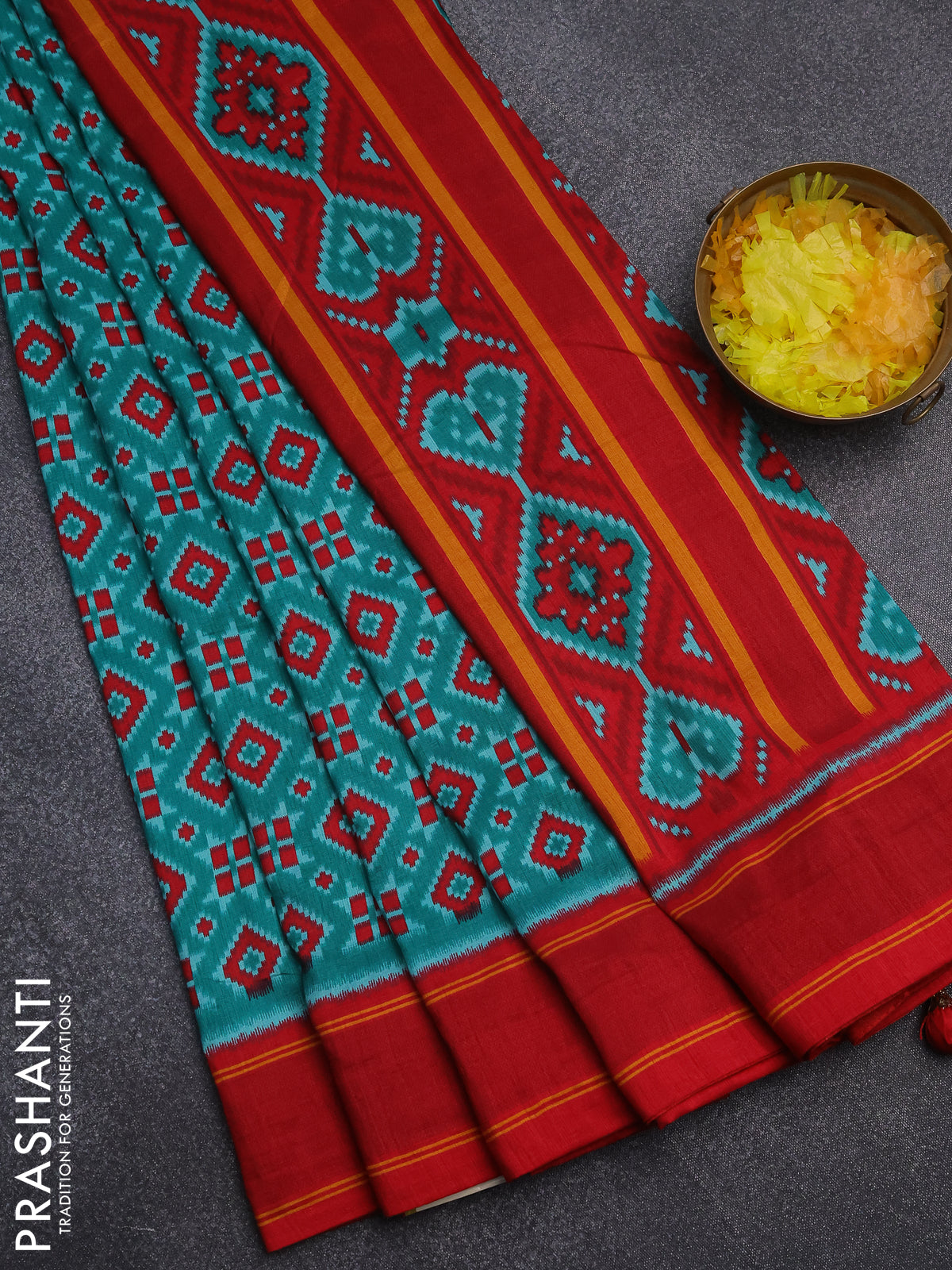 Semi patola saree teal green and red with allover ikat weaves and simple border