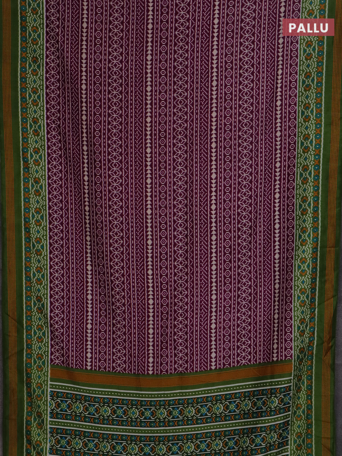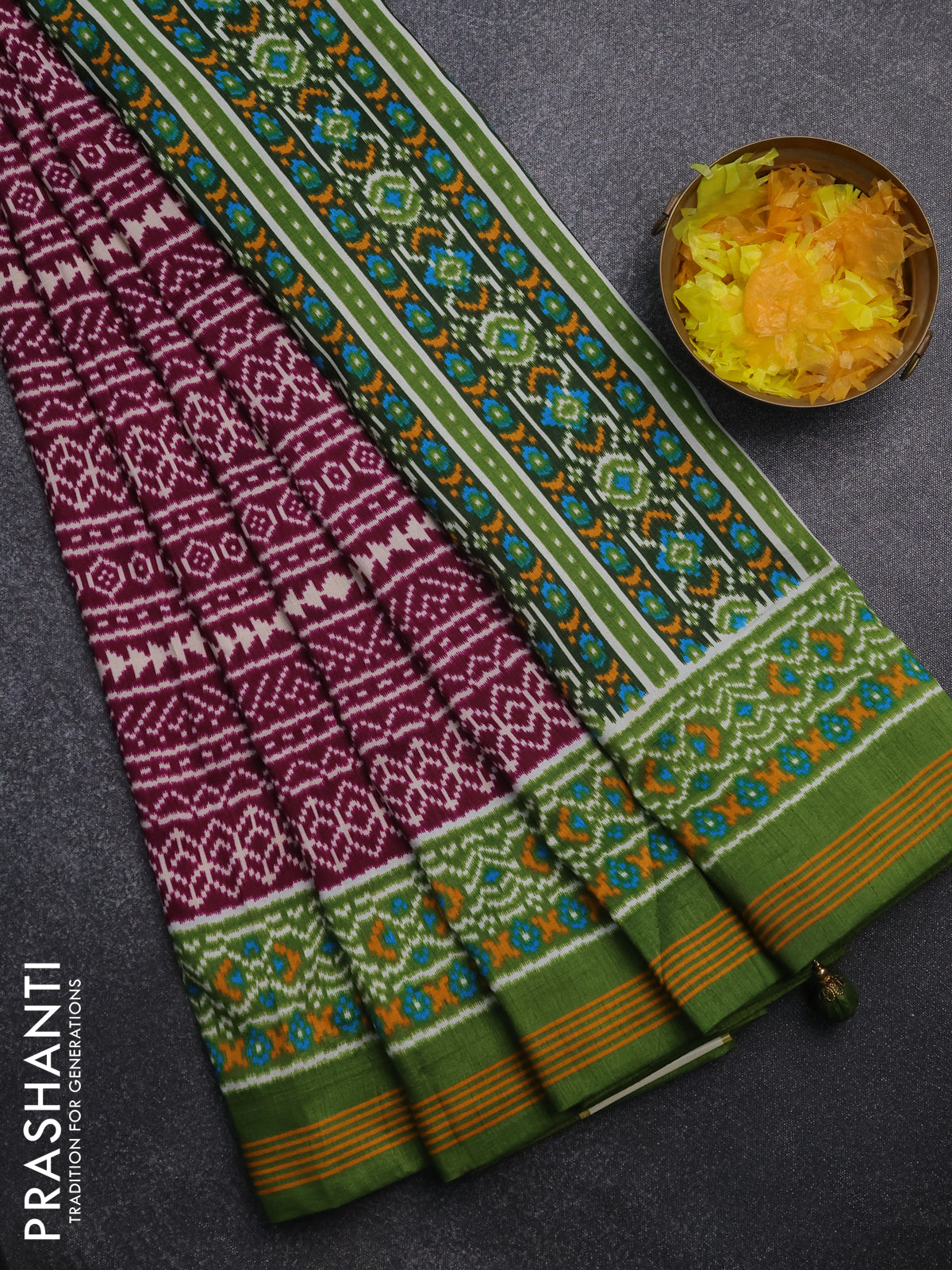 Semi patola saree wine shade and green with allover ikat prints and simple border