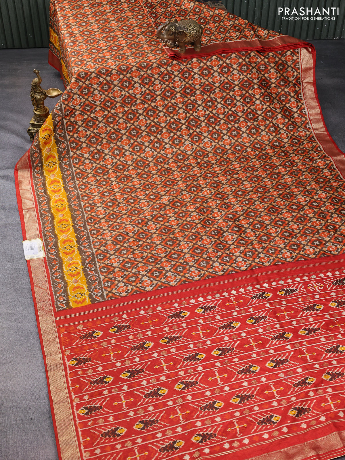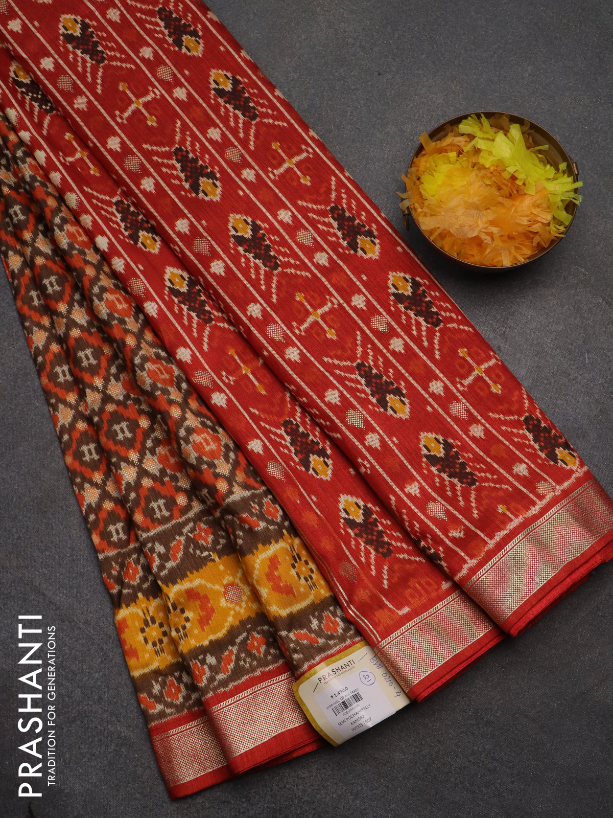 Semi pochampally saree brown shade and red with allover ikat prints and zari woven border