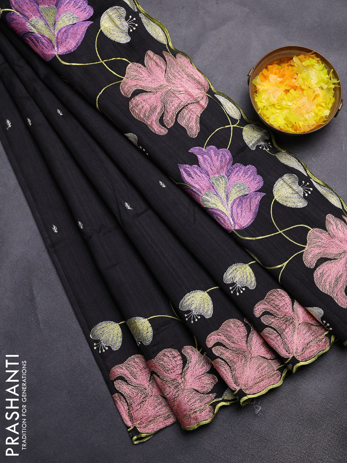 Semi raw silk saree black with embroidery work buttas and floral embroidery border