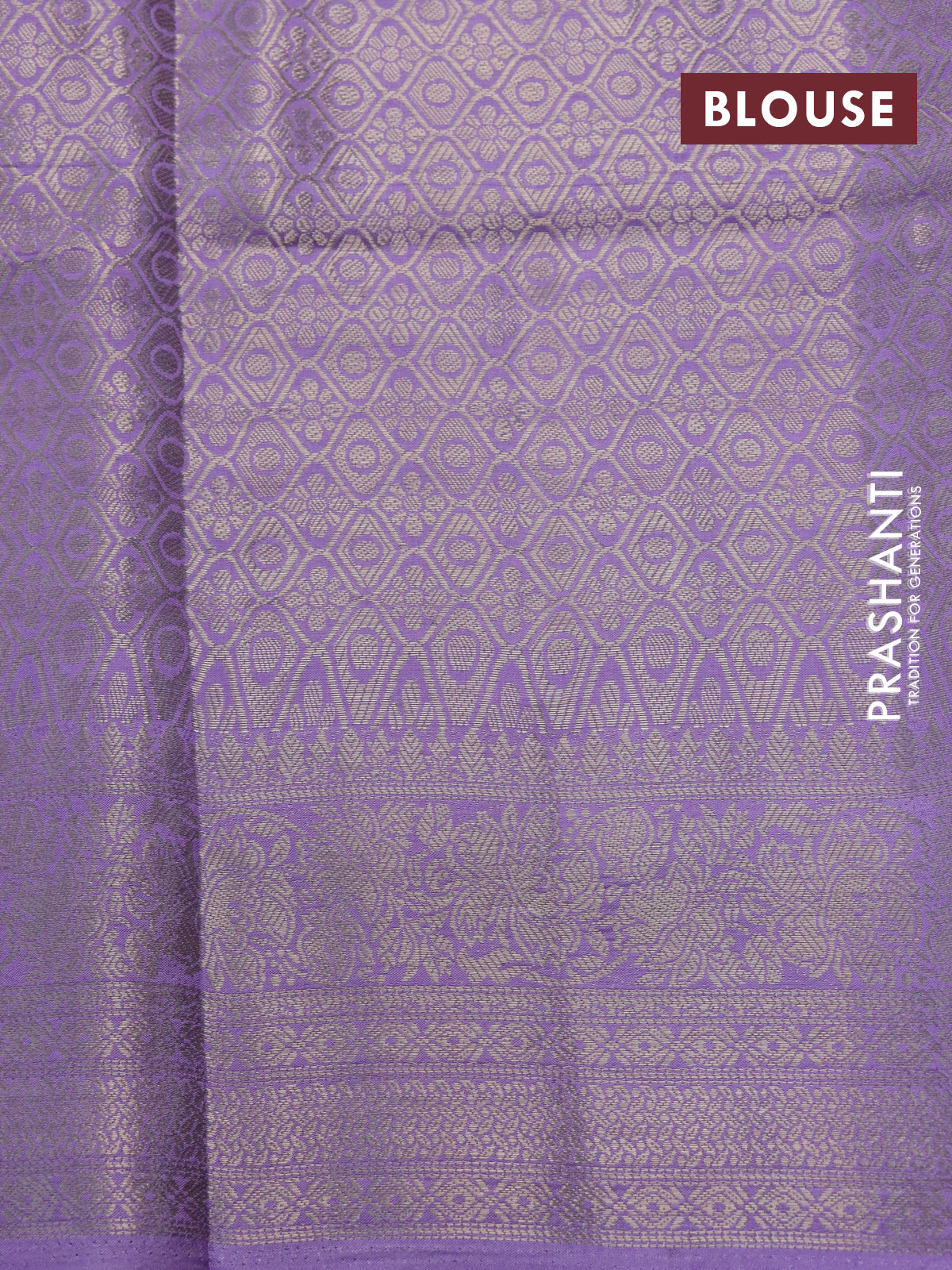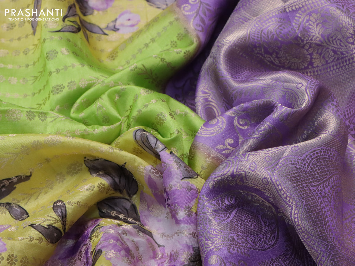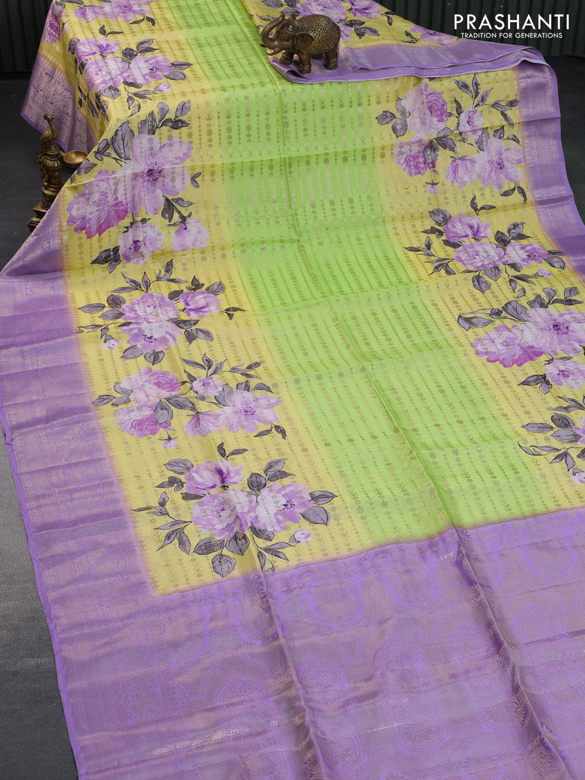 Semi raw silk saree fluorescent green and lavender with allover zari weaves & floral digital prints and zari woven border